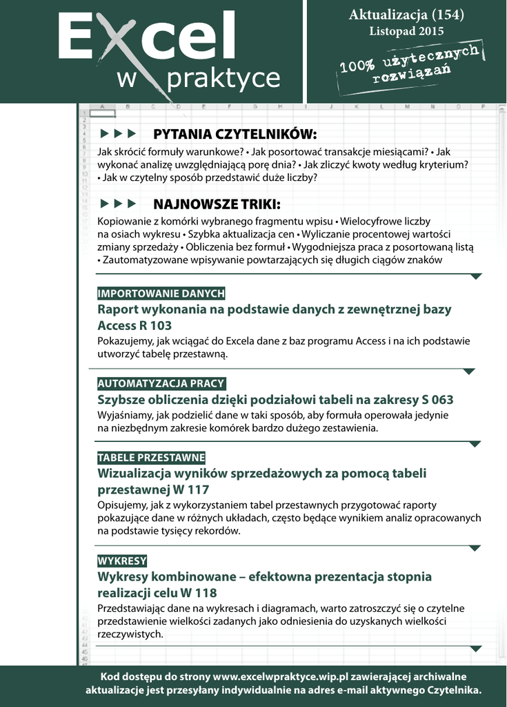 Aktualizacja (154) Listopad 2015 PYTANIA CZYTELNIKÓW: Jak skrócić formuły warunkowe? • Jak posortować transakcje miesiącami? • Jak wykonać analizę uwzględniającą porę dnia? • Jak zliczyć kwoty według kryterium? • Jak w czytelny sposób przedstawić duże liczby? NAJNOWSZE TRIKI: Kopiowanie z komórki wybranego fragmentu wpisu • Wielocyfrowe liczby na osiach wykresu • Szybka aktualizacja cen • Wyliczanie procentowej wartości zmiany sprzedaży • Obliczenia bez formuł • Wygodniejsza praca z posortowaną listą • Zautomatyzowane wpisywanie powtarzających się długich ciągów znaków IMPORTOWANIE DANYCH Raport wykonania na podstawie danych z zewnętrznej bazy Access R 103 Pokazujemy, jak wciągać do Excela dane z baz programu Access i na ich podstawie utworzyć tabelę przestawną. AUTOMATYZACJA PRACY Szybsze obliczenia dzięki podziałowi tabeli na zakresy S 063 Wyjaśniamy, jak podzielić dane w taki sposób, aby formuła operowała jedynie na niezbędnym zakresie komórek bardzo dużego zestawienia. TABELE PRZESTAWNE Wizualizacja wyników sprzedażowych za pomocą tabeli przestawnej W 117 Opisujemy, jak z wykorzystaniem tabel przestawnych przygotować raporty pokazujące dane w różnych układach, często będące wynikiem analiz opracowanych na podstawie tysięcy rekordów. WYKRESY Wykresy kombinowane – efektowna prezentacja stopnia realizacji celu W 118 Przedstawiając dane na wykresach i diagramach, warto zatroszczyć się o czytelne przedstawienie wielkości zadanych jako odniesienia do uzyskanych wielkości rzeczywistych. Kod dostępu do strony www.excelwpraktyce.wip.pl zawierającej archiwalne aktualizacje jest przesyłany indywidualnie na adres e-mail aktywnego Czytelnika. Aktualizacja (154) Listopad 2015 Login: AEX154 Hasło: AEX154_lef Redaktor prowadzący Rafał Janus Wydawca Weronika Wota Opracowanie graficzne okładki Małgorzata Piaskowska Opracowanie graficzne Zbigniew Korzański Koordynator produkcji Mariusz Jezierski Korekta Zespół ISBN 978-83-269-4305-8 Nakład: 1000 egz. Wydawnictwo Wiedza i Praktyka sp. z o.o. 03-918 Warszawa, ul. Łotewska 9a Tel. 22 518 29 29, faks 22 617 60 10, e-mail: [email protected] NIP: 526-19-92-256 Numer KRS: 0000098264 – Sąd Rejonowy dla m.st. Warszawy, Sąd Gospodarczy XIII Wydział Gospodarczy Rejestrowy. Wysokość kapitału zakładowego: 200.000 zł Skład i łamanie: Raster studio, Norbert Bogajczyk Miller Druk sp. z o.o., 03-301 Warszawa, ul. Jagiellońska 82, tel.: 22 614 17 67 Copyright © by Wydawnictwo Wiedza i Praktyka sp. z o.o. Warszawa 2015 Poradnik „Excel w praktyce” wraz z przysługującymi Czytelnikom innymi elementami dostępnymi w subskrypcji (e-letter, strona WWW i inne) chronione są prawem autorskim. Przedruk materiałów opublikowanych w poradniku „Excel w praktyce” oraz w innych dostępnych elementach subskrypcji – bez zgody wydawcy – jest zabroniony. Zakaz nie dotyczy cytowania publikacji z powołaniem się na źródło. Poradnik „Excel w praktyce” został przygotowany z zachowaniem najwyższej staranności i wykorzystaniem wysokich kwalifikacji, wiedzy i doświadczenia autorów oraz konsultantów. Zaproponowane w publikacji „Excel w praktyce” oraz w innych dostępnych elementach subskrypcji wskazówki, porady i interpretacje nie mają charakteru porady prawnej. Ich zastosowanie w konkretnym przypadku może wymagać dodatkowych, pogłębionych konsultacji. Publikowane rozwiązania nie mogą być traktowane jako oficjalne stanowisko organów i urzędów państwowych. W związku z powyższym redakcja nie może ponosić odpowiedzialności prawnej za zastosowanie zawartych w publikacji „Excel w praktyce” lub w innych dostępnych elementach subskrypcji wskazówek, przykładów, informacji itp. do konkretnych przypadków. Wydawca nie odpowiada za treść zamieszczonej reklamy; ma prawo odmówić zamieszczenia reklamy, jeżeli jej treść lub forma są sprzeczne z linią programową bądź charakterem publikacji oraz interesem Wydawnictwa Wiedza i Praktyka. 2 Czerwiec 2007 Wiedza i Praktyka Drodzy Czytelnicy! Często dane, z których należy stworzyć raporty czy zestawienia w formie tabeli przestawnej, są umieszczone w zewnętrznych bazach programu Access. Istnieje możliwość utworzenia tabeli przestawnej z zewnętrznego źródła danych, jakim jest baza w tym programie. W artykule „Raport wykonania na podstawie danych z zewnętrznej bazy Access” przedstawiamy, jak utworzyć tabelę przestawną pokazująca wykonanie kosztów względem budżetu z możliwością wyboru miesiąca i miejsca powstawania kosztów (komórki organizacyjnej). Opisujemy połączenie tabeli przestawnej z bazą danych oraz budowę tabeli przestawnej. Jeśli lista transakcji składa się z wielu tysięcy pozycji, to jej przeanalizowanie nie jest prostym zadaniem. Nawet przefiltrowanie danych niewiele pomoże, jeśli skróci listę do kilkuset wierszy. Jeżeli w ramach takiego zakresu arkusza zastosujemy wielopiętrowe obliczenia tablicowe, mogą być przeliczane przez Excela przez dłuższy czas. Prędzej czy później długie wczytywanie wyników formuł stanie się uciążliwe. W artykule „Szybsze obliczenia dzięki podziałowi tabeli na zakresy” pokazujemy, jak podzielić dane w taki sposób, aby formuła operowała jedynie na niezbędnym zakresie komórek, a nie całej liście. Często użytkowników nie stać na zakup drogich programów Business Intelligence przeznaczonych do analizy dużych zbiorów danych w różnych układach i o odmiennym poziomie szczegółowości. Jednak od pracowników zajmujących się analizą wymagane są zestawienia i raporty pokazujące dane w różnych układach, często będące wynikiem analiz opracowanych na podstawie tysięcy rekordów. Z tym wyzwaniem można poradzić sobie z pomocą Excela, a jak się do tego zabrać, wyjaśniamy w artykule „Wizualizacja wyników sprzedażowych za pomocą tabeli przestawnej”. Niemal każda anali