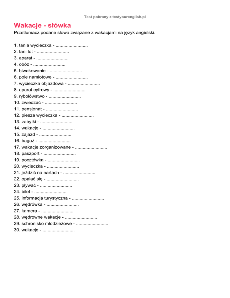 Test pobrany z testyourenglish.pl Wakacje - słówka Przetłumacz podane słowa związane z wakacjami na język angielski. 1. tania wycieczka - ......................... 2. tani lot - ......................... 3. aparat - ......................... 4. obóz - ......................... 5. biwakowanie - ......................... 6. pole namiotowe - ......................... 7. wycieczka objazdowa - ......................... 8. aparat cyfrowy - ......................... 9. rybołówstwo - ......................... 10. zwiedzać - ......................... 11. pensjonat - ......................... 12. piesza wycieczka - ......................... 13. zabytki - ......................... 14. wakacje - ......................... 15. zajazd - ......................... 16. bagaż - ......................... 17. wakacje zorganizowane - ......................... 18. paszport - ......................... 19. pocztówka - ......................... 20. wycieczka - ......................... 21. jeździć na nartach - ......................... 22. opalać się - ......................... 23. pływać - ......................... 24. bilet - ......................... 25. informacja turystyczna - ......................... 26. wędrówka - ......................... 27. kamera - ......................... 28. wędrowne wakacje - ......................... 29. schronisko młodzieżowe - ......................... 30. wakacje - .........................