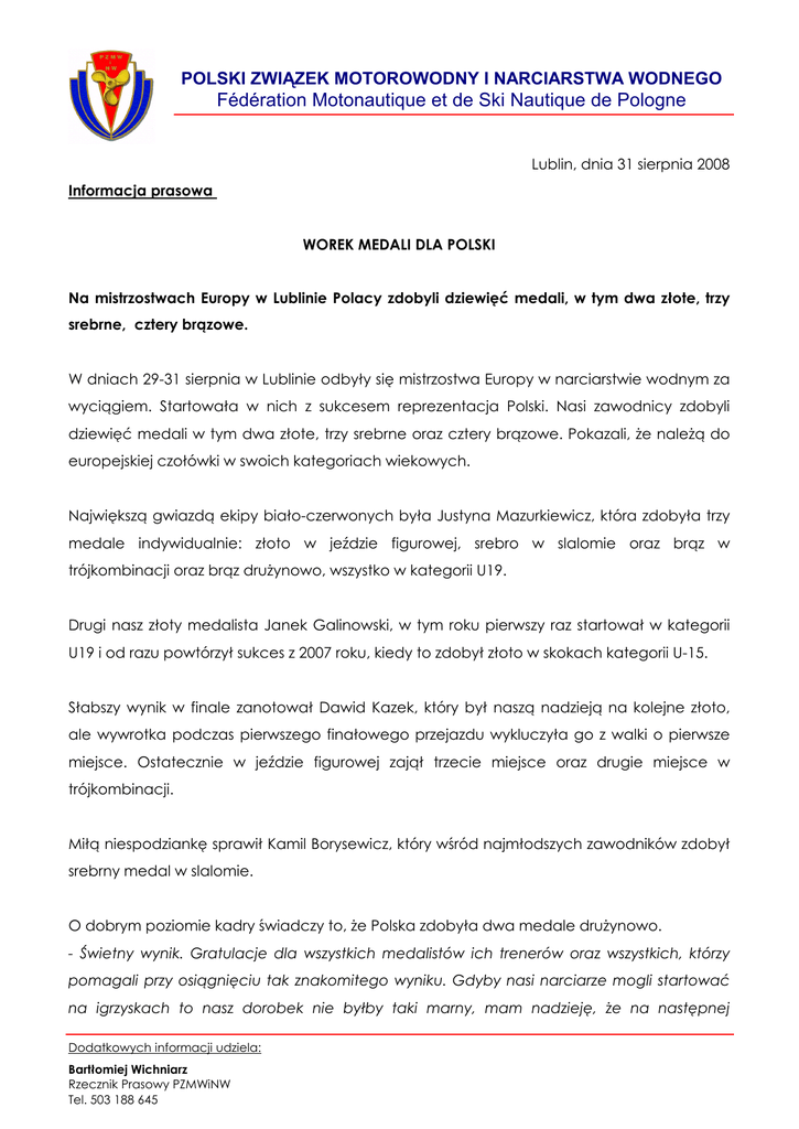 POLSKI ZWIĄZEK MOTOROWODNY I NARCIARSTWA WODNEGO Fédération Motonautique et de Ski Nautique de Pologne Lublin, dnia 31 sierpnia 2008 Informacja prasowa WOREK MEDALI DLA POLSKI Na mistrzostwach Europy w Lublinie Polacy zdobyli dziewięć medali, w tym dwa złote, trzy srebrne, cztery brązowe. W dniach 29-31 sierpnia w Lublinie odbyły się mistrzostwa Europy w narciarstwie wodnym za wyciągiem. Startowała w nich z sukcesem reprezentacja Polski. Nasi zawodnicy zdobyli dziewięć medali w tym dwa złote, trzy srebrne oraz cztery brązowe. Pokazali, Ŝe naleŜą do europejskiej czołówki w swoich kategoriach wiekowych. Największą gwiazdą ekipy biało-czerwonych była Justyna Mazurkiewicz, która zdobyła trzy medale indywidualnie: złoto w jeździe figurowej, srebro w slalomie oraz brąz w trójkombinacji oraz brąz druŜynowo, wszystko w kategorii U19. Drugi nasz złoty medalista Janek Galinowski, w tym roku pierwszy raz startował w kategorii U19 i od razu powtórzył sukces z 2007 roku, kiedy to zdobył złoto w skokach kategorii U-15. Słabszy wynik w finale zanotował Dawid Kazek, który był naszą nadzieją na kolejne złoto, ale wywrotka podczas pierwszego finałowego przejazdu wykluczyła go z walki o pierwsze miejsce. Ostatecznie w jeździe figurowej zajął trzecie miejsce oraz drugie miejsce w trójkombinacji. Miłą niespodziankę sprawił Kamil Borysewicz, który wśród najmłodszych zawodników zdobył srebrny medal w slalomie. O dobrym poziomie kadry świadczy to, Ŝe Polska zdobyła dwa medale druŜynowo. - Świetny wynik. Gratulacje dla wszystkich medalistów ich trenerów oraz wszystkich, którzy pomagali przy osiągnięciu tak znakomitego wyniku. Gdyby nasi narciarze mogli startować na igrzyskach to nasz dorobek nie byłby taki marny, mam nadzieję, Ŝe na następnej Dodatkowych informacji udziela: Bartłomiej Wichniarz Rzecznik Prasowy PZMWiNW Tel. 503 188 645 POLSKI ZWIĄZEK MOTOROWODNY I NARCIARSTWA WODNEGO Fédération Motonautique et de Ski Nautique de Pologne olimpiadzie narciarstwo wodne będzie dyscypliną olimpijską – podsumował wyniki Paweł Szabelewski, Sekretarz Generalny Polskiego Związku Motorowodnego i Narciarstwa Wodnego. Wszyscy medaliści: Justyna Mazurkiewicz – złoto w jeździe figurowej U-19 Jan Galinowski – złoto w skokach U-19 Justyna Mazurkiewicz – srebro slalom U-19 Kamil Borysewicz – srebro slalom U-15 Dawid Kazek – srebro trójkombinacja U-19 Justyna Mazurkiewicz – brąz trójkombinacja U-19 Dawid Kazek – brąz jazda figurowa U-19 DruŜyna U-19 – brąz DruŜyna U-15 – brąz Wyniki slalom: Dziewczęta U-15: 1. Patricia Matisova (Słowacja) 2. Hanna Stratslova (Białoruś) 3. Katsiaryna Kisialiova (Białoruś) 6. Aleksandra Kuźbiel (MOS Augustów) 7. Małgorzata Rutkowska (Sparta Augustów) Chłopcy U-15: 1. Alexander Vasko (Słowacja) 2. Kamil Borysewicz (Sparta Augustów) 3. Marius Schimanski (Niemcy) 10. Paweł Świętek (Zefir Bytom) 11. Erwin Zawadzki (MOS Augustów) Dziewczęta U-19: 1. Iryna Dymant (Białoruś) 2. Justyna Mazurkiewicz (Zefir Bytom) 3. Bianca Schall (Austria) Chłopcy U-19: 1. Solomon Fletcher (Wielka Brytania) 2. Nadav Ativ (Izrael) 3. Richard Marcincin (Słowacja) 14. Dawid Kazek (Zefir Bytom) Dodatkowych informacji udziela: Bartłomiej Wichniarz Rzecznik Prasowy PZMWiNW Tel. 503 188 645 POLSKI ZWIĄZEK MOTOROWODNY I NARCIARSTWA WODNEGO Fédération Motonautique et de Ski Nautique de Pologne 16. Piotr Hugues (AZS Warszawa) 17. Maciej Milewski (MOS Augustów) Jazda figurowa: Dziewczęta U-15 1. Katsiaryna Kisialiova (Białoruś) – 6510 pkt. 2. Hanna Stratslova (Białoruś) – 5420 pkt. 3. Anna Sokolova (Rosja) – 4850 pkt. 7. Aleksandra Kuźbiel (MOS Augustów) – 560 pkt. 8. Małgorzata Rutkowska (Sparta Augustów) – 100 pkt. Chłopcy U-15 1. Aliaksandr Isayeu (Białoruś) – 9380pkt. 2. Ilya Labkovich (Białoruś) – 7710 pkt. 3. Alexander Vasko (Słowacja) – 6070 pkt. 7. Paweł Świętek (Zefir Bytom) – 3280 pkt. 8. Kamil Borysewicz (Sparta Augustów) – 2610 pkt. 10. Erwin Zawadzki (MOS Augustów) – 900 pkt. Dziewczęta U-19 1. Justyna Mazurkiewicz (Zefir Bytom) – 7000 pkt. 2. Petra Kocurowa (Czechy) – 6980 pkt. 3. Aliaksandra Rabchun (Białoruś) – 6920 pkt. Chłopcy U-19 1. Dzianis Kakorych (Białoruś– 8530 pkt. 2. ) Ivan Serzhanin (Białoruś) – 7910 pkt. 3. Dawid Kazek (Zefir Bytom) – 6890 pkt. 9. Jan Galinowski (Sparta Augustów) – 3210 pkt. 21. Piotr Hugues (AZS Warszawa) – 1440 pkt. Skoki: Dziewczęta U-15 1. Hanna Stratslova (Białoruś) – 30,40m. 2. Katsiaryna Kisialiova (Białoruś) – 25,9m. 3. Patricia Matisova (Słowacja) – 24,1m. 4. Małgorzata Rutkowska (Sparta Augustów) – 19,3m. 6. Aleksandra Kuźbiel (MOS Augustów) – 18,40 m. Chłopcy U-15 1. Ilya Labkovich (Białoruś) – 34,5m. 2. Marius Schimanski (Niemcy) – 33,2m. 3. Aliaksandr Isayeu (Białoruś) – 32,1m. 4. Borysewicz (Sparta Augustów)– 31,8 8. Paweł Świętek (Zefir Bytom) – 27,1m. 9. Erwin Zawadzki (MOS Augustów) – 21,2m. Dziewczęta U-19 1. Iryna Dymant (Białoruś) – 32,4m. Dodatkowych informacji udziela: Bartłomiej Wichniarz Rzecznik Prasowy PZMWiNW Tel. 503 188 645 POLSKI ZWIĄZEK MOTOROWODNY I NARCIARSTWA WODNEGO Fédération Motonautique et de Ski Nautique de Pologne 2. Aliaksandra Rabchun – 32,3m. 3. Petra Povolna (Czechy) – 32,1m. 11. Justyna Mazurkiewicz (Zefir Bytom) – 22,1m. Chłopcy U-19 1. Jan Galinowski (Sparta Augustów) – 43,2m. 2. Marc Kolb (Niemcy) – 41,2m. 3. Alexei Dovnar (Białoruś) – 40,3m. 4. Dawid Kazek (Zefir Bytom) – 37,8m. 5. Piotr Hugues (AZS Warszawa) – 37,7m. Trójkombinacja: Dziewczęta U-15 1. Hanna Stratslova (Białoruś) – 2869,57 pkt. 2. Katsiaryna Kisialiova (Białoruś) – 2521,55 pkt. 3. Patricia Matisova (Czechy) - 2175,07 pkt. 5. Aleksandra Kuźbiel (MOS Augustów) – 1215,09 6. Małgorzata Rutkowska (Sparta Augustów) 965,27 Chłopcy U-15 1. Aliaksandr Isayeu (Białoruś) – 2746,90 pkt. 