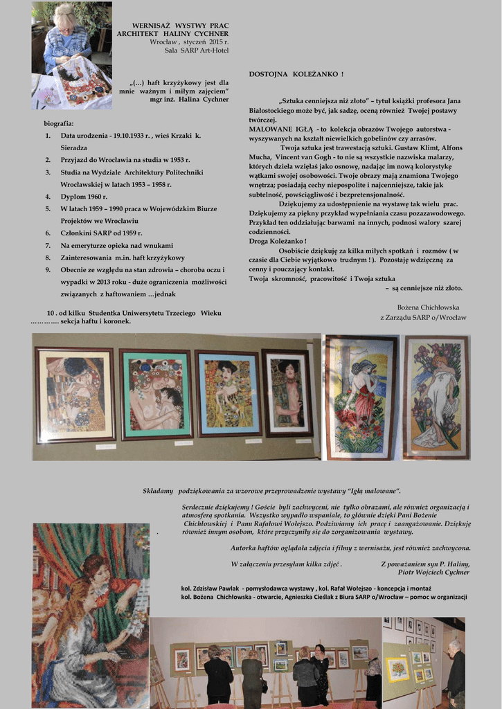 WERNISAŻ WYSTWY PRAC ARCHITEKT HALINY CYCHNER Wrocław , styczeń 2015 r. Sala SARP Art-Hotel DOSTOJNA KOLEŻANKO ! „(…) haft krzyżykowy jest dla mnie ważnym i miłym zajęciem” mgr inż. Halina Cychner biografia: 1. Data urodzenia - 19.10.1933 r. , wieś Krzaki k. Sieradza 2. Przyjazd do Wrocławia na studia w 1953 r. 3. Studia na Wydziale Architektury Politechniki Wrocławskiej w latach 1953 – 1958 r. 4. Dyplom 1960 r. 5. W latach 1959 – 1990 praca w Wojewódzkim Biurze Projektów we Wrocławiu 6. Członkini SARP od 1959 r. 7. Na emeryturze opieka nad wnukami 8. Zainteresowania m.in. haft krzyżykowy 9. Obecnie ze względu na stan zdrowia – choroba oczu i wypadki w 2013 roku - duże ograniczenia możliwości związanych z haftowaniem …jednak „Sztuka cenniejsza niż złoto” – tytuł książki profesora Jana Białostockiego może być, jak sadzę, oceną również Twojej postawy twórczej. MALOWANE IGŁĄ - to kolekcja obrazów Twojego autorstwa wyszywanych na kształt niewielkich gobelinów czy arrasów. Twoja sztuka jest trawestacją sztuki. Gustaw Klimt, Alfons Mucha, Vincent van Gogh - to nie są wszystkie nazwiska malarzy, których dzieła wzięłaś jako osnowę, nadając im nową kolorystykę wątkami swojej osobowości. Twoje obrazy mają znamiona Twojego wnętrza; posiadają cechy niepospolite i najcenniejsze, takie jak subtelność, powściągliwość i bezpretensjonalność. Dziękujemy za udostępnienie na wystawę tak wielu prac. Dziękujemy za piękny przykład wypełniania czasu pozazawodowego. Przykład ten oddziałując barwami na innych, podnosi walory szarej codzienności. Droga Koleżanko ! Osobiście dziękuję za kilka miłych spotkań i rozmów ( w czasie dla Ciebie wyjątkowo trudnym ! ). Pozostaję wdzięczną za cenny i pouczający kontakt. Twoja skromność, pracowitość i Twoja sztuka – są cenniejsze niż złoto. Bożena Chichłowska z Zarządu SARP o/Wrocław 10 . od kilku Studentka Uniwersytetu Trzeciego Wieku …………. sekcja haftu i koronek. Składamy podziękowania za wzorowe przeprowadzenie wystawy “Igłą malowane”. . Serdecznie dziękujemy ! Goście byli zachwyceni, nie tylko obrazami, ale również organizacją i atmosferą spotkania. Wszystko wypadło wspaniale, to głównie dzięki Pani Bożenie Chichłowskiej i Panu Rafałowi Wołejszo. Podziwiamy ich pracę i zaangażowanie. Dziękuję również innym osobom, które przyczyniły się do zorganizowania wystawy. Autorka haftów oglądała zdjęcia i filmy z wernisażu, jest również zachwycona. W załączeniu przesyłam kilka zdjęć . Z poważaniem syn P. Haliny, Piotr Wojciech Cychner kol. Zdzisław Pawlak - pomysłodawca wystawy , kol. Rafał Wołejszo - koncepcja i montaż kol. Bożena Chichłowska - otwarcie, Agnieszka Cieślak z Biura SARP o/Wrocław – pomoc w organizacji