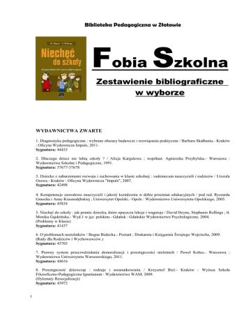 Biblioteka Pedagogiczna w Złotowie Fobia Szkolna Zestawienie bibliograficzne w wyborze WYDAWNICTWA ZWARTE 1. Diagnostyka pedagogiczna : wybrane obszary badawcze i rozwiązania praktyczne / Barbara Skałbania.- Kraków : Oficyna Wydawnicza Impuls, 2011. Sygnatura: 44433 2. Dlaczego dzieci nie lubią szkoły ? / Alicja Kargulowa ; współaut. Agnieszka Przybylska.- Warszawa : Wydawnictwa Szkolne i Pedagogiczne, 1991. Sygnatura: 37677-37678 3. Dziecko z zaburzeniami rozwoju i zachowania w klasie szkolnej : vademecum nauczycieli i rodziców / Urszula Oszwa.- Kraków : Oficyna Wydawnicza "Impuls", 2007. Sygnatura: 42498 4. Kompetencje zawodowe nauczycieli i jakość kształcenia w dobie przemian edukacyjnych / pod red. Ryszarda Gmocha i Anny Krasnodębskiej ; Uniwersytet Opolski.- Opole : Wydawnictwo Uniwersytetu Opolskiego, 2005. Sygnatura: 45834 5. Niechęć do szkoły : jak pomóc dziecku, które opuszcza lekcje i wagaruje / David Heyne, Stephanie Rollings ; tł. Monika Gajdzińska.- Wyd.1 w jęz. polskim.- Gdańsk : Gdańskie Wydawnictwo Psychologiczne, 2004. (Problemy w Klasie) Sygnatura: 41437 6. O problemach nastolatków / Bogna Białecka.- Poznań : Drukarnia i Księgarnia Świętego Wojciecha, 2009. (Rady dla Rodziców i Wychowawców.) Sygnatura: 43703 7. Prawny system przeciwdziałania demoralizacji i przestępczości nieletnich / Paweł Kobes.- Warszawa : Wydawnictwa Uniwersytetu Warszawskiego, 2011. Sygnatura: 44616 8. Przestępczość dziewcząt : rodzaje i uwarunkowania / Krzysztof Biel.- Kraków : Wyższa Szkoła Filozoficzno-Pedagogiczna Ignatianum : Wydawnictwo WAM, 2009. (Dylematy Resocjalizacji) Sygnatura: 43972 1 9. Rodzice i dzieci : encyklopedia / współaut. Erna Daraszkiewicz ; oprac. red. Marta Pawlus.- Bielsko-Biała : "Park", 2002. Sygnatura: 40431 p 10. Słownik pedagogiki i psychologii : zagadnienia, pojęcia, terminy / oprac. Katarzyna Janus.- Warszawa : Buchmann, 2011. Sygnatura: 44292 p 11. Słownik pedagogiki specjalnej / Małgorzata Kupisiewicz ; Akademia Pedagogiki Specjalnej im. Marii Grzegorzewskiej.- Warszawa : Wydawnictwo Naukowe PWN, 2013. Sygnatura: 45256 p 12. Uczeń o specjalnych potrzebach wychowawczych w klasie szkolnej / Aneta Paszkiewicz, Małgorzata Łobacz.Warszawa : Wydawnictwo Difin, 2013. (Engram) Sygnatura: 45381 13. Vademecum pedagoga szkolnego / Mirosław Sałasiński, Beata Badziukiewicz.- Warszawa : Wydawnictwa Szkolne i Pedagogiczne, 2003. (Szkoła Dziś i Jutro) Sygnatura: 41966 14. Wychowanie wobec wyzwań współczesności / pod red. Janusza Kirenko, Danuty Wosik-Kawali, Teresy Zubrzyckiej-Maciąg.- Lublin : Wydawnictwo Uniwersytetu Marii Curie-Skłodowskiej, 2011. Sygnatura: 44915 15. Zaburzenia w zachowaniu dzieci i młodzieży w kontekście trudnych sytuacji szkolnych i pozaszkolnych / pod red. nauk. Danuty Boreckiej-Biernat.- Kraków : Oficyna Wydawnicza"Impuls", 2011. Sygnatura: 44326 ARTYKUŁY Z CZASOPISM 1. Absencja ucznia na zajęciach szkolnych : opis i analiza przypadku rozpoznania i rozwiązania problemu wychowawczego / Maria WALKIEWICZ. // Nowa Szkoła. - 2002, nr 10, s. 38-40 2. Czy wszystkie dzieci chodzą do szkoły ? / Halina CZAJKOWSKA-KILIANEK. // Nowa Szkoła. - 1996, nr 2, s. 9-10 3. Fobia szkolna / Julia Kochelak. // Wszystko dla Szkoły. - 2007, nr 4, s. 12 4. Fobia szkolna : co robić, kiedy dziecko boi się iść do szkoły? / Magdalena Pitala. // Nauczanie Początkowe. 2006/2007, nr 1, s. 43-54 5. Frekwencja i świadectwo szkolne / Józef Kilianek. // Nowa Szkoła. - 1995, nr 5, s. 3 6. Hi-tech i wagary / Renata Nowicka. // Nowa Szkoła. - 1993, nr 9, s. 557-558 7. Jak zapobiegać wagarom? / Ewa Bogumiła TURNIAK. // Problemy Opiekuńczo-Wychowawcze. - 2002, nr 1, s. 46-47 8. Lęk i jego rola w regulacji zachowania człowieka / Małgorzata Kiedrowska. // Wychowanie na co dzień. 2007, nr 12, s. 22-25 9. Lęk i szkoła / Teresa Bach-Olasik. // Nowa Szkoła. - 1993, nr 3, s. 158-166 2 10. Lęk szkolny (Co młody nauczyciel powinien wiedzieć o lęku ?) / Barbara KAROLCZAK-BIERNACKA. // Nowa Szkoła. - 1992, nr 9, s. 528-535 11. Lęk szkolny dziecka na etapie wczesnej edukacji / Irena Stańczak. // Nauczanie Początkowe. - 2010/2011, nr 1, s.14-19 12. Nauczyciel może pomóc / Janina Janowska // Psychologia w Szkole. – 2011, nr 3, s. 31-34 13. Nie chcę chodzić na lekcje W-F / Mirosław Kaczmarek. // Problemy Opiekuńczo-Wychowawcze. - 2005, nr 6, s. 27-31 14. O potrzebie analizy frekwencji uczniów na lekcjach szkolnych / Halina CZAJKOWSKA-KILIANEK. // Nowa Szkoła. - 1993, nr 9, s. 542-543,546 15. O wagarach i fobii szkolnej w literaturze / Aneta Paszkiewicz. // Problemy Opiekuńczo-Wychowawcze. 2010, nr 10, s.36-41 16. Oduczanie lęku / Przemysław Bąbel. // Psychologia w Szkole. - 2012, nr 4, s.77-84 17. Percepcja postaw rodzicielskich i postaw lęku w aspekcie kształtowania się emocjonalno-obronnej strategii radzenia sobie z sytuacją trudną przez młodzież / Danuta Borecka-Biernat. // Edukacja. - 2002, nr 4, s. 50-65 18. Poczucie lęku u młodzieży gimnazjalnej / Magdalena Malec. // Problemy Opiekuńczo-Wychowawcze. 2013, nr 9, s. 48-56 19. Rodzinne i podmiotowe uwarunkowania lęku ucznia / Teresa Bach-Olasik. // Nowa Szkoła. - 1993, nr 4, s. 212-217 20. Skutki traumy u młodzieży oraz sposoby pomocy / Piotr Stolecki // Problemy Opiekuńczo wychowawcze.-2009, nr 4, s. 35-38. 21. Sprawdziany bez stresu / Małgorzata Zagozdon // Życie Szkoły. - 2001, nr 8, s. 467-470. 22. Stres i kryzys w szkole / Jarosław Jagieła // Wychowawca. – 2010, nr 10, s. 12-15 23. Stres uczniów klas integracyjnych (raport z badania) / Renata Sikora // Nowa Szkoła.-2010, nr 7, s. 45-48. 24. Szkolne lęki / Maria Halińska // Psychologia w Szkole. – 2012, nr 3, s.98-102 25. Szkoła jako czynnik nieprzystosowania społecznego uczniów / Małgorzata Kiedrowska. // Wychowanie na co dzień. - 2009, nr 4-5, s.12-18 26. Szkoła jako główne źródło stresu młodzieży w wieku dorastania / Joanna Różańska-Kowal. /