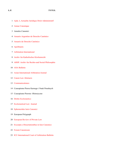 L.P. TYTUŁ 1 Ajda. L.Actualite Juridique Droit Administratif 2 Annae Canonique 3 Annales Canonici 4 Anuario Argentino de Derecho Canónico 5 Anuario de Derecho Canónico 6 Apollinaris 7 Arbitration International 8 Archiv fur Katholisches Kirchenrecht 9 ARSP. Archiv fur Rechts-und Sozial Philosophie 10 ASA Bulletin 11 Asian International Arbitration Journal 12 Canon Law Abstracts 13 Communicationes 14 Czasopismo Prawa Karnego i Nauk Penalnych 15 Czasopismo Prawno -Historyczne 16 Diritto Ecclesiastico 17 Ecclesiastical Law Journal 18 Ephemerides Iuris Canonici 19 European Polygraph 20 European Review of Private Law 21 Excerpta e Dissertationibus in Iure Canonico 22 Forum Canonicum 23 ICC-International Court of Arbitration Bulletin 24 Ius Canonicum 25 Ius Ecclesiae 26 Ius Novum 27 Journal of International Arbitration 28 Journal of Legislative Studies 29 Jurysta 30 Jus Matrimoniale (UKSW) 31 Jus. Rivista di Scienze Giuridiche 32 Kościół i Prawo (KUL) 33 Kwartalnik Prawa Prywatnego 34 Kwartalnik Prawa Publicznego (UKSW) 35 Nowy Przegląd Notarialny 36 OARR. Osterreichisches Archiv fur Recht & Religion 37 Orzecznictwo Sądu Najwyższego. Izba Cywilna 38 Palestra 39 Państwo i Prawo 40 Państwo Prawne 41 Periodica de re Canonica 42 Polish Review of International and European Law (UKSW) 43 Prawo Europejskie w Praktyce 44 Prawo i Kościół (UAM) 45 Prawo i Medycyna 46 Prawo i Podatki 47 Prawo Kanoniczne (UKSW) 48 Przegląd Prawa Konstytucyjnego 49 Przegląd Prawa Wyznaniowego 50 Przegląd Prawniczy UW 51 Quaderni di Diritto Ecclesiale 52 Recht der Internationalen Wirtschaf 53 Revista Espanola de Derecho Canonico 54 Revista Mexicana de Derecho Canonico 55 Revue de Droit Canonique 56 Revue Internationale des Droit de L'Antique 57 Roczniki Nauk Prawnych 58 Roczniki Wydziału Nauk Prawnych i Ekonomicznych KUL 59 Ruch Prawniczy, Ekonomiczny i Socjologiczny 60 Schieds VZ 61 Studia Canonica 62 Studia Iuridica. Miscelanea 63 Studia Prawnicze (PAN) 64 Studia Prawnicze KUL 65 Studia Prawnicze. Rozprawy i Materiały 66 Studia Prawno-Europejskie 67 World Trade and Arbitration Materials 68 Zeitschrift der Savigny-Stiftung fur Rechtsgeschichte. Kanonistiche Abteilung 69 Zeitschrift der Savigny-Stiftung fur Rechtsgeschichte. Romanistiche Abteilung 70 Zeitschrift fur Evengelisches Kirchenrecht Zeszyty Naukowe Uniwersytetu Przyrodniczo-Humanistycznego w Siedlcach. 71 Administracja i Zarządzanie 72 Zeszyty Naukowe Uniwersytetu Rzeszowskiego. Seria Prawnicza. PRAWO 73 Zeszyty Prawnicze (UKSW) 74 Zeszyty Prawnicze Biura Analiz Sejmowych 75 ZZP. Zeitschrift fur Zivilprozess