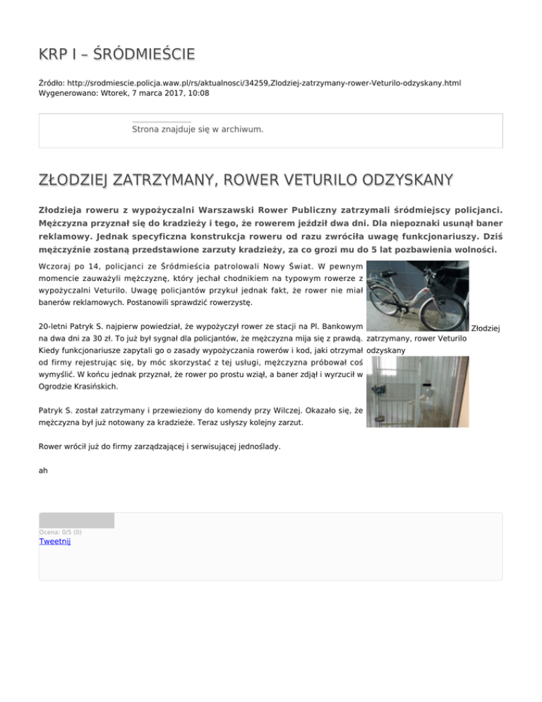KRP I – ŚRÓDMIEŚCIE Źródło: http://srodmiescie.policja.waw.pl/rs/aktualnosci/34259,Zlodziej-zatrzymany-rower-Veturilo-odzyskany.html Wygenerowano: Wtorek, 7 marca 2017, 10:08 Strona znajduje się w archiwum. ZŁODZIEJ ZATRZYMANY, ROWER VETURILO ODZYSKANY Złodzieja roweru z wypożyczalni Warszawski Rower Publiczny zatrzymali śródmiejscy policjanci. Mężczyzna przyznał się do kradzieży i tego, że rowerem jeździł dwa dni. Dla niepoznaki usunął baner reklamowy. Jednak specyficzna konstrukcja roweru od razu zwróciła uwagę funkcjonariuszy. Dziś mężczyźnie zostaną przedstawione zarzuty kradzieży, za co grozi mu do 5 lat pozbawienia wolności. Wczoraj po 14, policjanci ze Śródmieścia patrolowali Nowy Świat. W pewnym momencie zauważyli mężczyznę, który jechał chodnikiem na typowym rowerze z wypożyczalni Veturilo. Uwagę policjantów przykuł jednak fakt, że rower nie miał banerów reklamowych. Postanowili sprawdzić rowerzystę. 20-letni Patryk S. najpierw powiedział, że wypożyczył rower ze stacji na Pl. Bankowym na dwa dni za 30 zł. To już był sygnał dla policjantów, że mężczyzna mija się z prawdą. zatrzymany, rower Veturilo Kiedy funkcjonariusze zapytali go o zasady wypożyczania rowerów i kod, jaki otrzymał odzyskany od firmy rejestrując się, by móc skorzystać z tej usługi, mężczyzna próbował coś wymyślić. W końcu jednak przyznał, że rower po prostu wziął, a baner zdjął i wyrzucił w Ogrodzie Krasińskich. Patryk S. został zatrzymany i przewieziony do komendy przy Wilczej. Okazało się, że mężczyzna był już notowany za kradzieże. Teraz usłyszy kolejny zarzut. Rower wrócił już do firmy zarządzającej i serwisującej jednoślady. ah Ocena: 0/5 (0) Tweetnij Złodziej