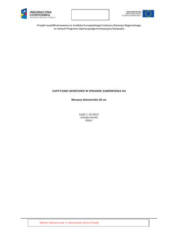 Projekt współfinansowany ze środków Europejskiego Funduszu Rozwoju Regionalnego w ramach Programu Operacyjnego Innowacyjna Gospoaka ZAPYTANIE OFERTOWE W SPRAWIE ZAMÓWIENIA NA Maszyny dziewiarskie 20 szt. Łódź 1.10.2013 /miejscowość, data/ “Marilyn” Marzena Janiak ul. Romanowska 131 91-174 Łódź Projekt współfinansowany ze środków Europejskiego Funduszu Rozwoju Regionalnego w ramach Programu Operacyjnego Innowacyjna Gospodarka 1. Nazwa i adres Zamawiającego. “Marilyn “ Marzena Janiak ul. Romanowska 131 91-174 Łódź Tel: 42 712 12 15 FAX: 42 650 99 20 NIP: 726-050-24-52 REGON: 470925076 2. Tryb udzielania zamówienia. Zamówienie udzielane będzie w trybie postępowania ofertowego. 3. Opis przedmiotu zamówienia. • • • • • • • • • • • • • • • • • • • • • Maszyny dziewiarskie (4sztuki) Średnica cylindra od 4 cale uiglenie: 200 igieł, języczek 7 mm Maszyna z możliwością produkcji dzianiny typu frota Urządzenie Anti-twist 2 podawacze pozytywne typu LGL 2 systemy, elektroniczna selekcja na wszystkich systemach Maszyny dziewiarskie(2 sztuki) Średnica cylindra od 4'1/4 cala uiglenie: 480 igieł, języczek 9,5 mm 4 systemy, elektroniczna selekcja na wszystkich systemach Maszyny wyposażone w indywidualny wentylator obciągowy 2,2 KW Urządzenie Anti-twist Maszyny dziewiarskie (2 sztuki) Średnica cylindra od 4 cale uiglenie: 402 igły, języczek 7 mm 4 systemy, elektroniczna selekcja na wszystkich systemach Urządzenie Anti-twist Maszyny dziewiarskie (10sztuk) Średnica cylindra od 4 cale uiglenie: 400 igieł, języczek 7 mm 4 systemy, pneumatyczna selekcja 1 i 3 systemie Podawacze pozytywne typu PYF 2 szt/masz Sterowanie główki silnikiem krokowym Urządzenie Anti-twist Maszyny dziewiarskie(2 sztuki) • Średnica cylindra od 4 cale • uiglenie: 216 igieł • 2 systemy • 2 cylindry (dolny i górny) • Możliwość uzyskania splotu dzianiny typu Jacquard “Marilyn” Marzena Janiak ul. Romanowska 131 91-174 Łódź • • 4. Sterowanie główki silnikiem krokowym System Anti-twist Termin realizacji zamówienia. Maxymalnie 120 dni od daty złożenia zamówienia. 5. Zamówienia częściowe. Zamawiający nie dopuszcza składania ofert częściowych. 6. Informacja o ofercie wariantowej. Zamawiający nie dopuszcza składania ofert wariantowych. 7. Opis warunków udziału w postępowaniu oraz sposobu dokonywania oceny spełnienia tych warunków: 7.1. W postępowaniu mogą wziąć udział Wykonawcy, którzy spełniają następujące warunki: a. posiadają uprawnienia do wykonywania działalności lub czynności w zakresie odpowiadającym przedmiotowi zamówienia, b. posiadają niezbędną wiedzę i doświadczenie oraz dysponują potencjałem technicznym i osobami zdolnymi do wykonania zamówienia. 7.2. Ocena spełnienia warunków udziału w niniejszym postępowaniu dokonana zostanie na zasadzie spełnia / nie spełnia w oparciu o informacje zawarte w dokumentach i oświadczeniach złożonych przez Wykonawców. 8. Osoby uprawnione do porozumiewania się z Wykonawcami: Piotr Janiak, Piotr Szyrman, Małgorzata Szpadzińska, Sławomir Urbanowicz 9. Miejsce i termin złożenia oferty. Oferty należy składać osobiście lub listownie na adres Zamawiającego: “Marilyn” Marzena Janiak Romanowska 131 91-174 Łódź w nieprzekraczalnym terminie do dnia 24.10..2013 do godz.16.00 10. Termin związania ofertą. Wykonawca pozostaje związany ofertą przez okres 90 rozpoczyna się wraz z upływem terminu składania ofert. dni. Bieg terminu 11. Termin i miejsce otwarcia ofert. Otwarcie ofert nastąpi dnia 25.10.2013 przewiduje publicznego otwarcia ofert. o godz. 10.00 w siedzibie Zamawiającego. Zamawiający nie “Marilyn” Marzena Janiak ul. Romanowska 131 91-174 Łódź 12. Kryteria oceny ofert i opis sposobu ich obliczenia. Opis kryteriów, którymi firma będzie się kierowała przy wyborze oferty oraz znaczenie tych kryteriów. Lp. Maksymalna liczba punktów możliwych do uzyskania – 100 Rodzaj Kryterium 1 Cena Punktacja Od 0 do 70 Sposób oceny Stosunek ceny najniższej oferty do ceny badanej oferty mnożony przez 70. Stosunek okresu gwarancji w badanej 2 13. Gwarancja Od 0 do 30 ofercie do okresu gwarancji w ofercie z najdłuższą gwarancją mnożony przez 30. Pozostałe in formacje. Poprzez złożenie oferty Oferent wyraża zgodę na podanie do wiadomości pozostałych Oferentów szczegółów oferty. Oferent ma prawo nie wyrazić zgody na podanie do wiadomości szczegółów technicznych przedmiotu zamówienia. Zamawiający zastrzega sobie prawo do: 1. zmiany warunków udzielenia zamówienia, 3. nie wybrania żadnej z przedstawionych ofert bez podania przyczyny, 2. 4. unieważnienia postępowania, pozostawienia bez rozpatrzenia oferty niezgodnej z wymogami niniejszego zapytania. W przypadku zaistnienia powyższych okoliczności Oferentom nie przysługują żadne roszczenia w stosunku do Zamawiającego. Zamawiający jednocześnie informuje, że postępowanie nie jest prowadzone w oparciu o ustawę z dnia 29 stycznia 2004r. – Prawo Zamówień Publicznych, dlatego nie jest możliwe stosowanie środków odwoławczych określonych w tej ustawie. --------------------------------------------------/podpis osoby upoważnionej do reprezentowania Beneficjenta oraz pieczątka firmowa “Marilyn” Marzena Janiak ul. Romanowska 131 91-174 Łódź “Marilyn” Marzena Janiak ul. Romanowska 131 91-174 Łódź