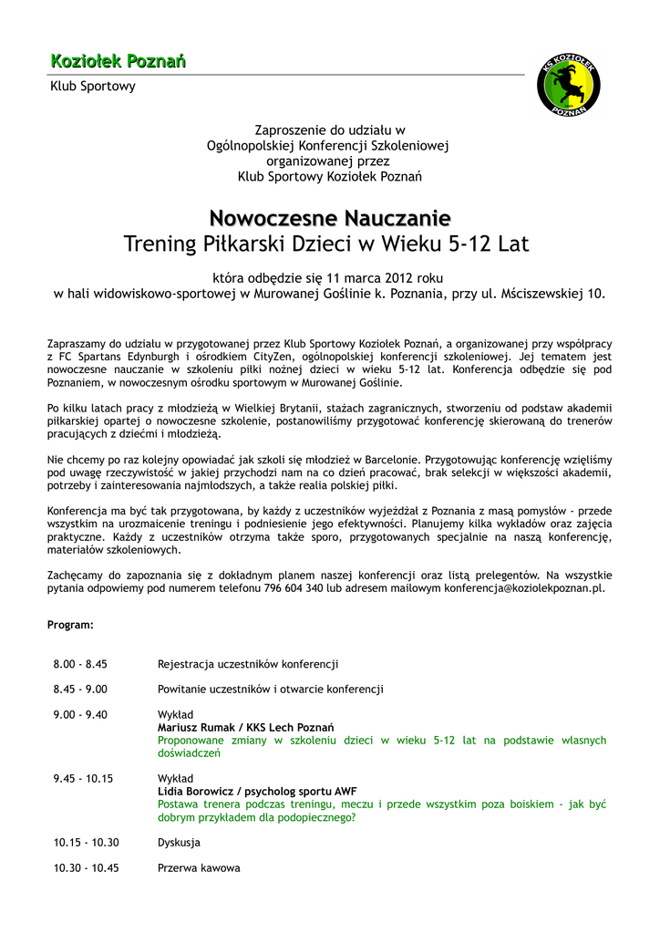 Koziołek Poznań Klub Sportowy Zaproszenie do udziału w Ogólnopolskiej Konferencji Szkoleniowej organizowanej przez Klub Sportowy Koziołek Poznań Nowoczesne Nauczanie Trening Piłkarski Dzieci w Wieku 5-12 Lat która odbędzie się 11 marca 2012 roku w hali widowiskowo-sportowej w Murowanej Goślinie k. Poznania, przy ul. Mściszewskiej 10. Zapraszamy do udziału w przygotowanej przez Klub Sportowy Koziołek Poznań, a organizowanej przy współpracy z FC Spartans Edynburgh i ośrodkiem CityZen, ogólnopolskiej konferencji szkoleniowej. Jej tematem jest nowoczesne nauczanie w szkoleniu piłki nożnej dzieci w wieku 5-12 lat. Konferencja odbędzie się pod Poznaniem, w nowoczesnym ośrodku sportowym w Murowanej Goślinie. Po kilku latach pracy z młodzieżą w Wielkiej Brytanii, stażach zagranicznych, stworzeniu od podstaw akademii piłkarskiej opartej o nowoczesne szkolenie, postanowiliśmy przygotować konferencję skierowaną do trenerów pracujących z dziećmi i młodzieżą. Nie chcemy po raz kolejny opowiadać jak szkoli się młodzież w Barcelonie. Przygotowując konferencję wzięliśmy pod uwagę rzeczywistość w jakiej przychodzi nam na co dzień pracować, brak selekcji w większości akademii, potrzeby i zainteresowania najmłodszych, a także realia polskiej piłki. Konferencja ma być tak przygotowana, by każdy z uczestników wyjeżdżał z Poznania z masą pomysłów - przede wszystkim na urozmaicenie treningu i podniesienie jego efektywności. Planujemy kilka wykładów oraz zajęcia praktyczne. Każdy z uczestników otrzyma także sporo, przygotowanych specjalnie na naszą konferencję, materiałów szkoleniowych. Zachęcamy do zapoznania się z dokładnym planem naszej konferencji oraz listą prelegentów. Na wszystkie pytania odpowiemy pod numerem telefonu 796 604 340 lub adresem mailowym [email protected]. Program: 8.00 - 8.45 Rejestracja uczestników konferencji 8.45 - 9.00 Powitanie uczestników i otwarcie konferencji 9.00 - 9.40 Wykład Mariusz Rumak / KKS Lech Poznań Proponowane zmiany w szkoleniu dzieci w wieku 5-12 lat na podstawie własnych doświadczeń 9.45 - 10.15 Wykład Lidia Borowicz / psycholog sportu AWF Postawa trenera podczas treningu, meczu i przede wszystkim poza boiskiem - jak być dobrym przykładem dla podopiecznego? 10.15 - 10.30 Dyskusja 10.30 - 10.45 Przerwa kawowa 10.45 - 11.30 Zajęcia praktyczne Łukasz Bigus / KS Koziołek Poznań Rozgrzewka jako atrakcyjna część treningu piłkarskiego dzieci - wybrane formy zabaw przygotowujące do zajęć 11.30 - 12.15 Zajęcia praktyczne Bartosz Maik / CityZen Zajęcia propriocepcji z elementami koordynacyjnymi jako urozmaicenie treningu piłkarskiego 12.20 - 13.00 Przerwa obiadowa 13.00 - 14.00 Wykład Kenneth Cameron / FC Spartans Edinburgh Potrzeby i zainteresowania dzieci jako podstawowe czynniki wpływające na pracę trenera. W jaki sposób wykorzystać te elementy, aby szkolić efektywniej? 14.00 - 14.15 Dyskusja 14.20 - 15.30 Zajęcia praktyczne Paweł Lisowski / KS Koziołek Poznań Formy małych gier wykorzystywane w szkoleniu dzieci i młodzieży 15.30 - 16.15 Zajęcia praktyczne Maciej Borowski / KS Warta Poznań Podstawowe ćwiczenia stosowane w szkoleniu bramkarzy na etapie 10-12 lat 16.15 - 16.30 Przerwa kawowa 16.30 - 17.30 Panel dyskusyjny na temat aktualnego stanu oraz ewentualnych zmian w rozgrywkach dzieci do 12. roku życia. Wstęp oraz prowadzenie dyskusji: Łukasz Bigus oraz Paweł Lisowski. Organizacja rozgrywek ligowych dla dzieci w wybranych krajach europejskich. Planowany udział przedstawicieli WZPN. 17.30 - 18.00 Zamknięcie konferencji - rozdanie certyfikatów i materiałów szkoleniowych Prelegenci: Mariusz Rumak KKS Lech Poznań Asystent trenera Jose Bakero w Lechu Poznań. Wcześniej prowadził zespół Młodej Ekstraklasy Jagiellonii Białystok oraz pracował z zespołami młodzieżowymi KKS Lech Poznań. Zdobył mistrzostwo Polski z drużyną juniorów młodszych Lecha Poznań. Lidia Borowicz AWF Psycholog, doktorantka Akademii Wychowania Fizycznego w Poznaniu, Katedra Teorii i Metodyki Wychowania Fizycznego. Prowadzi badania naukowe w zakresie poczucia koherencji oraz stylów radzenia sobie ze stresem wśród sportowców. W ramach współparcy z klubem Warta Poznań realizowała opiekę psychologiczną sekcji pływackiej oraz tenisowej. Pracuje między innymi z zawodnikami klubu AZS Poznań. Łukasz Bigus KS Koziołek Poznań Trener w klubie KS Koziołek Poznań. Pracował 3 lata z młodzieżą w Szkocji, posiada UEFA Basic Children's'Award licencję 'B' dla trenerów pracujących z dziećmi 5-12 lat. Odbył staże trenerskie w Lechu Poznań i Spartans Edinburgh. Bartosz Maik CityZen Koordynator zajęć kształtujących priocepcję w CityZen, wcześniej członek sztabu medycznego KKS Lech Poznań. Kenneth Cameron FC Spartans Edinburgh Koordynator grup młodzieżowych FC Spartans Edingurgh. Prowadzi także zespół juniorski FC Spartans, a także przygotowuje akcje społeczne, mające zachęcić dzieci i młodzież do aktywności poprzez piłkę nożną. Paweł Lisowski KS Koziołek Poznań Koordynator grup młodzieżowych KS Koziołek Poznań, pracownik Akademii Wychowania Fizycznego w Poznaniu. Odbył staże trenerskie m. in. w Oranje Berlin i Spartans Edinburgh. Maciej Borowski KS Warta Poznań Trener bramkarzy zespołu seniorskiego KS Warta Poznań. Wcześniej prowadził zespół rocznika 2001, jest także trenerem bramkarzy w pionie juniorów. Koszt udziału w konferencji: 100 zł brutto przy zgłoszeniu i wpłacie wpisowego do 31 stycznia 2012, 130 zł brutto przy zgłoszeniu i wpłacie wpisowego po 31 stycznia 2012. Ilość miejsc ograniczona Prosimy o dokonanie wpłaty na poniższe konto: ING Bank Śląski 88 1050 1520 1000 0090 7202 8518 Klub Sportowy Koziołek Poznań os. Bohaterów II Wojny Światowej 73a 61-383 Poznań Zgłoszenia prosimy wysyłać na adres: [email protected]. Więcej informacji pod numerem telefonu 796 604 340.
