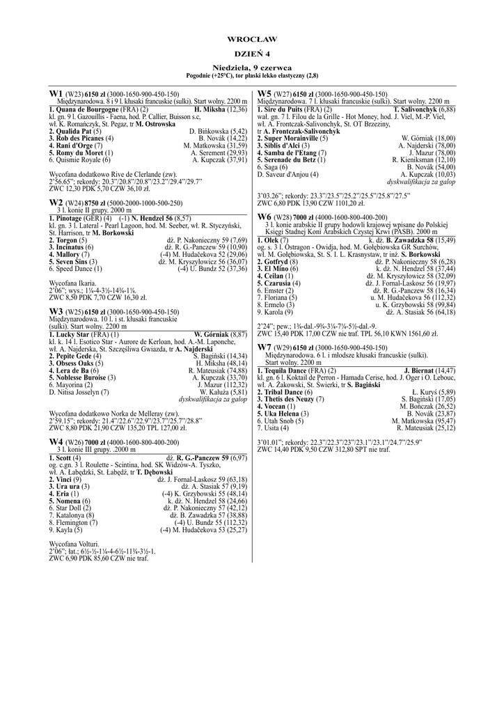 WROCŁAW DZIEŃ 4 Niedziela, 9 czerwca Pogodnie (+25°C), tor płaski lekko elastyczny (2,8) W1 (W23) 6150 zł (3000-1650-900-450-150) Międzynarodowa. 8 i 9 l. kłusaki francuskie (sulki). Start wolny. 2200 m 1. Quana de Bourgogne (FRA) (2) H. Miksha (12,36) kl. gn. 9 l. Gazouillis - Faena, hod. P. Callier, Buisson s.c, wł. K. Romańczyk, St. Pegaz, tr M. Ostrowska 2. Qualida Pat (5) D. Bińkowska (5,42) 3. Rob des Picanes (4) B. Novák (14,22) 4. Rani d'Orge (7) M. Matkowska (31,59) 5. Romy du Moret (1) A. Serement (29,93) 6. Quismie Royale (6) A. Kupczak (37,91) Wycofana dodatkowo Rive de Clerlande (zw). 2’56.65”; rekordy: 20.3”/20.8”/20.8”/23.2”/29.4”/29.7” ZWC 12,30 PDK 5,70 CZW 36,10 zł. W2 (W24) 8750 zł (5000-2000-1000-500-250) 3 l. konie II grupy. 2000 m 1. Pinotage (GER) (4) (-1) N. Hendzel 56 (8,57) kl. gn. 3 l. Lateral - Pearl Lagoon, hod. M. Seeber, wł. R. Styczyński, St. Harrison, tr M. Borkowski 2. Torgon (5) dż. P. Nakonieczny 59 (7,69) 3. Incinatus (6) dż. R. G.-Panczew 59 (10,90) 4. Mallory (7) (-4) M. Hudačekova 52 (29,06) 5. Seven Sins (3) dż. M. Kryszyłowicz 56 (36,07) 6. Speed Dance (1) (-4) U. Bundz 52 (37,36) Wycofana Ikaria. 2’06”; wys.; 1¼-4-3½-14¾-1¼. ZWC 8,50 PDK 7,70 CZW 16,30 zł. W3 (W25) 6150 zł (3000-1650-900-450-150) Międzynarodowa. 10 l. i st. kłusaki francuskie (sulki). Start wolny. 2200 m 1. Lucky Star (FRA) (1) W. Górniak (8,87) kl. k. 14 l. Esotico Star - Aurore de Kerloan, hod. A.-M. Laponche, wł. A. Najderska, St. Szczęśliwa Gwiazda, tr A. Najderski 2. Pepite Gede (4) S. Bagiński (14,34) 3. Obsess Oaks (5) H. Miksha (48,14) 4. Lera de Ba (6) R. Mateusiak (74,88) 5. Noblesse Buroise (3) A. Kupczak (33,70) 6. Mayorina (2) J. Mazur (112,32) D. Nitisa Josselyn (7) W. Kałuża (5,81) dyskwalifikacja za galop Wycofana dodatkowo Norka de Melleray (zw). 2’59.15”; rekordy: 21.4”/22.6”/22.9”/23.7”/25.7”/28.8” ZWC 8,80 PDK 21,90 CZW 135,20 TPL 127,00 zł. W4 (W26) 7000 zł (4000-1600-800-400-200) 3 l. konie III grupy. .2000 m 1. Scott (4) dż. R. G.-Panczew 59 (6,97) og. c.gn. 3 l. Roulette - Scintina, hod. SK Widzów-A. Tyszko, wł. A. Łabędzki, St. Łabędź, tr T. Dębowski 2. Vinci (9) dż. J. Fornal-Laskosz 59 (63,18) 3. Ura ura (3) dż. A. Stasiak 57 (9,19) 4. Eria (1) (-4) K. Grzybowski 55 (48,14) 5. Nomena (6) k. dż. N. Hendzel 58 (24,66) 6. Star Doll (2) dż. P. Nakonieczny 57 (42,12) 7. Katalonya (8) dż. B. Zawadzka 57 (38,88) 8. Flemington (7) (-4) U. Bundz 55 (112,32) 9. Kayla (5) (-4) M. Hudačekova 53 (25,27) Wycofana Volturi. 2’06”; łat.; 6½-½-1¼-4-6½-11¾-3½-1. ZWC 6,90 PDK 85,60 CZW nie traf. W5 (W27) 6150 zł (3000-1650-900-450-150) Międzynarodowa. 7 l. kłusaki francuskie (sulki). Start wolny. 2200 m 1. Sire du Puits (FRA) (2) T. Salivonchyk (6,88) wał. gn. 7 l. Filou de la Grille - Hot Money, hod. J. Viel, M.-P. Viel, wł. A. Frontczak-Salivonchyk, St. OT Brzeziny, tr A. Frontczak-Salivonchyk 2. Super Morainville (5) W. Górniak (18,00) 3. Siblis d'Alci (3) A. Najderski (78,00) 4. Samba de l'Etang (7) J. Mazur (78,00) 5. Serenade du Betz (1) R. Kieniksman (12,10) 6. Saga (6) B. Novák (54,00) D. Saveur d'Anjou (4) A. Kupczak (10,03) dyskwalifikacja za galop 3’03.26”; rekordy: 23.3”/23.5”/25.2”/25.5”/25.8”/27.5” ZWC 6,80 PDK 13,90 CZW 1101,20 zł. W6 (W28) 7000 zł (4000-1600-800-400-200) 3 l. konie arabskie II grupy hodowli krajowej wpisane do Polskiej Księgi Stadnej Koni Arabskich Czystej Krwi (PASB). 2000 m 1. Olek (7) k. dż. B. Zawadzka 58 (15,49) og. s. 3 l. Ostragon - Owidja, hod. M. Gołębiowska GR Surchów, wł. M. Gołębiowska, St. S. I. L. Krasnystaw, tr inż. S. Borkowski 2. Gotfryd (8) dż. P. Nakonieczny 58 (6,28) 3. El Mino (6) k. dż. N. Hendzel 58 (37,44) 4. Ceilan (1) dż. M. Kryszyłowicz 58 (32,09) 5. Czarusia (4) dż. J. Fornal-Laskosz 56 (19,97) 6. Emster (2) dż. R. G.-Panczew 58 (16,34) 7. Floriana (5) u. M. Hudačekova 56 (112,32) 8. Ermelo (3) u. K. Grzybowski 58 (99,84) 9. Karola (9) dż. A. Stasiak 56 (64,18) 2’24”; pew.; 1¾-dal.-9¾-3¼-7¼-5½-dal.-9. ZWC 15,40 PDK 17,00 CZW nie traf. TPL 56,10 KWN 1561,60 zł. W7 (W29) 6150 zł (3000-1650-900-450-150) Międzynarodowa. 6 l. i młodsze kłusaki francuskie (sulki). Start wolny. 2200 m 1. Tequila Dance (FRA) (2) J. Biernat (14,47) kl. gn. 6 l. Koktail de Perron - Hamada Cerise, hod. J. Oger i O. Lebouc, wł. A. Żakowski, St. Świerki, tr S. Bagiński 2. Tribal Dance (6) Ł. Kuryś (5,89) 3. Thetis des Neuzy (7) S. Bagiński (17,05) 4. Vocean (1) M. Bończak (26,52) 5. Uka Helena (3) B. Novák (23,87) 6. Utah Snob (5) M. Matkowska (95,47) 7. Usita (4) R. Mateusiak (25,12) 3’01.01”; rekordy: 22.3”/22.3”/23”/23.1”/23.1”/24.7”/25.9” ZWC 14,40 PDK 9,50 CZW 312,80 SPT nie traf.