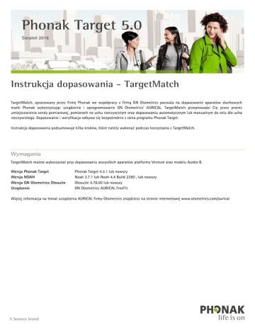 Phonak Target 5.0 Sierpień 2016 Instrukcja dopasowania - TargetMatch TargetMatch, opracowany przez firmę Phonak we współpracy z firmą GN Otometrics pozwala na dopasowanie aparatów słuchowych marki Phonak wykorzystując urządzenie i oprogramowanie GN Otometrics’ AURICAL. TargetMatch przeprowadzi Cię przez proces umiejscowienia sondy pomiarowej, pomiarach na uchu rzeczywistym oraz dopasowaniu automatycznym lub manualnym do celu dla ucha rzeczywistego. Dopasowanie i weryfikacja odbywa się bezpośrednio z okna programu Phonak Target. Instrukcja dopasowania podsumowuje kilka kroków, które należy wykonać podczas korzystania z TargetMatch. Wymagania TargetMatch można wykorzystać przy dopasowaniu wszystkich aparatów platformy Venture oraz modelu Audéo B. Wersja Phonak Target Wersja NOAH Wersja GN Otometrics Otosuite Urządzenie Phonak Target 4.3.1 lub nowszy Noah 3.7.1 lub Noah 4.4 Build 2280 , lub nowszy Otosuite 4.78.00 lub nowszy GN Otometrics AURICAL FreeFit Więcej informacja na temat urządzenia AURICAL firmy Otometrics znajdziesz na stronie internetowej www.otometrics.com/aurical Podłączenie aparatów Z rozsuwanego w dół menu znajdującego się po środku górnej części okna głównego wybierz urządzenie, którym chcesz programować aparaty: [NOAHlink] / [iCube II] / [HI-PRO]. Do TargetMatch rekomendowane jest użycie urządzenia iCube II. Jeżeli do programowania będzie używany iCube proszę włożyć nowe baterie do aparatów słuchowych. Naciśnij [Połącz], aby wykryć aparaty słuchowe. Po połączeniu aparatów, automatycznie pokaże się okno [Parametry akustyczne]. Uwaga: Proszę sprawdzić lub zmienić na wymagane opcje połączenia akustycznego. To zapewni, że podczas dopasowania użyte będą odpowiednie parametry akustyczne. Formuła dopasowania W zakładce [Globalne strojenie], można wybrać pożądaną metodę dopasowania. Na podstawie dokonanego wyboru TargetMatch zastosuje odpowiednie parametry i ustali cel dla ucha rzeczywistego. Globalne strojenie znajduje się w zakładce [Dopasowanie] > [Globalne strojenie]. TargetMatch Do TargetMatch wejdziesz z zakładki [Globalne strojenie] > [TargetMatch]. Naciśnij [R] / [Start obu] / [L], aby rozpocząć TargetMatch. Zostaniesz przeprowadzony przez serię kilku kroków. Zalecane jest wykonanie [Testu sprzężenia i ucha rzeczywistego] przed przejściem do testów z TargetMatch. Phonak Target | Instrukcja dopasowania - TargetMatch 2 Przygotowanie W tym kroku możesz wybrać maksymalny poziom głośności sygnału prezentowanego na błonę bębenkową , który nie będzie mógł być przekroczony podczas pomiarów. Ustawienia są oparte na audiogramie pacjenta, ale mogą być zmienione indywidualnie. Zanim naciśniesz [Kontynuuj], upewnij się, że AURICAL jest podłączony, a program FreeFit jest włączony. Podążaj za instrukcjami w celu skalibrowania sondy próbnej. Uwaga: Jeżeli krzywa kalibracja jest poszarpana, a nie gładka jak pokazano na rysunku obok upewnij się że sonda niczego nie dotyka i powtórz kalibrację. Naciśnij [Zamknij], aby przejść dalej. Umieszczenie sondy i pomiar REUG Naciśnij [R Start] / [L Start] , aby otworzyć pomiar REUG z instrukcjami umiejscowienia sondy. Jak tylko sonda znajdzie się przy otworze słuchowym zewnętrznym, naciśnij [Start] lub przycisk [Power Button] w AURICAL FreeFit, aby rozpocząć wspomagane instrukcjami umiejscawianie sondy. Delikatnie przesuwaj sondę w kierunku błony bębenkowej tak jak pokazuje to wskaźnik. Wartości są przedstawiane w milimetrach i dopasowane do skali na sondzie GN Otometrics. Zielony znacznik wskaże kiedy sonda znajdzie się w odpowiednim miejscu. Naciśnij [Pomiar] lub przycisk [Power Button] w AURICAL FreeFit, aby rozpocząć pomiar REUG. Pomiar przeniesienia akustycznego Załóż aparaty słuchowe na uszy pacjenta i naciśnij przycisk [Ponowne połączenie]. Uwaga: Upewnij się, że po założeniu aparatu słuchowego sonda nie zmieniła swojego położenia. Naciśnij na [Start pomiaru], aby rozpocząć pomiar przeniesienia akustycznego. Phonak Target | Instrukcja dopasowania - TargetMatch 3 Weryfikacja i dopasowanie Wybierz program, który ma być aktywny podczas weryfikacji, następnie wybierz [Automatyczne dopasowanie]. Naciśnij [Start pomiaru], aby rozpocząć automatyczne dopasowanie. TargetMatch automatycznie zastosuje przeniesienie akustyczne, uruchomi i przeprowadzi pomiary odpowiedzi aparatu oraz wykona dopasowanie do wybranych celi. Zakończenie TargetMatch V1.00/2016-08 © Phonak AG All rights reserved Naciśnij [Zapisz], aby wprowadzić zmiany do dopasowania i zapisać w programie Noah wszystkie wykonane pomiary. Wyniki będzie można zobaczyć w programach GN Otometrics’ Otosuite oraz w Phonak Target. Manufacturer: Phonak AG Laubisrütistrasse 28 CH-8712 Stäfa Switzerland CE mark applied 2016 Phonak Target | Instrukcja dopasowania - TargetMatch 4