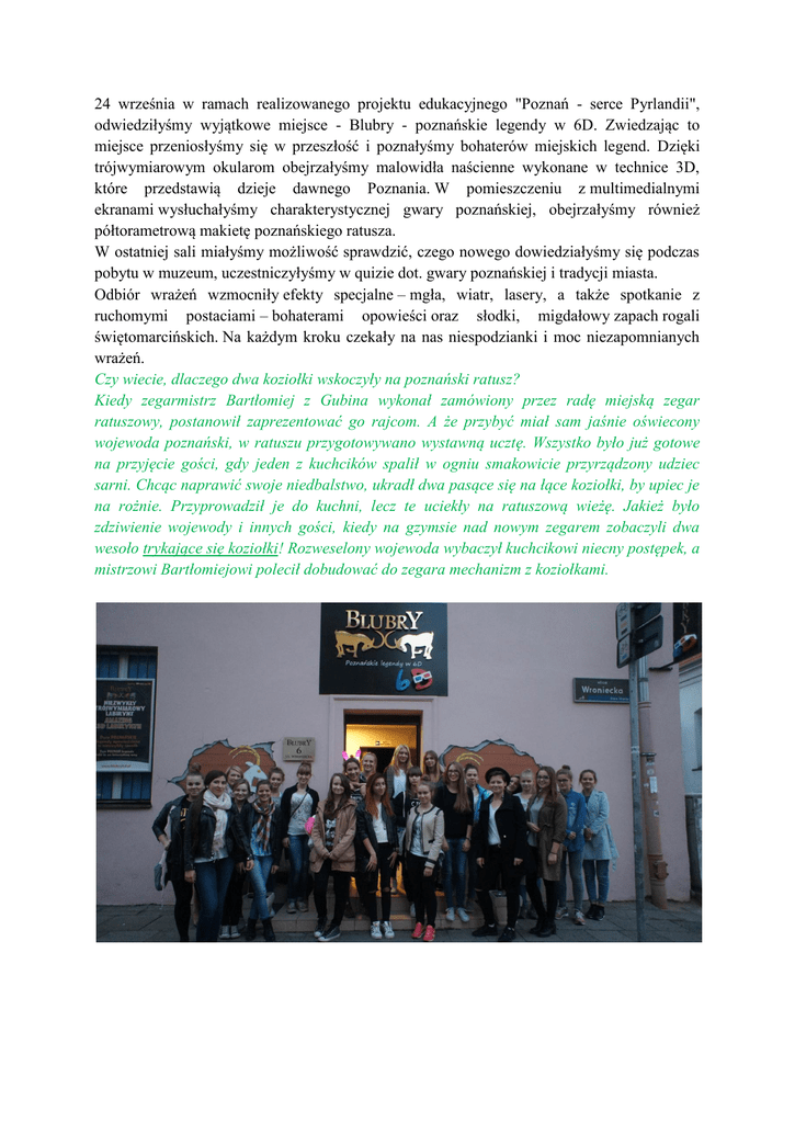 24 września w ramach realizowanego projektu edukacyjnego "Poznań - serce Pyrlandii", odwiedziłyśmy wyjątkowe miejsce - Blubry - poznańskie legendy w 6D. Zwiedzając to miejsce przeniosłyśmy się w przeszłość i poznałyśmy bohaterów miejskich legend. Dzięki trójwymiarowym okularom obejrzałyśmy malowidła naścienne wykonane w technice 3D, które przedstawią dzieje dawnego Poznania. W pomieszczeniu z multimedialnymi ekranami wysłuchałyśmy charakterystycznej gwary poznańskiej, obejrzałyśmy również półtorametrową makietę poznańskiego ratusza. W ostatniej sali miałyśmy możliwość sprawdzić, czego nowego dowiedziałyśmy się podczas pobytu w muzeum, uczestniczyłyśmy w quizie dot. gwary poznańskiej i tradycji miasta. Odbiór wrażeń wzmocniły efekty specjalne – mgła, wiatr, lasery, a także spotkanie z ruchomymi postaciami – bohaterami opowieści oraz słodki, migdałowy zapach rogali świętomarcińskich. Na każdym kroku czekały na nas niespodzianki i moc niezapomnianych wrażeń. Czy wiecie, dlaczego dwa koziołki wskoczyły na poznański ratusz? Kiedy zegarmistrz Bartłomiej z Gubina wykonał zamówiony przez radę miejską zegar ratuszowy, postanowił zaprezentować go rajcom. A że przybyć miał sam jaśnie oświecony wojewoda poznański, w ratuszu przygotowywano wystawną ucztę. Wszystko było już gotowe na przyjęcie gości, gdy jeden z kuchcików spalił w ogniu smakowicie przyrządzony udziec sarni. Chcąc naprawić swoje niedbalstwo, ukradł dwa pasące się na łące koziołki, by upiec je na rożnie. Przyprowadził je do kuchni, lecz te uciekły na ratuszową wieżę. Jakież było zdziwienie wojewody i innych gości, kiedy na gzymsie nad nowym zegarem zobaczyli dwa wesoło trykające się koziołki! Rozweselony wojewoda wybaczył kuchcikowi niecny postępek, a mistrzowi Bartłomiejowi polecił dobudować do zegara mechanizm z koziołkami.