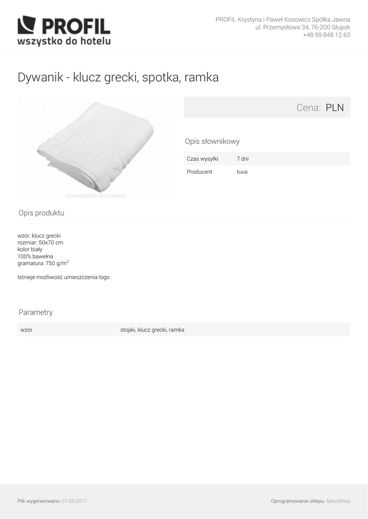 PROFIL Krystyna i Paweł Kosowicz Spółka Jawna ul. Przemysłowa 34, 76-200 Słupsk +48 59 848 12 63 Dywanik - klucz grecki, spotka, ramka Cena: PLN Opis słownikowy Czas wysyłki 7 dni Producent tuva Opis produktu wzór: klucz grecki rozmiar: 50x70 cm kolor biały 100% bawełna gramatura: 750 g/m2 Istnieje możliwość umieszczenia logo. Parametry wzór Plik wygenerowano: 07-03-2017 Powered by TCPDF (www.tcpdf.org) stopki, klucz grecki, ramka Oprogramowanie sklepu: AptusShop