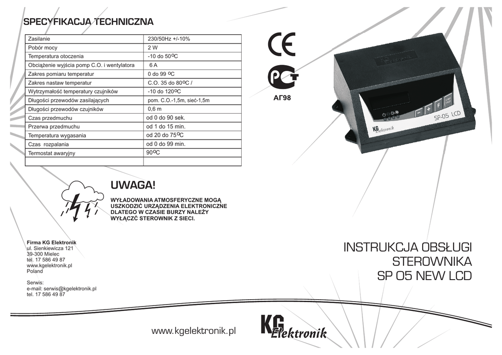 SPECYFIKACJA TECHNICZNA Zasilanie 230/50Hz +/-10% Pobór mocy 2W Temperatura otoczenia -10 do 50 oC Obci¹¿enie wyjœcia pomp C.O. i wentylatora 6A 0 do 99 oC Zakres pomiaru temperatur Wytrzyma³oœæ temperatury czujników C.O. 35 do 80 oC / -10 do 120 oC D³ugoœci przewodów zasilaj¹cych pom. C.O.-1,5m, sieæ-1,5m D³ugoœci przewodów czujników 0,6 m Czas przedmuchu od 0 do 90 sek. od 1 do 15 min. od 20 do 75 oC od 0 do 99 min. 90 oC Zakres nastaw temperatur Przerwa przedmuchu Temperatura wygasania Czas rozpalania Termostat awaryjny UWAGA! WY£ADOWANIA ATMOSFERYCZNE MOG¥ USZKODZIÆ URZ¥DZENIA ELEKTRONICZNE DLATEGO W CZASIE BURZY NALE¯Y WY£¥CZÆ STEROWNIK Z SIECI. Firma KG Elektronik ul. Sienkiewicza 121 39-300 Mielec tel. 17 586 49 87 www.kgelektronik.pl Poland INSTRUKCJA OBS£UGI STEROWNIKA SP 05 NEW LCD Serwis: e-mail: [email protected] tel. 17 586 49 87 www.kgelektronik.pl Elektronik OPIS STEROWNIKA znaczenie symboli: - stop - pompa C.O. - dmuchawa klawisz plus klawisz menu F klawisz minus klawisz start/stop Zasada dzia³ania Sterownik SP 05 NEW LCD steruje pomp¹ C.O. oraz wentylatorem nadmuchowym. Przeznaczony jest do sterowania kot³ami na paliwo sta³e. drewno, wêgiel, mia³. U¿ytkownik ma do wyboru 5 wersji trybów pracy sterownika uwarunkowanych rodzajem opa³u oraz typem kot³a. Pierwsz¹ czynnoœæ jak¹ musi wykonaæ u¿ytkownik przed rozpoczêciem eksploatacji sterownika jest ustawienie temperatury pieca, jak¹ ma utrzymywaæ sterownik podczas pracy kot³a oraz wybraæ tryb pracy sterownika w menu (F). Funkcja F1 drewno oraz wêgiel (p³ynna moc dmuchawy) Funkcja F2 drewno (moc dmuchawy 20% + przedmuchy) Funkcja F3 wêgiel (moc dmuchawy 50% + przedmuchy) Funkcja F4 mia³ (moc dmuchawy 100% + przedmuchy) Funkcja F5 ustawienia w³asne W funkcjach od F1 do F4 , tj. moc dmuchawy, temperaturê za³¹czenia pompy C.O. oraz temperaturê wygasania pieca, sterownik dostosowuje automatycznie dziêki zastosowaniu algorytmu control smart. Moc dmuchawy jest zmniejszana w funkcji F1, kiedy temperatura kot³a zbli¿a siê do zadanej przez u¿ytkownika temperatury pieca. Wygaszanie kot³a mieœci siê w przedziale od 35 oC do 50oC, Pompa C.O. jest za³¹czana w przedziale od 30 oC do 40oC, w zale¿noœci od zadanej temperatury pieca. Funkcja F5 pozwala indywidualnie wed³ug potrzeb regulowaæ wszystkie parametry pracy sterownika tj. temp. Za³¹czenia pompy C.O., moc wentylatora, przerwy oraz d³ugoœæ przedmuchu, temp. rozpalania oraz czas wygasania kot³a. OBS£UGA STEROWNIKA Po w³¹czeniu zasilania sterownik automatycznie przechodzi w tryb rozpalania. Do menu sterownika wchodzimy naciskaj¹c klawisz [F]. Na wyœwietlaczu pojawi siê pulsuj¹ca temperatura zadana kot³a, mamy wówczas mo¿liwoœæ ustawienia ¿¹danej temperatury jak¹ sterownik ma utrzymywaæ - klawiszami [+] lub [-] Po ustawieniu ¿¹danej temperatury ponownie wciskamy przycisk [F] . Na wyœwietlaczu pojawi siê tryb pracy sterownika wybrany aktualnie. Nastêpnie wybieramy funkcje, która nas interesuje klawiszami [+] lub [-]. Po wybraniu ¿¹danej funkcji sterownik sam wróci do pracy .W przypadku funkcji F5 nale¿y wcisn¹æ klawisz [F] aby przejœæ do indywidualnych ustawieñ u¿ytkownika. Pojawi¹ siê nam kolejno funkcje: C-temp za³¹czenia pompy C.O. D-moc wentylatora 1-czas przedmuchu 2-przerwa przedmuchu 3-temperatura wygasania 4-czas rozpalania Wejœcie do menu nastêpuje po przyciœniêciu przycisku [F], natomiast wartoœci ustawiamy klawiszami [+] lub [-] Po ustawieniu ¿¹danych wartoœci sterownik zapamiêta je i po kilku sekundach sam wróci do pracy. Sterownik wyposa¿ony jest w alarm sygnalizuj¹cy zbyt wysoka temperaturê kot³a (90 oC). Funkcja Anty stop zapobiega zastaniu siê pompy poza sezonem grzewczym uruchamiaj¹c j¹ co 14 dni na 15 sekund. Funkcja Anty Zamarzanie za³¹cza pompê C.O. w przypadku gdy temperatura cieczy w obiegu spadnie poni¿ej 5 oC Blokada Dmuchawy i start pracy dmuchawy: Aby zablokowaæ wentylator nale¿y wcisn¹æ przycisk [start/stop] . Na wyœwietlaczu pojawi siê komunikat blokada dmuchawy (menu w tym czasie nie jest dostêpne). Aby odblokowaæ dmuchawê nale¿y ponownie wcisn¹æ przycisk [start/stop] Za³¹czenie pompy C.O. do pracy ci¹g³ej: Aby za³¹czyæ pompê C.O. do pracy ci¹g³ej nale¿y wcisn¹æ i przytrzymaæ przez oko³o 3 sek. klawisz[F] oraz [+]. Pompa bêdzie pracowaæ do chwili a¿ u¿ytkownik ponownie przytrzyma klawisz [F] oraz [+] lub do wy³¹czenia zasilania g³ównym wy³¹cznikiem. Opcje serwisowe W opcjach serwisowych mo¿na zmieniæ typ i moc dmuchawy podczas rozpalania dla funkcji F1. Wejœcie w opcje serwisowe jest mo¿liwe po wy³¹czeniu zasilania i po ponownym w³¹czeniu przytrzymuj¹c jednoczeœnie klawisze [+] i [-] Dostêpne typy dmuchaw: 1- DMUCHAWA WPA120 2- DMUCHAWA DP-01, DP-02 3- DMUCHAWA RV-14 4- DMUCHAWA DP-120 Maksymalna moc dmuchawy podczas rozpalania tylko dla funkcji F1 w menu. Po ustawieniu typu i mocy dmuchawy, sterownik automatycznie przejdzie do pracy na zadanych w opcjach serwisowych parametrach, po 5 sekundach. Sposób monta¿u Monta¿u powinna dokonaæ osoba posiadaj¹ca odpowiednie uprawnienia elektryczne!. Czujnik powinien zostaæ umocowany na wyjœciu z kot³a przy pomocy opaski zaciskowej i odizolowany od czynników zewnêtrznych za pomoc¹ taœmy izolacyjnej (nie mo¿e byæ zanurzony w ¿adnym p³ynie). Przewód zasilaj¹cy Informacja o pozbywaniu siê urz¹dzeñ elektrycznych i elektronicznych Przedstawiony symbol umieszczony na produktach lub do³¹czonej do nich dokumentacji informuje, ¿e niesprawnych urz¹dzeñ elektrycznych lub elektronicznych nie mo¿na wyrzucaæ razem z odpadami gospodarczymi. Prawid³owe postêpowanie w razie koniecznoœci utylizacji, powtórnego u¿ycia lub odzysku podzespo³ów polega na przekazaniu urz¹dzenia do wyspecjalizowanego punktu zbiórki, gdzie bêdzie przyjête bezp³atnie. W niektórych krajach produkt mo¿na oddac lokalnemu dystrybutorowi podczas zakupu