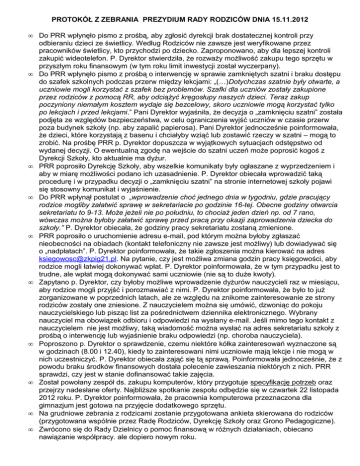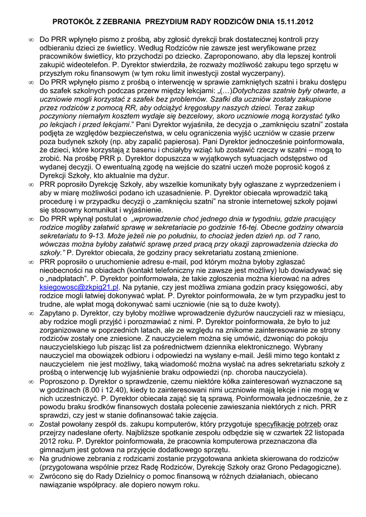 PROTOKÓŁ Z ZEBRANIA PREZYDIUM RADY RODZICÓW DNIA 15.11.2012 • • • • • • • • • • Do PRR wpłynęło pismo z prośbą, aby zgłosić dyrekcji brak dostatecznej kontroli przy odbieraniu dzieci ze świetlicy. Według Rodziców nie zawsze jest weryfikowane przez pracowników świetlicy, kto przychodzi po dziecko. Zaproponowano, aby dla lepszej kontroli zakupić wideotelefon. P. Dyrektor stwierdziła, że rozważy możliwość zakupu tego sprzętu w przyszłym roku finansowym (w tym roku limit inwestycji został wyczerpany). Do PRR wpłynęło pismo z prośbą o interwencję w sprawie zamkniętych szatni i braku dostępu do szafek szkolnych podczas przerw między lekcjami: „(…)Dotychczas szatnie były otwarte, a uczniowie mogli korzystać z szafek bez problemów. Szafki dla uczniów zostały zakupione przez rodziców z pomocą RR, aby odciążyć kręgosłupy naszych dzieci. Teraz zakup poczyniony niemałym kosztem wydaje się bezcelowy, skoro uczniowie mogą korzystać tylko po lekcjach i przed lekcjami.” Pani Dyrektor wyjaśniła, że decyzja o „zamknięciu szatni” została podjęta ze względów bezpieczeństwa, w celu ograniczenia wyjść uczniów w czasie przerw poza budynek szkoły (np. aby zapalić papierosa). Pani Dyrektor jednocześnie poinformowała, że dzieci, które korzystają z basenu i chciałyby wziąć lub zostawić rzeczy w szatni – mogą to zrobić. Na prośbę PRR p. Dyrektor dopuszcza w wyjątkowych sytuacjach odstępstwo od wydanej decyzji. O ewentualną zgodę na wejście do szatni uczeń może poprosić kogoś z Dyrekcji Szkoły, kto aktualnie ma dyżur. PRR poprosiło Dyrekcję Szkoły, aby wszelkie komunikaty były ogłaszane z wyprzedzeniem i aby w miarę możliwości podano ich uzasadnienie. P. Dyrektor obiecała wprowadzić taką procedurę i w przypadku decyzji o „zamknięciu szatni” na stronie internetowej szkoły pojawi się stosowny komunikat i wyjaśnienie. Do PRR wpłynął postulat o „wprowadzenie choć jednego dnia w tygodniu, gdzie pracujący rodzice mogliby załatwić sprawę w sekretariacie po godzinie 16-tej. Obecne godziny otwarcia sekretariatu to 9-13. Może jeżeli nie po południu, to chociaż jeden dzień np. od 7 rano, wówczas można byłoby załatwić sprawę przed pracą przy okazji zaprowadzenia dziecka do szkoły.” P. Dyrektor obiecała, że godziny pracy sekretariatu zostaną zmienione. PRR poprosiło o uruchomienie adresu e-mail, pod którym można byłoby zgłaszać nieobecności na obiadach (kontakt telefoniczny nie zawsze jest możliwy) lub dowiadywać się o „nadpłatach”. P. Dyrektor poinformowała, że takie zgłoszenia można kierować na adres [email protected]. Na pytanie, czy jest możliwa zmiana godzin pracy księgowości, aby rodzice mogli łatwiej dokonywać wpłat. P. Dyrektor poinformowała, że w tym przypadku jest to trudne, ale wpłat mogą dokonywać sami uczniowie (nie są to duże kwoty). Zapytano p. Dyrektor, czy byłoby możliwe wprowadzenie dyżurów nauczycieli raz w miesiącu, aby rodzice mogli przyjść i porozmawiać z nimi. P. Dyrektor poinformowała, że było to już zorganizowane w poprzednich latach, ale ze względu na znikome zainteresowanie ze strony rodziców zostały one zniesione. Z nauczycielem można się umówić, dzwoniąc do pokoju nauczycielskiego lub pisząc list za pośrednictwem dziennika elektronicznego. Wybrany nauczyciel ma obowiązek odbioru i odpowiedzi na wysłany e-mail. Jeśli mimo tego kontakt z nauczycielem nie jest możliwy, taką wiadomość można wysłać na adres sekretariatu szkoły z prośbą o interwencję lub wyjaśnienie braku odpowiedzi (np. choroba nauczyciela). Poproszono p. Dyrektor o sprawdzenie, czemu niektóre kółka zainteresowań wyznaczone są w godzinach (8.00 i 12.40), kiedy to zainteresowani nimi uczniowie mają lekcje i nie mogą w nich uczestniczyć. P. Dyrektor obiecała zająć się tą sprawą. Poinformowała jednocześnie, że z powodu braku środków finansowych dostała polecenie zawieszania niektórych z nich. PRR sprawdzi, czy jest w stanie dofinansować takie zajęcia. Został powołany zespół ds. zakupu komputerów, który przygotuje specyfikację potrzeb oraz przejrzy nadesłane oferty. Najbliższe spotkanie zespołu odbędzie się w czwartek 22 listopada 2012 roku. P. Dyrektor poinformowała, że pracownia komputerowa przeznaczona dla gimnazjum jest gotowa na przyjęcie dodatkowego sprzętu. Na grudniowe zebrania z rodzicami zostanie przygotowana ankieta skierowana do rodziców (przygotowana wspólnie przez Radę Rodziców, Dyrekcję Szkoły oraz Grono Pedagogiczne). Zwrócono się do Rady Dzielnicy o pomoc finansową w różnych działaniach, obiecano nawiązanie współpracy. ale dopiero nowym roku. • • • • Zwrócono się do LWSM „Morena” z prośbą o pomoc w naprawie i uprzątnięciu boiska szkolnego. RR została poinformowana, że boiskiem zarządza UM i Spółdzielnia nie może nic z tym zrobić. Do Dyrekcji Szkoły wpłynęła propozycja z banku PKO BP SA, aby wprowadzić program SKO, między innymi dzięki temu programowi RR mogłaby zmodyfikować swoje konto (obniżenie kosztów, dostęp elektroniczny, itp.). Niestety, w szkole nie znalazła się osoba, która społecznie zajęłaby się tym programem. PRR musi znaleźć inny sposób na unowocześnienie swojego konta lub poszukać banku, który takie modyfikacje zaproponuje. RR złożyła zamówienie w szkolnej modelarni na wykonanie modeli, które będą uczestniczyć w konkursach i promować, reklamować Szkołę, w zamian za to opiekun modelarni zwiększył częstotliwość spotkań o jeden dzień (środa). Zostały rozesłane do najbliższych marketów budowlanych prośby o wsparcie finansowe w zamian za reklamowanie ofiarodawcy na stronie internetowej, tablicy ogłoszeniowej RR i w okolicy modelarni. RR nie dostała jeszcze odpowiedzi. P. Dyrektor poinformowała jednocześnie, że na ew. reklamy, które byłyby rozwieszane 