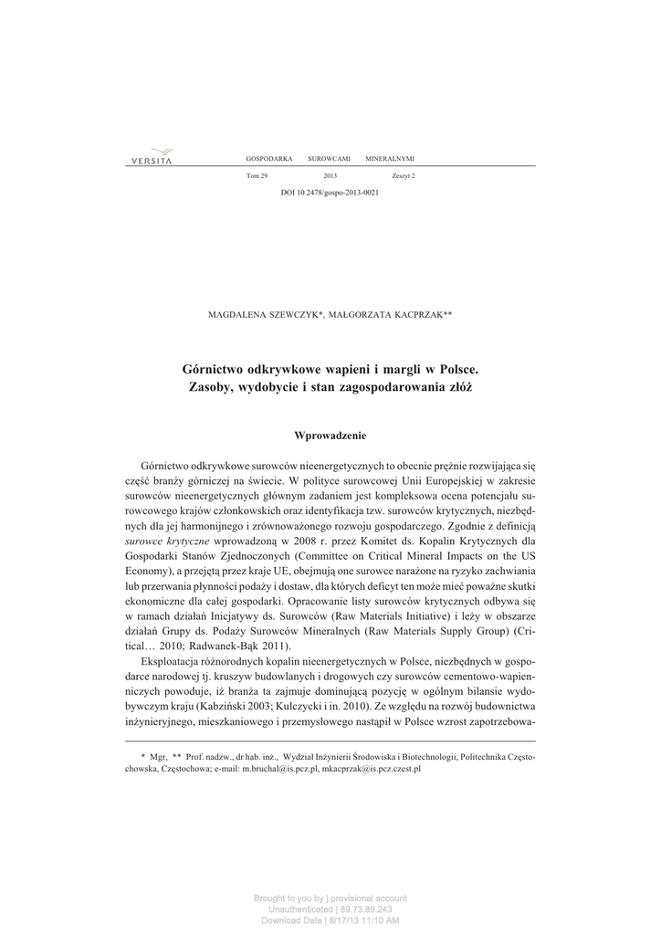 GOSPODARKA Tom 29 SUROWCAMI MINERALNYMI 2013 Zeszyt 2 DOI 10.2478/gospo-2013-0021 MAGDALENA SZEWCZYK*, MA£GORZATA KACPRZAK** Górnictwo odkrywkowe wapieni i margli w Polsce. Zasoby, wydobycie i stan zagospodarowania z³ó¿ Wprowadzenie Górnictwo odkrywkowe surowców nieenergetycznych to obecnie prê¿nie rozwijaj¹ca siê czêœæ bran¿y górniczej na œwiecie. W polityce surowcowej Unii Europejskiej w zakresie surowców nieenergetycznych g³ównym zadaniem jest kompleksowa ocena potencja³u surowcowego krajów cz³onkowskich oraz identyfikacja tzw. surowców krytycznych, niezbêdnych dla jej harmonijnego i zrównowa¿onego rozwoju gospodarczego. Zgodnie z definicj¹ surowce krytyczne wprowadzon¹ w 2008 r. przez Komitet ds. Kopalin Krytycznych dla Gospodarki Stanów Zjednoczonych (Committee on Critical Mineral Impacts on the US Economy), a przejêt¹ przez kraje UE, obejmuj¹ one surowce nara¿one na ryzyko zachwiania lub przerwania p³ynnoœci poda¿y i dostaw, dla których deficyt ten mo¿e mieæ powa¿ne skutki ekonomiczne dla ca³ej gospodarki. Opracowanie listy surowców krytycznych odbywa siê w ramach dzia³añ Inicjatywy ds. Surowców (Raw Materials Initiative) i le¿y w obszarze dzia³añ Grupy ds. Poda¿y Surowców Mineralnych (Raw Materials Supply Group) (Critical… 2010; Radwanek-B¹k 2011). Eksploatacja ró¿norodnych kopalin nieenergetycznych w Polsce, niezbêdnych w gospodarce narodowej tj. kruszyw budowlanych i drogowych czy surowców cementowo-wapienniczych powoduje, i¿ bran¿a ta zajmuje dominuj¹c¹ pozycjê w ogólnym bilansie wydobywczym kraju (Kabziñski 2003; Kulczycki i in. 2010). Ze wzglêdu na rozwój budownictwa in¿ynieryjnego, mieszkaniowego i przemys³owego nast¹pi³ w Polsce wzrost zapotrzebowa* Mgr, ** Prof. nadzw., dr hab. in¿., Wydzia³ In¿ynierii Œrodowiska i Biotechnologii, Politechnika Czêstochowska, Czêstochowa; e-mail: [email protected], [email protected] Brought to you by | provisional account Unauthenticated | 89.73.89.243 Download Date | 8/17/13 11:10 AM 70 nia na surowce wêglanowe m.in. wapienie i margle. W gospodarce surowcami mineralnymi w Polsce jak i Unii Europejskiej zasoby wapieni i margli wystêpuj¹ na znacznym poziomie i nie s¹ zagro¿one ryzkiem niedoboru lub braku poda¿y. Pod wzglêdem stopnia krytycznoœci dla gospodarki UE zalicza siê je do trzeciej grupy surowców, czyli posiadaj¹cych istotne znaczenie ekonomiczne (Christmann 2010; Radwanek-B¹k 2011). W Polsce surowce wêglanowe wystêpuj¹ doœæ powszechnie w czterech regionach: opolskim, krakowsko-czêstochowsko-wieluñskim, œwiêtokrzyskim i lubelskim (PIG). W bilansie zasobów kopalin (2011) zasoby wapieni dzieli siê na trzy typy surowcowe: — wapienie i margle dla przemys³u cementowego – 12 608 mln t, — wapienie dla przemys³u wapienniczego – 5519 mln t, — ró¿ne odmiany wapieni wykorzystywane jako kamienie budowlane i drogowe – rzêdu 1900 mln t. Odkrywkowe zak³ady górnicze wydobywaj¹ce wapienie i margle obejmuj¹ swym zasiêgiem i wp³ywami powierzchnie nawet kilkuset hektarów. Wyrobiska w przewa¿aj¹cej czêœci wg³êbne, rzadziej stokowe i stokowo-wg³êbne, posiadaj¹ g³êbokoœæ od kilku do kilkudziesiêciu metrów. W wiêkszoœci zak³adów kopalina urabiana jest za pomoc¹ robót strza³owych lub zrywania mechanicznego przy zastosowaniu koparek jednonaczyniowych (hydraulicznych i linowych) oraz ³adowarek. Maszynami pomocniczymi s¹ spycharki, w nielicznych przypadkach – zgarniarki, wykorzystywane do robót przygotowawczych i udostêpniaj¹cych. W wiêkszoœci zak³adów urobek ³adowany jest bezpoœrednio na samochody technologiczne i transportowany na miejsce dalszej przeróbki (Dreszer 2003; Kulczycki i in. 2010). Zak³ady górnicze wydobywaj¹ce wapienie i margle na potrzeby bran¿y cementowo-wapienniczej prawie w 100% s¹ sprywatyzowane. W³aœcicielami kopalñ w tej bran¿y s¹ renomowane europejskie i œwiatowe firmy: Lafarge, Heidelberg, Dyckerhoff, CHR, Lhoist i inne (Kozio³, Uberman 2001). Celem niniejszego artyku³u jest analiza zasobów wapieni i margli, wielkoœci wydobycia oraz zagospodarowanie terenów z³ó¿ kopalin na przestrzeni lat 2007–2011. 1. Zasoby wapieni i margli w skali kraju Znane zasoby wapieni i magli w po³udniowej i centralnej Polsce nie przekraczaj¹ 19 mln ton. Wed³ug bilansu zasobowego PIG geologiczne zasoby wapieni i margli wynosi³y w 2011 roku oko³o 18 156 mln ton (tab. 1), w tym oko³o 12 550 mln t obejmowa³o 71 z³ó¿ udokumentowanych dla przemys³u cementowego, a 5606 mln t 116 z³ó¿ dla przemys³u wapienniczego. W porównaniu z rokiem poprzednim potencja³ zasobowy rozpoznanych z³ó¿ wapieni w Polsce w nieznacznym stopniu uleg³ zmianie i na koniec 2011 r. odnotowano spadek o oko³o 187 tys. t zasobów bilansowych uwarunkowany skreœlaniem dwóch z³ó¿ z bilansu w 2010 r., powstaj¹cymi ubytkami wynikaj¹cymi z: wydobycia prowadzonego w kopalniach odkrywkowych, wydzieleniem z granic z³ó¿ istniej¹cych czy aktualizacji zasobów z³ó¿. Brought to you by | provisional account Unauthenticated | 89.73.89.243 Download Date | 8/17/13 11:10 AM 71 TABELA 1 Zasoby z³ó¿ wapieni i margli wed³ug stanu na 31.12.2011r. [tys. ton] TABLE 1 Resources of limestone and marl as at 31.12.2011 [thous. tonnes] Z³o¿a udokumentowane Województwo Zasoby Liczba z³ó¿ bilansowe Dolnoœl¹skie Kujawsko-pomorskie 14 427 497 przemys³owe 294 100 1 981 851 545 841 Lubelskie 18 3 432 352 179 008 £ódzkie 23 2 533 391 42 050 Ma³opolskie 10 470 968 43 742 Mazowieckie 9 1 509 902 86 498 Opolskie 13 1 432 732 851 673 Œl¹skie 32 1 366 948 40 214 Œwiêtokrzyskie 53 5 573 949 1 072 567 Podkarpackie 6 258 997 – Zachodniopomorskie 2 168 022 – 181 18 156 609 Polska 3 155 693 Zasobami bilansowymi z³ó¿ udokumentowanych ponad 1 mln ton dysponuje a¿ szeœæ województw (tab. 1), a zasoby przemys³owe na koniec 2011 r. stanowi³y tylko 17% znanych i udokumentowanych zasobów bilansowych. Najmn