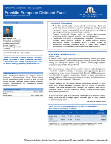 KOMENTARZ MIESIĘCZNY | 30 kwietnia 2014 r. Franklin European Dividend Fund Franklin Templeton Investment Funds Zespół inwestycyjny KLUCZOWE ZAGADNIENIA • W kwietniu, oznaki ciągłej poprawy sytuacji ekonomicznej, solidne zyski spółek oraz rosnąca dynamika w obszarze fuzji i przejęć na całym świecie stymulowały wzrosty na europejskich rynkach akcji, pomimo narastającego napięcia geopolitycznego pomiędzy Rosją a Ukrainą. • Fundusz wypracował słabszy wynik od indeksu porównawczego, a niekorzystny wpływ na wynik względny miała selekcja papierów. • Przeważenie energetyki i niedoważenie technologii informatycznych zawyżyło wynik względny funduszu. Z punktu widzenia struktury geograficznej portfela, przeważenie Włoch i Irlandii okazało się niekorzystne, natomiast pozytywny wpływ na stopę zwrotu funduszu w porównaniu z benchmarkiem miało przeważenie Wielkiej Brytanii. Uwe Zoellner, CFA Szef zespołu ds. akcji spółek europejskich, zarządzający portfelami inwestycyjnymi, Franklin Templeton Investment Management Ltd. – Frankfurt oraz Tim Burkhardt, CFA i Stephen Flynn „Bieżącą wzmożoną zmienność rynkową, wynikającą przede wszystkim z obaw inwestorów związanych z wydarzeniami poza Europą, postrzegamy jako okazję do otwarcia atrakcyjnych pozycji długoterminowych.” Opis funduszu Celem inwestycyjnym funduszu jest osiąganie dochodów bieżących i długoterminowego wzrostu wartości kapitału poprzez inwestowanie przede wszystkim w akcje i/lub inne papiery powiązane z kapitałem spółek o dowolnej kapitalizacji rynkowej, zarejestrowanych lub prowadzących kluczową działalność w Europie. Informacje o funduszu Data utworzenia Indeks porównawczy 29 lipca 2011 r. MSCI Europe Index KOMENTARZ ZARZĄDZAJĄCYCH Analiza rynku W kwietniu, oznaki ciągłej poprawy sytuacji ekonomicznej, solidne zyski spółek oraz rosnąca dynamika w obszarze fuzji i przejęć na całym świecie stymulowały wzrosty na europejskich rynkach akcji, pomimo narastającego napięcia geopolitycznego pomiędzy Rosją a Ukrainą. Dane ekonomiczne, a w szczególności kwietniowe dane o produkcji regionalnej i niemieckie wskaźniki nastrojów w biznesie, nadal sygnalizowały powolne przyspieszenie tempa wzrostu. Europejski Bank Centralny (EBC) zasugerował swą skłonność do podjęcia dodatkowych działań na rzecz przyspieszenia wzrostu i ożywienia inflacji, która utrzymywała się znacznie poniżej zakładanego przez EBC 2-procentowego celu inflacyjnego. Ponadto, podczas gdy rentowność obligacji skarbowych pozostała w wielu peryferyjnych krajach eurolandu względnie niska po odbiciu w pierwszym kwartale, rynki nadal optymistycznie zakładały, że najgorszy etap kryzysu zadłużenia minął, a reformy strukturalne zaczęły podnosić konkurencyjność poszczególnych gospodarek. W takich warunkach, rynki akcji w Norwegii, Wielkiej Brytanii, Hiszpanii i Francji radziły sobie lepiej na tle całego regionu, natomiast rynki w Grecji, Holandii i Austrii zanotowały spadki. (ciąg dalszy na następnej stronie) Wyniki netto (po opłatach za zarządzanie) na dzień 30 kwietnia 2014 r. (przy założeniu reinwestycji dywidend)*1 1 m-c 3 m-ce 1 r. 3 l. Od dnia utworzenia (29 lipca 2011 r.) 10 l. A(Ydis) EUR 1.30% 7.12% 16.96% - - 13.60% Indeks porównawczy 2.00% 6.10% 16.88% - - 12.63% *Okresy dłuższe niż 1 rok pokazane są jako średnioroczne całkowite stopy zwrotu. Opłaty, prowizje, podatki i inne koszty poniesione przez inwestora nie są uwzględnione w obliczeniach. Wyłącznie do użytku dystrybutorów i pośredników instytucjonalnych. Nie rozpowszechniać wśród inwestorów indywidualnych. Franklin European Dividend Fund (ciąg dalszy) KOMENTARZ MIESIĘCZNY | 30 kwietnia 2014 r. Analiza wyników Fundusz wypracował w kwietniu słabszy wynik od indeksu porównawczego, a niekorzystny wpływ na wynik względny miała selekcja papierów. W sektorze dóbr luksusowych, wynik względny funduszu w największym stopniu zaniżyła pozycja niemieckiej spółki TAKKT zajmującej się sprzedażą wysyłkową różnych artykułów handlowych dla firm i mającej dominującą pozycję w branży na większości rynków europejskich i północnoamerykańskich. Uważamy, że największym atutem TAKKT świadczącym o konkurencyjności tej spółki jest unikalna i rozległa baza odbiorców – kierowników ds. zaopatrzenia. Jeżeli chodzi o sektor finansowy, niekorzystny wpływ na wynik względny miała pozycja prywatnego włoskiego banku Banca Generali, który zanotował w kwietniu korektę po solidnym odbiciu. Naszym zdaniem, bank ten znacząco wyróżnia się na tle słabego włoskiego sektora bankowego dzięki solidnej marce, rozważnemu zarządzaniu i rosnącej rentowności. Pozycje Euler Hermes (francuskiego ubezpieczyciela kredytów handlowych) oraz Zurich Insurance Group (szwajcarskiej spółki z branży usług finansowych) także zaniżyły stopę zwrotu funduszu względem indeksu porównawczego. W sektorze usług komunalnych, niekorzystny wpływ na wynik względny miała inwestycja w papiery francuskiej spółki GDF Suez. Akcje międzynarodowego koncernu energetycznego znalazły się w minionym miesiącu pod wzmożoną presją, po publikacji danych za pierwszy kwartał wykazujących spadek zysków. Nasze długoterminowe prognozy dla tej spółki nadal są jednak optymistyczne. Z drugiej strony, inna pozycja z sektora energetycznego, czyli Royal Dutch Shell, znalazła się wśród inwestycji, które w największym stopniu zawyżyły miesięczny wynik funduszu w ujęciu względnym. Naszym zdaniem, brytyjskie niezależne przedsiębiorstwo z branży ropy i gazu ma jeden z najbardziej atrakcyjnych portfeli zasobów związanych z eksploracją złóż i produkcją w całym sektorze. Korzystny wpływ na wynik względny funduszu w tym sektorze miała także pozycja TGS-NOPEC Geophysical – norweskiego dostawcy danych geologicznych dla przedsiębiorstw zajmujących się ek