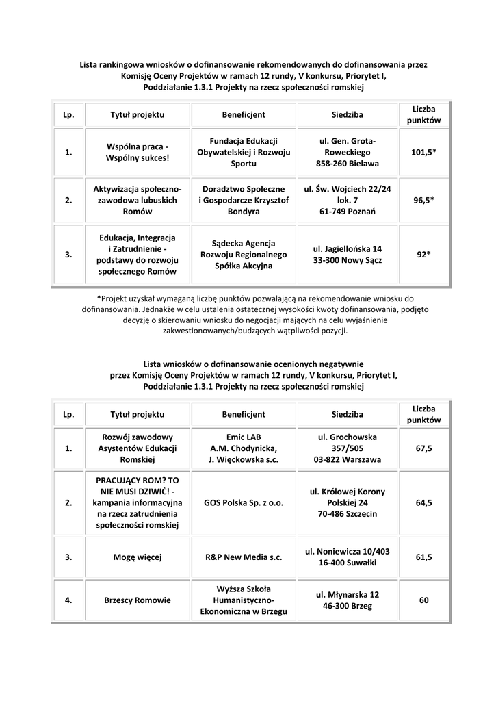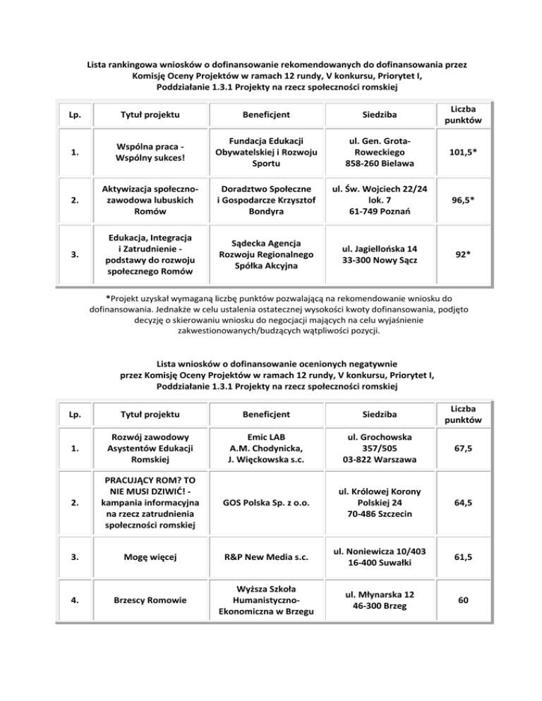 Lista rankingowa wniosków o dofinansowanie rekomendowanych do dofinansowania przez Komisję Oceny Projektów w ramach 12 rundy, V konkursu, Priorytet I, Poddziałanie 1.3.1 Projekty na rzecz społeczności romskiej Lp. Tytuł projektu Beneficjent Siedziba Liczba punktów 1. Wspólna praca Wspólny sukces! Fundacja Edukacji Obywatelskiej i Rozwoju Sportu ul. Gen. GrotaRoweckiego 858-260 Bielawa 101,5* 2. Aktywizacja społecznozawodowa lubuskich Romów Doradztwo Społeczne i Gospodarcze Krzysztof Bondyra ul. Św. Wojciech 22/24 lok. 7 61-749 Poznań 96,5* 3. Edukacja, Integracja i Zatrudnienie podstawy do rozwoju społecznego Romów Sądecka Agencja Rozwoju Regionalnego Spółka Akcyjna ul. Jagiellońska 14 33-300 Nowy Sącz 92* *Projekt uzyskał wymaganą liczbę punktów pozwalającą na rekomendowanie wniosku do dofinansowania. Jednakże w celu ustalenia ostatecznej wysokości kwoty dofinansowania, podjęto decyzję o skierowaniu wniosku do negocjacji mających na celu wyjaśnienie zakwestionowanych/budzących wątpliwości pozycji. Lista wniosków o dofinansowanie ocenionych negatywnie przez Komisję Oceny Projektów w ramach 12 rundy, V konkursu, Priorytet I, Poddziałanie 1.3.1 Projekty na rzecz społeczności romskiej Lp. Tytuł projektu Beneficjent Siedziba Liczba punktów 1. Rozwój zawodowy Asystentów Edukacji Romskiej Emic LAB A.M. Chodynicka, J. Więckowska s.c. ul. Grochowska 357/505 03-822 Warszawa 67,5 2. PRACUJĄCY ROM? TO NIE MUSI DZIWIĆ! kampania informacyjna na rzecz zatrudnienia społeczności romskiej GOS Polska Sp. z o.o. ul. Królowej Korony Polskiej 24 70-486 Szczecin 64,5 3. Mogę więcej R&P New Media s.c. ul. Noniewicza 10/403 16-400 Suwałki 61,5 Brzescy Romowie Wyższa Szkoła HumanistycznoEkonomiczna w Brzegu ul. Młynarska 12 46-300 Brzeg 60 4. 5. Brochowskie Centrum Aktywizacji SpołecznoZawodowej Gmina Wrocław/Centrum Informacji i Rozwoju Społecznego Plac Nowy Targ 1-8 50-141 Wrocław 58 6. Współczesne Kobiety Romskie Fundacja Kobieca Pracownia ul. Bażancia 45 lok. B 02-892 Warszawa 43 7. Romanies na uczelniach Fundacja Integracji Społecznej Prom ul. Bajana 15/26 54-129 Wrocław 0*** 8. Czas na zmiany II Stowarzyszenie Promocji Zdrowia i Pomocy Rodzinie "Równe Szanse" ul. Legionów 40a/4 87-100 Toruń 0** 9. Urzędnik świadomy różnic kulturowych Centrum Badań Stosowanych Ultex Ankieter Sp. z o.o. u. Reymonta 27/6 60-791 Poznań 0*** 10. Cygani wieczni wędrowcy. Promocja kultury i tradycji romskiej na Lubelszczyźnie Fundacja Centrum Rozwoju Lokalnego ul. Unicka 4/206 20-126 Lublin 0** Projekty negatywnie ocenione nie uzyskały wymaganej liczby punktów pozwalającej na rekomendowanie wniosków do dofinansowania – nie uzyskały średniej arytmetycznej z dwóch ocen na poziomie minimum 60 punktów ogółem lub minimum 60% punktów w poszczególnych częściach oceny merytorycznej. ** Projekt nie spełnia kryterium dostępu *** Projekt nie spełnia standardu minimum