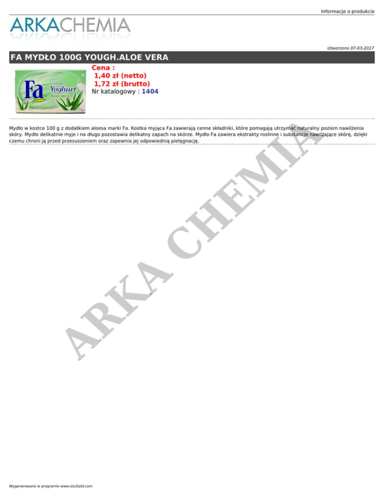 Informacje o produkcie Utworzono 07-03-2017 FA MYDŁO 100G YOUGH.ALOE VERA Cena : 1,40 zł (netto) 1,72 zł (brutto) Nr katalogowy : 1404 AR K A C H EM IA Mydło w kostce 100 g z dodatkiem aloesa marki Fa. Kostka myjąca Fa zawierają cenne składniki, które pomagają utrzymać naturalny poziom nawilżenia skóry. Mydło delikatnie myje i na długo pozostawia delikatny zapach na skórze. Mydło Fa zawiera ekstrakty roslinne i substancje nawilżające skórę, dzięki czemu chroni ją przed przesuszeniem oraz zapewnia jej odpowiednią pielęgnację. Wygenerowano w programie www.oscGold.com