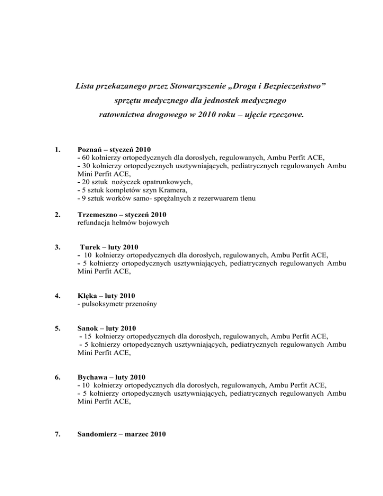 Lista przekazanego przez Stowarzyszenie „Droga i Bezpieczeństwo” sprzętu medycznego dla jednostek medycznego ratownictwa drogowego w 2010 roku – ujęcie rzeczowe. 1. Poznań – styczeń 2010 - 60 kołnierzy ortopedycznych dla dorosłych, regulowanych, Ambu Perfit ACE, - 30 kołnierzy ortopedycznych usztywniających, pediatrycznych regulowanych Ambu Mini Perfit ACE, - 20 sztuk nożyczek opatrunkowych, - 5 sztuk kompletów szyn Kramera, - 9 sztuk worków samo- sprężalnych z rezerwuarem tlenu 2. Trzemeszno – styczeń 2010 refundacja hełmów bojowych 3. Turek – luty 2010 - 10 kołnierzy ortopedycznych dla dorosłych, regulowanych, Ambu Perfit ACE, - 5 kołnierzy ortopedycznych usztywniających, pediatrycznych regulowanych Ambu Mini Perfit ACE, 4. Klęka – luty 2010 - pulsoksymetr przenośny 5. Sanok – luty 2010 - 15 kołnierzy ortopedycznych dla dorosłych, regulowanych, Ambu Perfit ACE, - 5 kołnierzy ortopedycznych usztywniających, pediatrycznych regulowanych Ambu Mini Perfit ACE, 6. Bychawa – luty 2010 - 10 kołnierzy ortopedycznych dla dorosłych, regulowanych, Ambu Perfit ACE, - 5 kołnierzy ortopedycznych usztywniających, pediatrycznych regulowanych Ambu Mini Perfit ACE, 7. Sandomierz – marzec 2010 - 40 kołnierzy ortopedycznych dla dorosłych, regulowanych, Ambu Perfit ACE, - 30 kołnierzy ortopedycznych usztywniających, pediatrycznych regulowanych Ambu Mini Perfit ACE, 8. Grodzisk Wielkopolski – marzec 2010 - filtry bakteryjne – 5 sztuk, - rurki ustno-gardłowe – 1 sztuka, - opatrunki hydrożelowe 20x20 – 8 sztuk, - opatrunki hydrożelowe 10x10 – 10sztuk, - opatrunki osobiste – 3 sztuki, - opatrunek hydrożelowy na twarz – 2 sztuki, - siatka opatrunkowa CODOFIX rozmiar 1, 2, 3, 6 – łącznie 10 zstuk, - zestaw do tlenoterapii biernej dla dzieci – 2 kpl 9. Krzyż Wlkp.- kwiecień 2010 - 6 kołnierzy ortopedycznych dla dorosłych, regulowanych, Ambu Perfit ACE, - 2 kołnierze ortopedyczne usztywniające, pediatryczne, regulowanych Ambu Mini Perfit ACE, 10. Klimontów – kwiecień 2010 - torbę PSP R1 - szyny Kramera - 2 komplety 11. Łagów – kwiecień 2010 - deska ortopedyczna Spinal System Solution 12. Kozienice – kwiecień 2010 - 10 kołnierzy ortopedycznych dla dorosłych, regulowanych, Ambu Perfit ACE, - 5 kołnierze ortopedyczne usztywniające, pediatryczne, regulowanych Ambu Mini Perfit ACE 13. Śrem – maj 2010 - ssak elektryczny LCSU z pojemnikiem 800 ml. 14. Koronowo – maj 2010 - 10 kołnierzy ortopedycznych dla dorosłych, regulowanych, Ambu Perfit ACE, - 10 kołnierzy ortopedycznych usztywniających, pediatrycznych regulowanych Ambu Mini Perfit ACE, Poznań – czerwiec 2010 15. - bezcieniowa lampa operacyjna 16. Pleszew – czerwiec 2010 - zestaw pierwszej pomocy „Super Safety” – apteczka, trójkąt ostrzegawczy, kamizelka odblaskowa, całość wyposażenia według norm Unii Europejskiej. 17. Komorniki – czerwiec 2010 - zestaw pierwszej pomocy „Super Safety” – apteczka, trójkąt ostrzegawczy, kamizelka odblaskowa, całość wyposażenia według norm Unii Europejskiej. 18. Warszawa – czerwiec 2010 - zestaw pierwszej pomocy „Super Safety” – apteczka, trójkąt ostrzegawczy, kamizelka odblaskowa, całość wyposażenia według norm Unii Europejskiej. 19. Środa Wlkp. – lipiec 2010 - PAD-Pak – elektrody samoprzylepne ze zintegrowaną baterią - puls oksymetr monitorujący - środki do tamowania silnych krwotoków typu Quickclot - koc grzewczy z chemicznymi panelami, - znaczniki do stosowania w przypadku zdarzeń masowych, - zestaw do stabilizacji głowy do deski ortopedycznej 20. Grodzisk Wlkp. – lipiec 2010 - plecaki reanimacyjne – 2 sztuki - akumulator do defibrylatora ZOLL 21. Poznań – lipiec 2010 - 10 kołnierzy ortopedycznych dla dorosłych, regulowanych, Ambu Perfit ACE, 22. Dominowo – lipiec 2010 - zestaw pierwszej pomocy „Super Safety” – apteczka, trójkąt ostrzegawczy, kamizelka odblaskowa, całość wyposażenia według norm Unii Europejskiej. 23. Strzyżów – lipiec 2010 - 100 kołnierzy ortopedycznych dla dorosłych, regulowanych, Ambu Perfit ACE, - 15 kołnierzy ortopedycznych usztywniających, pediatrycznych regulowanych Ambu Mini Perfit ACE, 24. Poznań – sierpień 2010 - 10 kołnierzy ortopedycznych dla dorosłych, regulowanych, Ambu Perfit ACE, - zestaw pierwszej pomocy „Super Safety” – apteczka, trójkąt ostrzegawczy, kamizelka odblaskowa, całość wyposażenia według norm Unii Europejskiej. 25. Poznań – wrzesień 2010 - zestaw pierwszej pomocy „Super Safety” – apteczka, trójkąt ostrzegawczy, kamizelka odblaskowa, całość wyposażenia według norm Unii Europejskiej – 2 sztuki 26. Łagów – wrzesień 2010 - torba PSP R1 27. Poznań – wrzesień 2010 - zestaw pierwszej pomocy „Super Safety” – apteczka, trójkąt ostrzegawczy, kamizelka odblaskowa, całość wyposażenia według norm Unii Europejskiej 28. Białystok – październik 2010 - 100 kołnierzy ortopedycznych dla dorosłych, regulowanych, Ambu Perfit ACE, - 20 kołnierzy ortopedycznych usztywniających, pediatrycznych regulowanych Ambu Mini Perfit ACE, 29. Poznań – grudzień 2010 - 520 kołnierzy ortopedycznych dla dorosłych, regulowanych, Ambu Perfit ACE, 30. Nakło n. Notecią – grudzień 2010 - Torba PSP R1 z wyposażeniem, deska ortopedyczna z unieruchomieniem głowy, szyny Kramera 31. Poznań – grudzień 2010 - Manekin Extri Kelly 32. Poznań – grudzień 2010 - zestaw pierwszej pomocy „Super Safety” – apteczka, trójkąt ostrzegawczy, kamizelka odblaskowa, całość wyposażenia według norm Unii Europejskiej – 2 sztuki 33. Poznań – grudzień 2010 - materace podciśnieniowe z pompką, pokrowcem i dodatkową podłogą – 10 sztuk