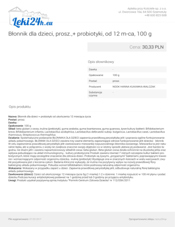Apteka przy Kościele sp. z o.o. ul. Dworcowa 16a, 64-500 Szamotuły +48 600 823 608 Błonnik dla dzieci, prosz.,+ probiotyki, od 12 m-ca, 100 g Cena: 30,33 PLN Opis słownikowy Dawka - Opakowanie 100 g Postać prosz. Producent NOOK HANNA KUKAWKA-WALCZAK Substancja czynna - Opis produktu Nazwa: Błonnik dla dzieci + probiotyki od ukończenia 12 miesiąca życia Postać: prosz. Dawka: Opakowanie: 100 g Skład: beta glukan z owsa, inulina (prebiotyk), guma arabska, guma ksantanowa, guma guarowa, żywe kultury bakterii: Bifidokacterium breve, Bifidobacterium infantis, Lactobacillus acidophilus, Lactobacillus delbrueckii subsp. bulgaricus, Lactobacillus casei, Lactobacillus rhamnosus, Streptococcus thermophilus Działanie: Systematyczne podawanie BŁONNIKA DLA DZIECI zapewnia prawidłową perystaltykę jelit i poprawia ogólne funkcjonowanie układu pokarmowego. BŁONNIK DLA DZIECI zawiera trzy ważne elementy zapewniające zdrowe funkcjonowanie jelit dziecka:- błonnik W celu zapewnienia prawidłowej perystaltyki jelit zastosowano mieszankę rozpuszczalnego błonnika owsianego. Mieszanka ta jest naturalnie lepka, ale w połączeniu z wodą nie zwiększa znacznie swojej objętości co w istotny sposób ułatwia jej podawanie. Jest bardzo łagodna, nie drażni jelit i zawiera najwartościowszy składnik owsa: beta-glukan. Beta-glukan owsa działa ochronnie na śluzówkę jelita oraz wpływa pobudzająco na układ immunologiczny,- kultury probiotyczne Produkt zawiera również 7 różnych szczepów kultur bakterii probiotycznych, które mają szczególne znaczenie dla zdrowia dzieci. Probiotyki są żywymi, „przyjaznymi“ bakteriami, poprawiającymi trawienie i wzmacniającymi odporność organizmu dziecka,- inulinę (prebiotyk) Występuje ona w znacznych ilościach w wielu warzywach; zwykle pozyskiwana jest z korzenia cykorii. Badania kliniczne wykazały, że inulina ma pozytywny wpływ na rozwój prawidłowej flory bakteryjnej układu pokarmowego. Pobudza wzrost bifidobakterii, które podnoszą naturalną odporność organizmu. Wskazania: Wskazany w przypadku zaparć u dzieci. Zapewnia prawidłową perystaltykę jelit, odbudowuje naturalną florę bakteryjna układu pokarmowego. Dawkowanie (dzieci): Dzieci od ukończonego 12 miesiąca życia 5g (1 miarka) 1-2 x dziennie. 1 miarkę rozpuścić w 100 ml płynu i podać dziecku.Podczas kuracji antybiotykowej podawać na 1 godzinę przed lub 3 godziny po przyjęciu antybiotyku. Uwagi: Produkt uzyskał pozytywną opinię Instytutu "Pomnik-Centrum Zdrowia Dziecka" nr 112/DSK/2011 Plik wygenerowano: 07-03-2017 Powered by TCPDF (www.tcpdf.org) Oprogramowanie sklepu: AptusShop
