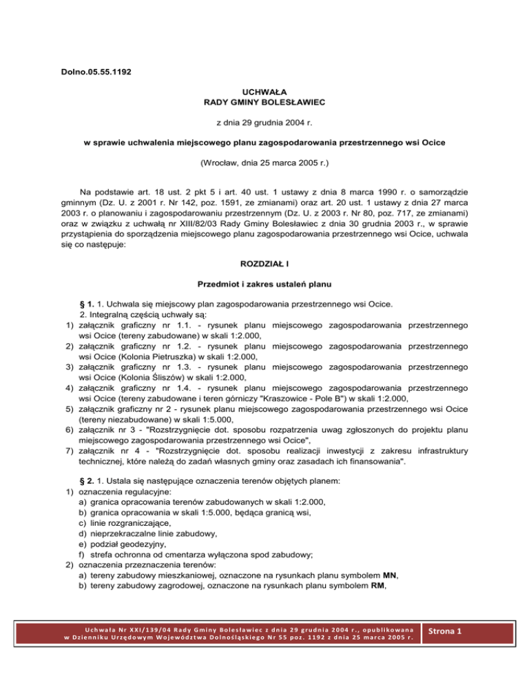 Dolno.05.55.1192 UCHWAŁA RADY GMINY BOLESŁAWIEC z dnia 29 grudnia 2004 r. w sprawie uchwalenia miejscowego planu zagospodarowania przestrzennego wsi Ocice (Wrocław, dnia 25 marca 2005 r.) Na podstawie art. 18 ust. 2 pkt 5 i art. 40 ust. 1 ustawy z dnia 8 marca 1990 r. o samorządzie gminnym (Dz. U. z 2001 r. Nr 142, poz. 1591, ze zmianami) oraz art. 20 ust. 1 ustawy z dnia 27 marca 2003 r. o planowaniu i zagospodarowaniu przestrzennym (Dz. U. z 2003 r. Nr 80, poz. 717, ze zmianami) oraz w związku z uchwałą nr XIII/82/03 Rady Gminy Bolesławiec z dnia 30 grudnia 2003 r., w sprawie przystąpienia do sporządzenia miejscowego planu zagospodarowania przestrzennego wsi Ocice, uchwala się co następuje: ROZDZIAŁ I Przedmiot i zakres ustaleń planu 1) 2) 3) 4) 5) 6) 7) § 1. 1. Uchwala się miejscowy plan zagospodarowania przestrzennego wsi Ocice. 2. Integralną częścią uchwały są: załącznik graficzny nr 1.1. - rysunek planu miejscowego zagospodarowania przestrzennego wsi Ocice (tereny zabudowane) w skali 1:2.000, załącznik graficzny nr 1.2. - rysunek planu miejscowego zagospodarowania przestrzennego wsi Ocice (Kolonia Pietruszka) w skali 1:2.000, załącznik graficzny nr 1.3. - rysunek planu miejscowego zagospodarowania przestrzennego wsi Ocice (Kolonia Śliszów) w skali 1:2.000, załącznik graficzny nr 1.4. - rysunek planu miejscowego zagospodarowania przestrzennego wsi Ocice (tereny zabudowane i teren górniczy "Kraszowice - Pole B") w skali 1:2.000, załącznik graficzny nr 2 - rysunek planu miejscowego zagospodarowania przestrzennego wsi Ocice (tereny niezabudowane) w skali 1:5.000, załącznik nr 3 - "Rozstrzygnięcie dot. sposobu rozpatrzenia uwag zgłoszonych do projektu planu miejscowego zagospodarowania przestrzennego wsi Ocice", załącznik nr 4 - "Rozstrzygnięcie dot. sposobu realizacji inwestycji z zakresu infrastruktury technicznej, które należą do zadań własnych gminy oraz zasadach ich finansowania". § 2. 1. Ustala się następujące oznaczenia terenów objętych planem: 1) oznaczenia regulacyjne: a) granica opracowania terenów zabudowanych w skali 1:2.000, b) granica opracowania w skali 1:5.000, będąca granicą wsi, c) linie rozgraniczające, d) nieprzekraczalne linie zabudowy, e) podział geodezyjny, f) strefa ochronna od cmentarza wyłączona spod zabudowy; 2) oznaczenia przeznaczenia terenów: a) tereny zabudowy mieszkaniowej, oznaczone na rysunkach planu symbolem MN, b) tereny zabudowy zagrodowej, oznaczone na rysunkach planu symbolem RM, U c h wa ł a N r X X I / 1 3 9 / 0 4 R a d y G m i n y Bo l e s ł a w i e c z d n i a 2 9 g r u d n i a 2 0 0 4 r . , o p u b l i k o wa n a w D z i e n n i k u U r z ę d o wy m W o j e w ó d z t w a D o l n o ś l ą s k i e g o N r 5 5 p o z . 1 1 9 2 z d n i a 2 5 m a r c a 2 0 0 5 r . Strona 1 c) tereny zabudowy zagrodowej i zabudowy mieszkaniowej jednorodzinnej RM/MN, d) tereny zabudowy usługowej, oznaczone na rysunkach planu symbolem U, e) tereny zabudowy usługowej i zabudowy mieszkaniowej jednorodzinnej, oznaczone na rysunkach planu symbolem U/MN, f) tereny usług i produkcji rolnej, oznaczone na rysunkach planu symbolem RU, g) tereny rolne wyłączone spod zabudowy, oznaczone na rysunkach planu symbolem R, h) tereny zalewowe, oznaczone na rysunkach planu symbolem ZZ, i) tereny zieleni urządzonej, oznaczone na rysunkach planu symbolem ZP, j) tereny cmentarza, oznaczone na rysunkach planu symbolem ZC, k) tereny zieleni izolacyjnej, oznaczone na rysunkach planu symbolem ZI, l) tereny lasów, oznaczone na rysunkach planu symbolem ZL, m) tereny wód powierzchniowych, oznaczone na rysunkach planu symbolem WS, n) tereny eksploatacji złóż kopalin, oznaczone na rysunkach planu symbolem PG, o) tereny urządzeń wodociągowych, oznaczone na rysunkach planu symbolem W, p) tereny dróg i ulic, oznaczone na rysunkach planu symbolami: – KD Z 1x2 - droga, ulica zbiorcza, – KD L 1x2 - droga, ulica lokalna, – KDW - droga, ulica wewnętrzna, 3) oznaczenia uzupełniające: a) projektowane granice obszaru ograniczonego użytkowania od linii 110 kV, 220 kV, b) granice złoża kruszywa naturalnego "Kraszowice - Pole B", c) pośrednia strefa ochronna ujęcia wody, d) symbole urządzeń i sieci infrastruktury technicznej; 4) oznaczenia dotyczące ochrony środowiska przyrodniczego: a) stanowiska fauny chronionej - ptaki, b) stanowisko fauny chronionej - płazy, gady, ryby i ssaki, c) granice terenów cennych przyrodniczo wskazane do objęcia ochroną - kryterium botaniczne, d) granice terenów cennych przyrodniczo wskazane do objęcia ochroną - kryterium zoologiczne, e) pomniki przyrody; 5) oznaczenia dotyczące ochrony środowiska kulturowego: a) obiekty wpisane do rejestru zabytków, b) obiekty ujęte w ewidencji Urzędu Ochrony Zabytków, c) zespoły zabytkowe wymagające rewaloryzacji, d) stanowiska archeologiczne, e) strefa "B" ochrony konserwatorskiej. 2. Dla terenów, o których mowa w ust. 1 pkt 2, ustala się ich przeznaczenie podstawowe i uzupełniające oraz zasady zagospodarowania, poprzez określenie w zależności od potrzeb: 1) szczegółowych warunków i standardów kształtowania zabudowy oraz zagospodarowania terenu, 2) warunków podziału na działki, 3) ogólnych warunków i zasad zagospodarowania terenów budowlanych wynikających z potrzeb ochrony środowiska, 4) szczególnych warunków w zakresie ochrony przyrody oraz środowiska kulturowego, 5) ogólnych warunków i zasad zagospodarowania terenów budowlanych wynikających z obsługi technicznej. 3. Tereny, o których mowa w ust. 1, mogą być w całości wykorzystane na cele zgodne z ich podstawowym przeznaczeniem lub częściowo na cele przeznaczenia podstawowego i uzupełniającego, na zasadach ustalonych w przepisach niniejszej uchwały. 4. Następujące oznaczenia graficzne na rysunkach planu są obowiązującymi ustaleniami planu: 1) granica opracowania planu, 2) linie rozgraniczające tereny o różnym przeznaczeniu i różnych zas