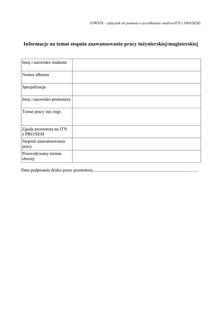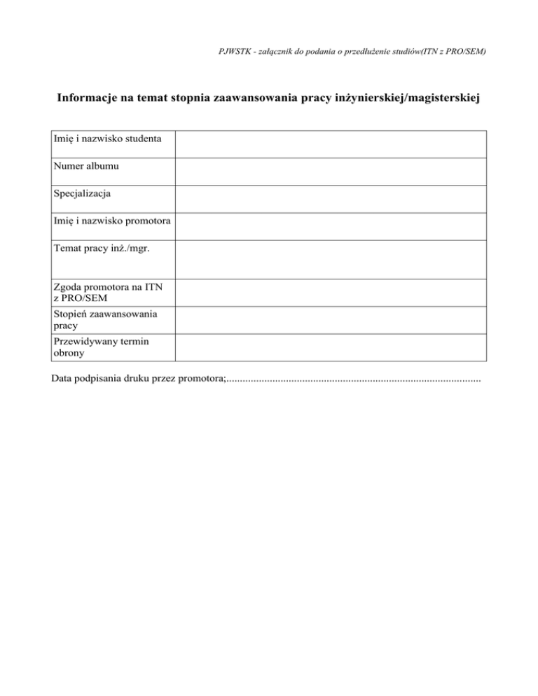 PJWSTK - załącznik do podania o przedłużenie studiów(ITN z PRO/SEM) Informacje na temat stopnia zaawansowania pracy inżynierskiej/magisterskiej Imię i nazwisko studenta Numer albumu Specjalizacja Imię i nazwisko promotora Temat pracy inż./mgr. Zgoda promotora na ITN z PRO/SEM Stopień zaawansowania pracy Przewidywany termin obrony Data podpisania druku przez promotora;..............................................................................................