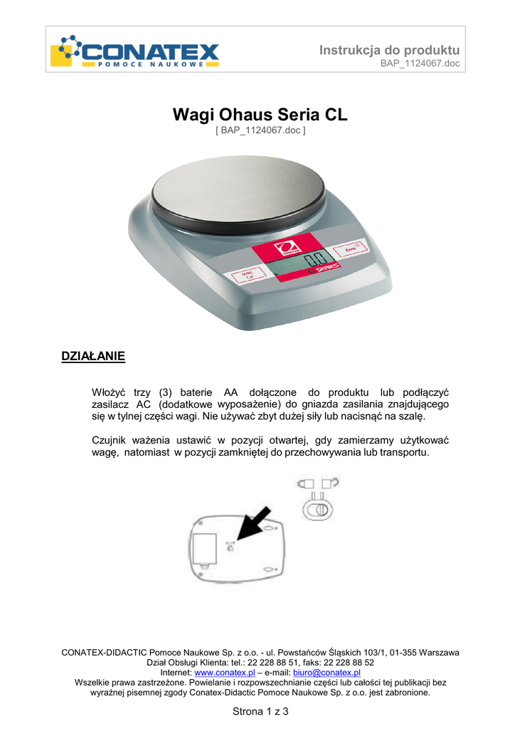 Instrukcja do produktu BAP_1124067.doc Wagi Ohaus Seria CL [ BAP_1124067.doc ] DZIAŁANIE Włożyć trzy (3) baterie AA dołączone do produktu lub podłączyć zasilacz AC (dodatkowe wyposażenie) do gniazda zasilania znajdującego się w tylnej części wagi. Nie używać zbyt dużej siły lub nacisnąć na szalę. Czujnik ważenia ustawić w pozycji otwartej, gdy zamierzamy użytkować wagę, natomiast w pozycji zamkniętej do przechowywania lub transportu. CONATEX-DIDACTIC Pomoce Naukowe Sp. z o.o. - ul. Powstańców Śląskich 103/1, 01-355 Warszawa Dział Obsługi Klienta: tel.: 22 228 88 51, faks: 22 228 88 52 Internet: www.conatex.pl – e-mail: [email protected] Wszelkie prawa zastrzeżone. Powielanie i rozpowszechnianie części lub całości tej publikacji bez wyraźnej pisemnej zgody Conatex-Didactic Pomoce Naukowe Sp. z o.o. jest zabronione. Strona 1 z 3 Instrukcja do produktu BAP_1124067.doc PRZYCISK ON/ZERO/Off Nacisnąć przycisk ON/ZERO/Off, aby uruchomić wagę. Przycisk ten umożliwia także przywrócić wyświetlaną wartość do zera. Nacisnąć przycisk ON/ZERO/Off i przytrzymać w celu wyłączenia wagi. PRZYCISK UNIT/Cal Przycisk UNIT/Cal służy do zmiany jednostki wagi. Nacisnąć przycisk i przytrzymać, aby rozpocząć kalibrowanie. WAŻENIE Umieścić próbkę na szali i odczytać wyświetlony wynik. Znaczek * pojawia się, gdy odczyt jest stabilny. W sytuacji, gdy do ważenia używany jest pojemnik należy nacisnąć na ON/ZERO/Off aby wytarować wagę przed zważeniem produktu. Jeśli nałożony ciężar przekracza udźwig wagi na wyświetlaczu pojawia się E, należy wówczas natychmiast zdjąć ciężar z wagi. KALIBROWANIE Właściwe ciężarki wzorcowe do kalibracji podane są w punkcie „Wyposażenie dodatkowe”. CONATEX-DIDACTIC Pomoce Naukowe Sp. z o.o. - ul. Powstańców Śląskich 103/1, 01-355 Warszawa Dział Obsługi Klienta: tel.: 22 228 88 51, faks: 22 228 88 52 Internet: www.conatex.pl – e-mail: [email protected] Wszelkie prawa zastrzeżone. Powielanie i rozpowszechnianie części lub całości tej publikacji bez wyraźnej pisemnej zgody Conatex-Didactic Pomoce Naukowe Sp. z o.o. jest zabronione. Strona 2 z 3 Instrukcja do produktu BAP_1124067.doc 1. Nacisnąć na przycisk UNIT/Cal i przytrzymać do momentu, gdy na wyświetlaczu pojawi się „CAL”, wówczas zwolnić przycisk. 2. Nacisnąć przycisk ON/ZERO. Na wyświetlaczu pojawia się dopuszczalny ciężar wyrażony w g. 3. Na szali umieścić właściwy ciężarek wzorcowy, a następnie nacisnąć przycisk ON/ZERO. 4. Na wyświetlaczu pojawia się komunikat „PASS”, gdy kalibrowanie jest ukończone. Uwaga : Jeśli na wyświetlaczu pojawia się komunikat „CAL E” oznacza to, że wystąpił błąd kalibrowania (na przykład użyto niewłaściwego ciężarku wzorcowego lub działanie szali zostało zakłócone). W takim przypadku należy powtórzyć proces kalibrowania. SPECYFIKACJA Model Udźwig (g) Precyzja (g) Powtarzalność (odchylenie w g) Liniowość (g) Jednostki wagi Zakres tary Czas stabilizacji Optymalna temperatura funkcjonowania Zasilanie żywotność baterii Automatyczny wyłącznik Wskaźnik przeładowania 1124066 1124067 1124068 1124069 200 500 2000 5000 0,1 0,1 1 1 0,1 0,1 1 1 +/-0,1 +/-0,1 +/-1 +/-1 g, oz, ozt, dwt g, lb:oz, ozt, dwt do udźwigu poprzez odejmowanie 2 sekundy 65o-77oF / 18o-25oC 3 baterie alkaliczne AA (dołączone) zasilacz AC (opcjonalnie) 300 godzin po 4 min nie używania [E] CONATEX-DIDACTIC Pomoce Naukowe Sp. z o.o. - ul. Powstańców Śląskich 103/1, 01-355 Warszawa Dział Obsługi Klienta: tel.: 22 228 88 51, faks: 22 228 88 52 Internet: www.conatex.pl – e-mail: [email protected] Wszelkie prawa zastrzeżone. Powielanie i rozpowszechnianie części lub całości tej publikacji bez wyraźnej pisemnej zgody Conatex-Didactic Pomoce Naukowe Sp. z o.o. jest zabronione. Strona 3 z 3
