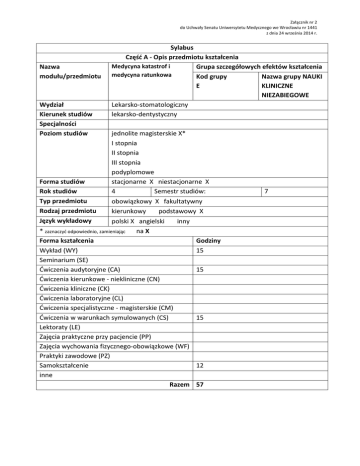 Załącznik nr 2 do Uchwały Senatu Uniwersytetu Medycznego we Wrocławiu nr 1441 z dnia 24 września 2014 r. Nazwa modułu/przedmiotu Wydział Kierunek studiów Specjalności Poziom studiów Sylabus Część A - Opis przedmiotu kształcenia Medycyna katastrof i Grupa szczegółowych efektów kształcenia medycyna ratunkowa Kod grupy Nazwa grupy NAUKI E KLINICZNE NIEZABIEGOWE Lekarsko-stomatologiczny lekarsko-dentystyczny jednolite magisterskie X* I stopnia II stopnia III stopnia podyplomowe Forma studiów stacjonarne X niestacjonarne X Rok studiów 4 Semestr studiów: Typ przedmiotu obowiązkowy X fakultatywny Rodzaj przedmiotu podstawowy X kierunkowy Język wykładowy inny polski X angielski * zaznaczyć odpowiednio, zamieniając na X Forma kształcenia Godziny Wykład (WY) 15 Seminarium (SE) Ćwiczenia audytoryjne (CA) 15 Ćwiczenia kierunkowe - niekliniczne (CN) Ćwiczenia kliniczne (CK) Ćwiczenia laboratoryjne (CL) Ćwiczenia specjalistyczne - magisterskie (CM) Ćwiczenia w warunkach symulowanych (CS) 15 Lektoraty (LE) Zajęcia praktyczne przy pacjencie (PP) Zajęcia wychowania fizycznego-obowiązkowe (WF) Praktyki zawodowe (PZ) Samokształcenie 12 inne Razem 57 7 Załącznik nr 2 do Uchwały Senatu Uniwersytetu Medycznego we Wrocławiu nr 1441 z dnia 24 września 2014 r. Cele kształcenia: Celem kształcenia jest przygotowanie studenta do samodzielnego rozpoznawania stanów zagrożenia życia pochodzenia wewnętrznego, traumatologicznego i toksykologicznego u dzieci i dorosłych, ze szczególnym uwzględnieniem relacji z chorobami i procedurami stomatologicznymi oraz nauczenie go organizacji i prowadzenia resuscytacji krążeniowo – oddechowej dzieci i dorosłych. Macierz efektów kształcenia dla modułu/przedmiotu w odniesieniu do metod weryfikacji zamierzonych efektów kształcenia oraz formy realizacji zajęć: Metody weryfikacji osiągnięcia zamierzonych efektów kształcenia (formujące i podsumowujące) Forma zajęć dydaktycznych zna zasady postępowania z poszkodowanymi w urazach wielonarządowych zna zasady organizacji w katastrofach i awariach, fazy akcji ratunkowej i zakres udzielania pomocy poszkodowanym zna przyczyny i mechanizmy zatrzymania krążenia i oddychania oraz zasady prowadzenia reanimacji i postępowania po reanimacji zna stany zagrożenia życia Interaktywne prowadzenie zajęć, test pisemny W,S Interaktywne prowadzenie zajęć, test pisemny W,S Interaktywne prowadzenie zajęć, test pisemny CS Interaktywne prowadzenie zajęć, test pisemny W,S E.W20. wie, kiedy chorego należy skierować do szpitala Interaktywne prowadzenie zajęć, test pisemny W, S W 06 F.W22. Interaktywne prowadzenie zajęć, test pisemny W, S U 01 E.U1 zna i rozumie patomechanizm oddziaływania chorób jamy ustnej na ogólny stan zdrowia przeprowadza diagnostykę różnicową najczęstszych chorób osób dorosłych Interaktywne prowadzenie zajęć, test pisemny W,S, CS U 02 E.U2. Interaktywne prowadzenie zajęć, test pisemny S,CS U 03 E.U3. Interaktywne prowadzenie zajęć, test pisemny S,CS U 04 E.U4. ocenia i opisuje stan somatyczny i psychiczny pacjenta planuje postępowanie diagnostyczne i terapeutyczne w przypadku najczęstszych chorób osób dorosłych interpretuje wyniki badań laboratoryjnych Interaktywne prowadzenie zajęć, test pisemny S,CS U 05 E.U8. rozpoznaje ryzyko zagrożenia życia Interaktywne prowadzenie zajęć, test pisemny W,S, CS U 06 E.U9. opisuje i rozpoznaje objawy wstrząsu i ostrej niewydolności krążenia Interaktywne prowadzenie zajęć, test pisemny S U 07 E.U10. Interaktywne prowadzenie zajęć, test pisemny S U 08 E.U17. Interaktywne prowadzenie zajęć, test pisemny S U 09 E.U20. rozpoznaje objawy urazów mózgu i chorób naczyniowych mózgu, zespołów otępiennych i zaburzeń świadomości rozpoznaje choroby związane z nałogiem palenia tytoniu, alkoholizmem i uzależnieniami wykonuje podstawowe procedury i Interaktywne prowadzenie zajęć, test C,S Numer efektu kształcenia przedmiotowego Numer efektu kształcenia kierunkowego W 01 E.W4. W 02 E.W5. W 03 E.W17. W 04 E.W18. W 05 Student, który zaliczy moduł/przedmiot wie/umie/potrafi ** wpisz symbol Załącznik nr 2 do Uchwały Senatu Uniwersytetu Medycznego we Wrocławiu nr 1441 z dnia 24 września 2014 r. K 01 zabiegi lekarskie: pomiar temperatury, pomiar tętna, nieinwazyjny pomiar ciśnienia tętniczego, leczenie tlenem, wentylację wspomaganą i zastępczą, wprowadzenie rurki ustno-gardłowej, przygotowanie pola operacyjnego, higieniczne i chirurgiczne odkażanie rąk, wstrzyknięcie dożylne, domięśniowe i podskórne, pobieranie obwodowej krwi żylnej, pobieranie wymazów z nosa, gardła i skóry, proste testy paskowe, pomiar stężenia glukozy we krwi. pisemny doskonali współpracę w grupie w czasie zajęć symulacyjnych, umie pełnić różne role – lidera zespołu lub też członka zespołu. W czasie tego rodzaju zajęć student aktywnie poszerza swoją wiedzę na temat relacji stomatologii i medycyny ratunkowej. Interaktywne prowadzenie zajęć, test pisemny C,S ** WY - wykład; SE - seminarium; CA - ćwiczenia audytoryjne; CN - ćwiczenia kierunkowe (niekliniczne); CK - ćwiczenia kliniczne; CL ćwiczenia laboratoryjne; CM – ćwiczenia specjalistyczne (mgr); CS - ćwiczenia w warunkach symulowanych; LE - lektoraty; zajęcia praktyczne przy pacjencie - PP; WF - zajęcia wychowania fizycznego (obowiązkowe); PZ- praktyki zawodowe; SK - samokształcenie Proszę oznaczyć krzyżykami w skali 1-3 jak powyższe efekty lokują państwa zajęcia w działach: przekaz wiedzy, umiejętności czy kształtowanie postaw np.: Wiedza + + Umiejętności + + Postawy ++ Nakład pracy studenta (bilans punktów ECTS): 1,0 Forma nakładu pracy studenta Obciążenie studenta (h) (udział w zajęciach, aktywność, przygotowanie sprawdzenie, itp.) 1. Godziny kontaktowe 45 2. Czas pracy własnej studenta 12 Sumaryczne obciążenie pracy studenta 57 Punkty ECTS za moduł/przedmiotu 2,0 Uwagi Treś