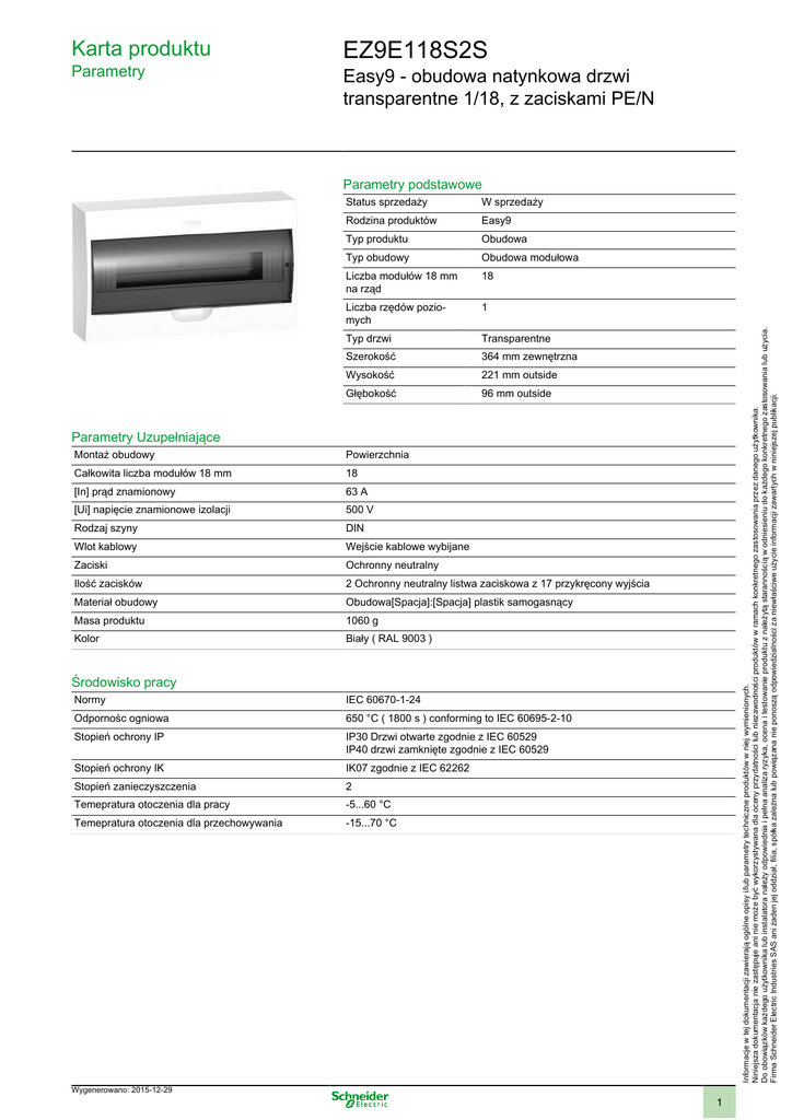 Karta produktu Parametry EZ9E118S2S Easy9 - obudowa natynkowa drzwi transparentne 1/18, z zaciskami PE/N Status sprzedaży W sprzedaży Rodzina produktów Easy9 Typ produktu Obudowa Typ obudowy Obudowa modułowa Liczba modułów 18 mm na rząd 18 Liczba rzędów poziomych 1 Typ drzwi Transparentne Szerokość 364 mm zewnętrzna Wysokość 221 mm outside Głębokość 96 mm outside Informacje w tej dokumentacji zawierają ogólne opisy i/lub parametry techniczne produktów w niej wymienionych. Niniejsza dokumentacja nie zastępuje ani nie może być wykorzystywana dla oceny przydatności lub niezawodności produktów w ramach konkretnego zastosowania przez danego użytkownika. Do obowiązków każdego użytkownika lub instalatora należy odpowiednia i pełna analiza ryzyka, ocena i testowanie produktu z należytą starannością w odniesieniu do każdego konkretnego zastosowania lub użycia. Firma Schneider Electric Industries SAS ani żaden jej oddział, filia, spółka zależna lub powiązana nie ponoszą odpowiedzialności za niewłaściwe użycie informacji zawartych w niniejszej publikacji. Parametry podstawowe Parametry Uzupełniające Montaż obudowy Powierzchnia Całkowita liczba modułów 18 mm 18 [In] prąd znamionowy 63 A [Ui] napięcie znamionowe izolacji 500 V Rodzaj szyny DIN Wlot kablowy Wejście kablowe wybijane Zaciski Ochronny neutralny Ilość zacisków 2 Ochronny neutralny listwa zaciskowa z 17 przykręcony wyjścia Materiał obudowy Obudowa[Spacja]:[Spacja] plastik samogasnący Masa produktu 1060 g Kolor Biały ( RAL 9003 ) Środowisko pracy Normy IEC 60670-1-24 Odpornośc ogniowa 650 °C ( 1800 s ) conforming to IEC 60695-2-10 Stopień ochrony IP IP30 Drzwi otwarte zgodnie z IEC 60529 IP40 drzwi zamknięte zgodnie z IEC 60529 Stopień ochrony IK IK07 zgodnie z IEC 62262 Stopień zanieczyszczenia 2 Temepratura otoczenia dla pracy -5...60 °C Temepratura otoczenia dla przechowywania -15...70 °C Wygenerowano: 2015-12-29 1