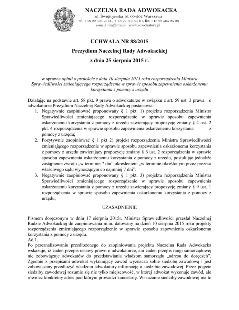 NACZELNA RADA ADWOKACKA ul. Świętojerska 16, 00-202 Warszawa tel. +48 22 505 25 00, + 48 22 505 25 01, fax +48 22 505 25 08 e-mail: [email protected] www.adwokatura.pl UCHWAŁA NR 88/2015 Prezydium Naczelnej Rady Adwokackiej z dnia 25 sierpnia 2015 r. w sprawie opinii o projekcie z dnia 10 sierpnia 2015 roku rozporządzenia Ministra Sprawiedliwości zmieniającego rozporządzenie w sprawie sposobu zapewnienia oskarżonemu korzystania z pomocy z urzędu Działając na podstawie art. 58 pkt. 9 prawa o adwokaturze w związku z art. 59 ust. 3 prawa o adwokaturze Prezydium Naczelnej Rady Adwokackiej postanawia: 1. Negatywnie zaopiniować proponowany § 1 pkt. 1) projektu rozporządzenia Ministra Sprawiedliwości zmieniającego rozporządzenie w sprawie sposobu zapewnienia oskarżonemu korzystania z pomocy z urzędu zawierający propozycję zmiany § 4 ust. 2 pkt. 4 rozporządzenia w sprawie sposobu zapewnienia oskarżonemu korzystania z pomocy z urzędu; 2. Pozytywnie zaopiniować § 1 pkt 2) projekt rozporządzenia Ministra Sprawiedliwości zmieniającego rozporządzenie w sprawie sposobu zapewnienia oskarżonemu korzystania z pomocy z urzędu zawierający propozycję zmiany § 6 ust. 2 rozporządzenia w sprawie sposobu zapewnienia oskarżonemu korzystania z pomocy z urzędu, postulując jednakże zastąpienie zwrotu „w terminie 7 dni” określeniem „w terminie określonym przez prezesa właściwego sądu wynoszącym co najmniej 7 dni”; 3. Negatywnie zaopiniować proponowany § 1 pkt. 3) projektu rozporządzenia Ministra Sprawiedliwości zmieniającego rozporządzenie w sprawie sposobu zapewnienia oskarżonemu korzystania z pomocy z urzędu zawierający propozycję zmiany § 9 ust. 1 rozporządzenia w sprawie sposobu zapewnienia oskarżonemu korzystania z pomocy z urzędu; UZASADNIENIE Pismem doręczonym w dniu 17 sierpnia 2015r. Minister Sprawiedliwości przesłał Naczelnej Radzie Adwokackiej do zaopiniowania m.in. datowany na dzień 10 sierpnia 2015 roku projekty rozporządzenia zmieniającego rozporządzenie w sprawie sposobu zapewnienia oskarżonemu korzystania z pomocy z urzędu. Ad 1. Po przeanalizowaniu przedłożonego do zaopiniowania projektu Naczelna Rada Adwokacka wskazuje, iż żaden przepis ustawy prawo o adwokaturze, ani żaden przepis rangi samorządowej nie zobowiązuje adwokatów do przedstawiania władzom samorządu „adresu do doręczeń”. Zgodnie z przepisami adwokat wykonujący zawód wyznacza sobie siedzibę zawodową i jest zobowiązany przedłożyć władzom adwokatury informację o siedzibie zawodowej. Przez pojęcie siedziby zawodowej rozumie się nie tylko miejscowość, w której adwokat wykonuje zawód, ale również konkretny adres pod którym prowadzi kancelarię. Wskazanie siedziby zawodowej ma to NACZELNA RADA ADWOKACKA ul. Świętojerska 16, 00-202 Warszawa tel. +48 22 505 25 00, + 48 22 505 25 01, fax +48 22 505 25 08 e-mail: [email protected] www.adwokatura.pl znaczenie, że zgodnie z art. 21 ust. 3 prawa o adwokaturze siedziba zawodowa adwokata przesądza, w okręgu którego sądu rejonowego adwokat świadczy pomoc prawną z urzędu. Tymczasem projekt rozporządzenia zakłada, iż okręgowe rady adwokackie nie będą przekazywać adresu siedziby zawodowej adwokata, lecz jedynie „adres do doręczeń” (§ 4 ust. 2 pkt. 2 rozporządzenia). Powstaje jednak zagadnienie co rzeczywiście oznacza pojęcie „adres do doręczeń” i jak się ono ma do pojęć ustawowych: siedziby zawodowej adwokata (na gruncie prawa o adwokaturze), czy adresu zamieszkania radcy prawnego (na gruncie ustawy o radcach prawnych). Dokonując wykładni tego określenia przyjąć należy, że posłużenie się pojęciem „adres do doręczeń” może prowadzić do wskazania innego adresu niż adres siedziby zawodowej adwokata, czy adres zamieszkania radcy prawnego. Co więcej adres do doręczeń oznaczać może jedynie adres na jaki należy doręczać obrońcy korespondencję (gdyż doręcza się tylko korespondencję). W skrajnych przypadkach adresem do doręczeń może być również adres skrzynki w placówce operatora pocztowego. Co więcej, adres do doręczeń nie musi pokrywać się z adresem siedziby i nie musi znajdować się nawet na terenie izby, do której przynależy adwokat czy radca prawny. Wynikająca z art. 81a § 4 kpk delegacja ustawowa obliguje Ministra Sprawiedliwości do wydania rozporządzenia w sprawie sposobu zapewnienia oskarżonemu korzystania z pomocy z urzędu, mając na uwadze konieczność zapewnienia prawidłowego toku postępowania oraz prawidłowej realizacji prawa do obrony. Rezygnacja z obowiązku wskazywania adresów siedzib zawodowych adwokatów obrońców i adresów miejsca zamieszkania radców prawnych obrońców nie gwarantuje oskarżonym pełnej realizacji prawa do obrony. W wielu przypadkach prawo do obrony wymaga również osobistego kontaktu oskarżonego z obrońcą w miejscu, w którym obrońca wykonuje zawód. W przypadku, gdy „adres do doręczeń” nie będzie miejscem wykonywania zawodu ,wówczas oskarżony nie będzie miał szansy na bezpośredni kontakt ze swoim obrońcą. Naczelna Rada Adwokacka zwraca uwagę, iż nie jest właściwym sposobem regulowanie na poziomie rozporządzenia zagadnień wymagających regulacji ustawowej. Bezwzględnie słusznym wydaje się pogląd, iż należy szanować prawo do prywatności obrońcy, przez które rozumieć należy nie tylko prawo do zachowania w poufności adresu miejsca zamieszkania obrońcy, ale również prawo do wypoczynku, prawo do choroby, prawo do sprawowania opieki nad chorymi członkami rodziny, etc. Prawo to musi być szanowane nie tylko przez Ministra Sprawiedliwości, ale również przez samego oskarżonego – klienta z urzędu (który nie może nadużywać prawa np. poprzez kontakt telefoniczny po godzinach pracy kancelarii), czy również przez sądy lub prokuraturę. Naczelna Rada Adwokacka rozumie postulat zachowania w poufności adresu zamieszkania radcy pr