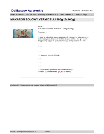 Delikatesy Azjatyckie Utworzono : 07 marzec 2017 MĄKI, PANIERKI, MAKARONY > makarony > MAKARON SOJOWY VERMICELLI 500g (5x100g) MAKARON SOJOWY VERMICELLI 500g (5x100g) Model : MAKARON SOJOWY VERMICELLI 500g (5x100g) Producent : Jeden z najbardziej rozpowszechnionych makaron�w stosowanych w kuchni azjatyckiej. Doskonały dodatek do zup, sałatek i dań gł�wnych. Przygotowuje się go do spożycia zalewając ciepłą wodą na ok 5 min. � � Producent: DING XI BRAND � � � Skład: skrobia grochowa, skrobia z fasoli mung� Cena : 9,50 zł Brutto ( 9,50 zł Netto) Dostępność: Produkt dostępny w naszym sklepie od 23 lipiec 2016 kontakt : - [email protected] Strona 1