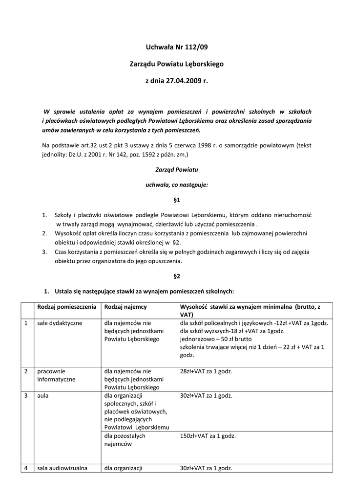 Uchwała Nr 112/09 Zarządu Powiatu Lęborskiego z dnia 27.04.2009 r. W sprawie ustalenia opłat za wynajem pomieszczeo i powierzchni szkolnych w szkołach i placówkach oświatowych podległych Powiatowi Lęborskiemu oraz określenia zasad sporządzania umów zawieranych w celu korzystania z tych pomieszczeo. Na podstawie art.32 ust.2 pkt 3 ustawy z dnia 5 czerwca 1998 r. o samorządzie powiatowym (tekst jednolity: Dz.U. z 2001 r. Nr 142, poz. 1592 z późn. zm.) Zarząd Powiatu uchwala, co następuje: §1 1. 2. 3. Szkoły i placówki oświatowe podległe Powiatowi Lęborskiemu, którym oddano nieruchomośd w trwały zarząd mogą wynajmowad, dzierżawid lub użyczad pomieszczenia . Wysokośd opłat określa iloczyn czasu korzystania z pomieszczenia lub zajmowanej powierzchni obiektu i odpowiedniej stawki określonej w §2. Czas korzystania z pomieszczeo określa się w pełnych godzinach zegarowych i liczy się od zajęcia obiektu przez organizatora do jego opuszczenia. §2 1. Ustala się następujące stawki za wynajem pomieszczeo szkolnych: Rodzaj pomieszczenia Rodzaj najemcy 1 sale dydaktyczne dla najemców nie będących jednostkami Powiatu Lęborskiego 2 pracownie informatyczne 28zł+VAT za 1 godz. 3 aula dla najemców nie będących jednostkami Powiatu Lęborskiego dla organizacji społecznych, szkół i placówek oświatowych, nie podlegających Powiatowi Lęborskiemu dla pozostałych najemców dla organizacji 30zł+VAT za 1 godz. 4 sala audiowizualna Wysokośd stawki za wynajem minimalna (brutto, z VAT) dla szkół policealnych i językowych -12zł +VAT za 1godz. dla szkół wyższych-18 zł +VAT za 1godz. jednorazowo – 50 zł brutto szkolenia trwające więcej niż 1 dzieo – 22 zł + VAT za 1 godz. 30zł+VAT za 1 godz. 150zł+VAT za 1 godz. (razem ze sprzętem ) 5 sala gimnastyczna (cena najmu za 1 godz.) (cena najmu za 45 min) 6 bieżnia okólna 7 bieżnia prosta 8 boisko do piłki nożnej 9 boisko do piłki ręcznej 10 boisko do piłki siatkowej 11 boisko do koszykówki 12 rzutnia 13 skocznia 14 korzystanie z natrysków 15 wynajem pomieszczeo społecznych, szkół i placówek oświatowych, nie podlegających Powiatowi Lęborskiemu dla pozostałych najemców dla klubów, organizacji i stowarzyszeo kultury fizycznej z terenu powiatu, na treningi i imprezy sportowe dla klubów, organizacji i stowarzyszeo kultury fizycznej z poza terenu powiatu na treningi i imprezy sportowe dla pozostałych najemców na treningi i imprezy sportowe dla pozostałych najemców na imprezy inne niż sportowe dla najemców nie będących jednostkami Powiatu Lęborskiego dla najemców nie będących jednostkami Powiatu Lęborskiego dla najemców nie będących jednostkami Powiatu Lęborskiego dla najemców nie będących jednostkami Powiatu Lęborskiego dla najemców nie będących jednostkami Powiatu Lęborskiego dla najemców nie będących jednostkami Powiatu Lęborskiego dla najemców nie będących jednostkami Powiatu Lęborskiego dla najemców nie będących jednostkami Powiatu Lęborskiego dla najemców nie będących jednostkami Powiatu Lęborskiego dla najemców nie 50zł+VAT za 1 godz. >648 m2 25 zł brutto powierzchnia sali (P) 288m2<P<648 162 m2<P<288 m2 m2 22 zł brutto 19 zł brutto P<162m 2 13 zł brutto 28 zł brutto 25 zł brutto 22 zł brutto 16 zł brutto 31 zł brutto 28 zł brutto 25 zł brutto 19 zł brutto 51 zł brutto 48 zł brutto 45 zł brutto 39 zł brutto 100 zł + VAT za 1 godz. 50 zł +VAT za 1 godz. 120 zł +VAT za 1 godz. 100 zł + VAT za 1 godz. 20 zł + VAT za 1 godz. 40 zł + VAT za 1 godz. 20 zł + VAT za 1 godz. 20 zł + VAT za 1 godz. w cenie wynajmu sali kuchnia -5,50 zł + VAT za m2 za miesiąc (w cenie koszty do prowadzenia działalności gospodarczej 16 wynajem powierzchni placówki do odpłatnego korzystania przez podmioty chcące zainstalowad automat do napojów, artykułów spożywczych, punktów kserograficznych lub kserokopiarki itp. 17 pomieszczenie na prowadzenie przez podmioty własnej kancelarii, sekretariatu, dziekanatu itp. 18 siłownia 19 Wynajem pokoi w internacie SOS-W 20 Używanie sprzętu biurowego 21 Sala baletowa i wykładowa 22 Place 23 Wynajęcie innych pomieszczeo nie ujętych w punkcie od 1-22 będących jednostkami Powiatu Lęborskiego dla najemców nie będących jednostkami Powiatu Lęborskiego zużycia energii, wody, sprzątania) sklepik – 10 zł + VAT za m2 za miesiąc (w cenie koszty zużycia energii, wody, sprzątania) biblioteka – 5zł + VAT za m2 (dodatkowo opłata za zużycie energii, wody i ogrzewanie) 220 zł brutto za miesiąc dla najemców nie będących jednostkami Powiatu Lęborskiego 284 zł brutto /m-c dla najemców nie będących jednostkami Powiatu Lęborskiego dla najemców nie będących jednostkami Powiatu Lęborskiego dla najemców będących jednostkami Powiatu Lęborskiego 10 zł +VAT za godzinę od osoby 20 zł/doba 15zł/doba 183 zł/m-c 40 zł/1h dla najemców nie będących jednostkami Powiatu Lęborskiego 0,60 brutto za m2/m-c stawka przyjęta indywidualnie w porozumieniu z organem prowadzącym §3 Ustala się następujące stawki za wynajem sprzętu nagłośnieniowego i oświetleniowego: 1 2 3 4 5 6 Rodzaj nagłośnienia Nagłośnienie duże (od 2 kW) Nagłośnienie duże (od 2 kW) Nagłośnienie małe (do 2 kW) Nagłośnienie małe (do 2 kW) Sprzęt oświetleniowy Sprzęt oświetleniowy Czas wynajmu do 6 godzin do 12 godzin do 6 godzin do 12 godzin do 6 godzin do 12 godzin cena 500 zł + 22% VAT 800 zł + 22% VAT 150 zł + 22% VAT 200 zł + 22% VAT 150 zł +22% VAT 200 zł +22% VAT §4 1. Upoważnia się dyrektorów do udostępnienia, w uzasadnionych przypadkach, za zgodą organu prowadzącego, obiektów oświatowych bez pobierania opłat za wynajem pomieszczeo lub udostępnianie pomieszczeo po cenie kosztów: - w okresach wakacyjnych i feryjnych na prowadzenie działalności typu obozy sportowe, koloni i kursy, konferencje, imprezy kulturalne, - na organizację imprez edukacyjnych, sportowych i r