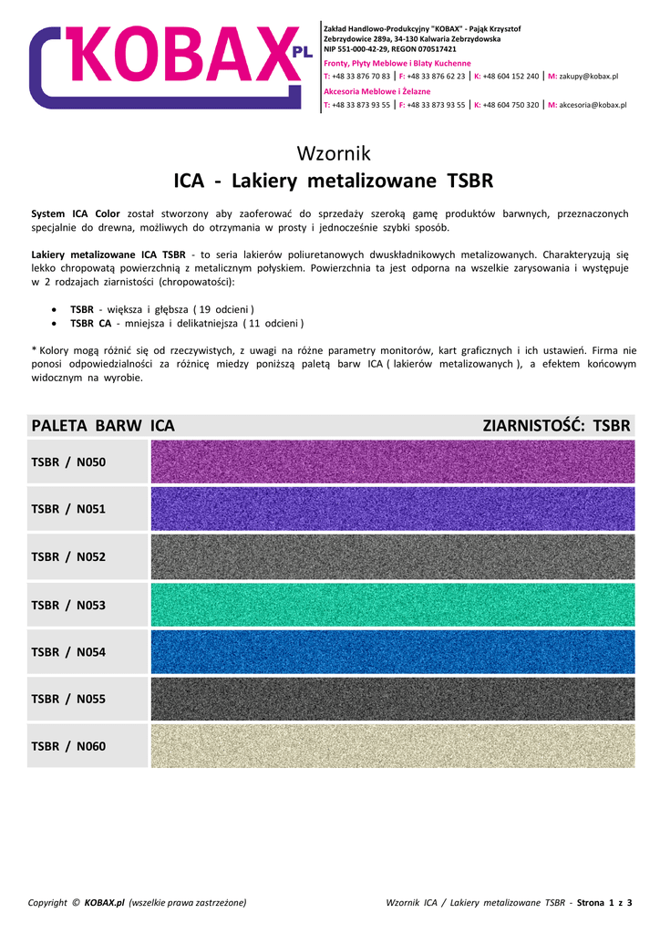Zakład Handlowo-Produkcyjny "KOBAX" - Pająk Krzysztof Zebrzydowice 289a, 34-130 Kalwaria Zebrzydowska NIP 551-000-42-29, REGON 070517421 Fronty, Płyty Meblowe i Blaty Kuchenne T: +48 33 876 70 83 | F: +48 33 876 62 23 | K: +48 604 152 240 | M: [email protected] Akcesoria Meblowe i Żelazne T: +48 33 873 93 55 | F: +48 33 873 93 55 | K: +48 604 750 320 | M: [email protected] Wzornik ICA - Lakiery metalizowane TSBR System ICA Color został stworzony aby zaoferować do sprzedaży szeroką gamę produktów barwnych, przeznaczonych specjalnie do drewna, możliwych do otrzymania w prosty i jednocześnie szybki sposób. Lakiery metalizowane ICA TSBR - to seria lakierów poliuretanowych dwuskładnikowych metalizowanych. Charakteryzują się lekko chropowatą powierzchnią z metalicznym połyskiem. Powierzchnia ta jest odporna na wszelkie zarysowania i występuje w 2 rodzajach ziarnistości (chropowatości): TSBR - większa i głębsza ( 19 odcieni ) TSBR CA - mniejsza i delikatniejsza ( 11 odcieni ) * Kolory mogą różnić się od rzeczywistych, z uwagi na różne parametry monitorów, kart graficznych i ich ustawień. Firma nie ponosi odpowiedzialności za różnicę miedzy poniższą paletą barw ICA ( lakierów metalizowanych ), a efektem końcowym widocznym na wyrobie. PALETA BARW ICA ZIARNISTOŚĆ: TSBR TSBR / N050 TSBR / N051 TSBR / N052 TSBR / N053 TSBR / N054 TSBR / N055 TSBR / N060 Copyright © KOBAX.pl (wszelkie prawa zastrzeżone) Wzornik ICA / Lakiery metalizowane TSBR - Strona 1 z 3 Zakład Handlowo-Produkcyjny "KOBAX" - Pająk Krzysztof Zebrzydowice 289a, 34-130 Kalwaria Zebrzydowska NIP 551-000-42-29, REGON 070517421 Fronty, Płyty Meblowe i Blaty Kuchenne T: +48 33 876 70 83 | F: +48 33 876 62 23 | K: +48 604 152 240 | M: [email protected] Akcesoria Meblowe i Żelazne T: +48 33 873 93 55 | F: +48 33 873 93 55 | K: +48 604 750 320 | M: [email protected] PALETA BARW ICA ZIARNISTOŚĆ: TSBR TSBR / N061 TSBR / N062 TSBR / N063 TSBR / N064 TSBR / N065 TSBR / N066 TSBR / N067 TSBR / N068 TSBR / N069 TSBR / N070 TSBR / N071 TSBR / N072 Copyright © KOBAX.pl (wszelkie prawa zastrzeżone) Wzornik ICA / Lakiery metalizowane TSBR - Strona 2 z 3 Zakład Handlowo-Produkcyjny "KOBAX" - Pająk Krzysztof Zebrzydowice 289a, 34-130 Kalwaria Zebrzydowska NIP 551-000-42-29, REGON 070517421 Fronty, Płyty Meblowe i Blaty Kuchenne T: +48 33 876 70 83 | F: +48 33 876 62 23 | K: +48 604 152 240 | M: [email protected] Akcesoria Meblowe i Żelazne T: +48 33 873 93 55 | F: +48 33 873 93 55 | K: +48 604 750 320 | M: [email protected] PALETA BARW ICA ZIARNISTOŚĆ: TSBR CA TSBR CA / N0186 TSBR CA / N0187 TSBR CA / N0191 TSBR CA / N0199 TSBR CA / N0200 TSBR CA / N0203 TSBR CA / N0206 TSBR CA / N0209 TSBR CA / N0214 TSBR CA / N0220 TSBR CA / N0221 Copyright © KOBAX.pl (wszelkie prawa zastrzeżone) Wzornik ICA / Lakiery metalizowane TSBR - Strona 3 z 3