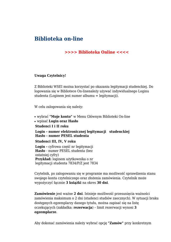 Biblioteka on-line >>>> Biblioteka Online <<<< Uwaga Czytelnicy! Z Biblioteki WSEI można korzystać po okazaniu legitymacji studenckiej. Do logowania się w Bibliotece On-linenależy używać indywidualnego Loginu studenta (Loginem jest numer albumu = legitymacji). W celu zalogowania się należy: wybrać "Moje konto" w Menu Głównym Biblioteki On-line wpisać Login oraz Hasło Studenci I i II roku ● ● Login - numer elektronicznej legitymacji studenckiej Hasło - numer PESEL studenta Studenci III, IV, V roku Login - cyfrowa część nr legitymacji Hasło - numer PESEL studenta (bez ostatniej cyfry) Przykład: loginem użytkownika o nr legitymacji studenta 7834/P/Z jest 7834 Czytelnik, po zalogowaniu się w programie ma możliwość sprawdzenia stanu swojego konta czytelniczego oraz złożenia zamówienia. Czytelnik może wypożyczyć łącznie 3 książki na okres 30 dni. Zamówienie jest ważne 2 dni. Istnieje możliwość przesunięcia ważności zamówienia maksimum o 2 dni (studenci studiów zaocznych). W sytuacji braku dostępnych egzemplarzy danego tytułu, można zapisać się na listę oczekujących (zakładka: rezerwacja) – limit rezerwacji wynosi 3 egzemplarze. Aby dokonać zamówienia należy wybrać opcję "Zamów" przy konkretnym egzemplarzu książki: W razie konieczności przedłużenia okresu ważności zamówienia, należy wybrać konkretną, wytłuszoną datę, a następnie opcję "Zamów": Egzemplarz książki oznaczony czerwoną kłódką jest dostępny tylko na miejscu, w Czytelni (egzemplarze z tzw. Księgozbioru Podręcznego). W celu zamówienia egzemplarza podręcznego należy wynotować z elektronicznej karty książki następujące informacje: Nr Inwentarzowy, Sygnaturę = znak miejsca, Tytuł, Autor, następnie należy zgłosić się do dyżurującego bibliotekarza: Aby dokonać rezerwacji książki, w przypadku gdy wszystkie pozycje są wypożyczone/zamówione, należy wybrać opcję "Rezerwuj w tej filii". Uwaga! Opcja rezerwacji jest nieaktywna, gdy na daną pozycje zapisze się trzecia osoba. Czytelnik może tworzyć własne kolekcje (bibliografie) dodając wybrane tytuły książek „Dodaj opis do koszyka” (jak poniżej). Uwaga! Nie jest to opcja zamawiania książki. Dana lista nie jest widoczna dla bibliotekarza. Po zakończeniu pracy prosimy o wylogowanie się z indywidualnego konta (prawy górny róg strony - „Wyloguj się"). Uwaga! ● ● Logowanie się nie jest potrzebne do wyszukiwania w katalogach. W opcji programu „Szukaj" istnieje możliwość wyboru rodzajów wyszukiwania (Proste, Indeks, Złożone) oraz kryteriów przeszukiwania wszystkich katalogów według np.: autora , tytułu, zagadnienia (hasła przedmiotowego). >>>> Biblioteka Online <<<<