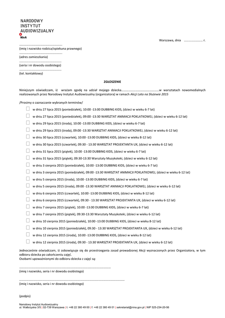 Warszawa, dnia …………………… r. ………………………………………………. (imię i nazwisko rodzica/opiekuna prawnego) ………………………………………………. (adres zamieszkania) ……………………………………………… (seria i nr dowodu osobistego) ……………………………………………… (tel. kontaktowy) ZGŁOSZENIE Niniejszym oświadczam, iż wrażam zgodę na udział mojego dziecka………………………………………...w warsztatach nowomedialnych realizowanych przez Narodowy Instytut Audiowizualny (organizatora) w ramach Akcji Lato na Służewie 2015 /Prosimy o zaznaczanie wybranych terminów/ w dniu 27 lipca 2015 (poniedziałek), 10:00 -13:00 DUBBING KIDS, (dzieci w wieku 6-7 lat) w dniu 27 lipca 2015 (poniedziałek), 09:00 -13:30 WARSZTAT ANIMACJI POKLATKOWEJ, (dzieci w wieku 6-12 lat) w dniu 29 lipca 2015 (środa), 10:00 -13:00 DUBBING KIDS, (dzieci w wieku 6-7 lat) w dniu 29 lipca 2015 (środa), 09:00 -13:30 WARSZTAT ANIMACJI POKLATKOWEJ, (dzieci w wieku 6-12 lat) w dniu 30 lipca 2015 (czwartek), 10:00 -13:00 DUBBING KIDS, (dzieci w wieku 8-12 lat) w dniu 30 lipca 2015 (czwartek), 09:30 - 13:30 WARSZTAT PROJEKTANTA UX, (dzieci w wieku 6-12 lat) w dniu 31 lipca 2015 (piątek), 10:00 -13:00 DUBBING KIDS, (dzieci w wieku 6-7 lat) w dniu 31 lipca 2015 (piątek), 09:30-13:30 Warsztaty Muzykoteki, (dzieci w wieku 6-12 lat) w dniu 3 sierpnia 2015 (poniedziałek), 10:00 -13:00 DUBBING KIDS, (dzieci w wieku 6-7 lat) w dniu 3 sierpnia 2015 (poniedziałek), 09:00 -13:30 WARSZTAT ANIMACJI POKLATKOWEJ, (dzieci w wieku 6-12 lat) w dniu 5 sierpnia 2015 (środa), 10:00 -13:00 DUBBING KIDS, (dzieci w wieku 6-7 lat) w dniu 5 sierpnia 2015 (środa), 09:00 -13:30 WARSZTAT ANIMACJI POKLATKOWEJ, (dzieci w wieku 6-12 lat) w dniu 6 sierpnia 2015 (czwartek), 10:00 -13:00 DUBBING KIDS, (dzieci w wieku 8-12 lat) w dniu 6 sierpnia 2015 (czwartek), 09:30 - 13:30 WARSZTAT PROJEKTANTA UX, (dzieci w wieku 6-12 lat) w dniu 7 sierpnia 2015 (piątek), 10:00 -13:00 DUBBING KIDS, (dzieci w wieku 6-7 lat) w dniu 7 sierpnia 2015 (piątek), 09:30-13:30 Warsztaty Muzykoteki, (dzieci w wieku 6-12 lat) w dniu 10 sierpnia 2015 (poniedziałek), 10:00 -13:00 DUBBING KIDS, (dzieci w wieku 8-12 lat) w dniu 10 sierpnia 2015 (poniedziałek), 09:30 - 13:30 WARSZTAT PROJEKTANTA UX, (dzieci w wieku 6-12 lat) w dniu 12 sierpnia 2015 (środa), 10:00 -13:00 DUBBING KIDS, (dzieci w wieku 8-12 lat) w dniu 12 sierpnia 2015 (środa), 09:30 - 13:30 WARSZTAT PROJEKTANTA UX, (dzieci w wieku 6-12 lat) Jednocześnie oświadczam, iż zobowiązuje się do przestrzegania zasad prowadzonej Akcji wyznaczonych przez Organizatora, w tym odbioru dziecka po zakończeniu zajęć. Osobami upoważnionymi do odbioru dziecka z zajęć są: ……………………………………………………………………………………………………… (imię i nazwisko, seria i nr dowodu osobistego) ……………………………………………………………………………………………………………………… (imię i nazwisko, seria i nr dowodu osobistego) (podpis) Narodowy Instytut Audiowizualny ul. Wałbrzyska 3/5 | 02-739 Warszawa | t: +48 22 380 49 00 | f: +48 22 380 49 01 | [email protected] | NIP 525-234-20-56 OŚWIADCZENIE DOTYCZĄCE OCHRONY DANYCH OSOBOWYCH Wyrażam zgodę na przetwarzanie podanych wyżej danych osobowych, zgodnie z ustawą z dnia 29 sierpnia 1997 r. o ochronie danych osobowych (Dz. U. 2002 r. Nr 101 poz. 926, z późn. zm.), w tym publikacji zdjęć zawierających obraz osoby mojego dziecka przez Organizatora imprezy. ……………………………………….. (miejscowość, data) ..........….…………………………… (podpis) *Administratorem danych jest Narodowy Instytut Audiowizulany, przy ul. Wałbrzyskiej 3/5. Dane są przetwarzane wyłącznie w celu organizacji i prezentacji Akcji Lato na Służewie 2015 i będą udostępniane jedynie organizatorowi imprezy. Podanie danych osobowych jest dobrowolne, a osobie, która wyraża zgodę na przetwarzanie danych osobowych przysługuje prawo wglądu do swoich danych oraz ich poprawiania. Narodowy Instytut Audiowizualny ul. Wałbrzyska 3/5 | 02-739 Warszawa | t: (022) 380 49 00 | f: (022) 380 49 01 | [email protected] | NIP 525-23-42-056 OŚWIADCZENIE O WYRAŻENIU ZGODY NA KORZYSTANIE Z PRAW AUTORSKICH I PRAW DO WIZERUNKU W związku ze zgłoszeniem uczestnictwa swojego dziecka w warsztatach artystycznych realizowanych przez Narodowy Instytut Audiowizualny z siedzibą przy ul. Wałbrzyskiej 3/5; 02-739 w Warszawie („NInA“ lub „Organizator“) w ramach Akcji Lato na Służewie 2015 (Akcja) w dniach ………………2015 r., jako prawny opiekun ……………………………………….. (imię dziecka) niniejszym oświadczam, że: 1. stworzony w ramach Akcji w dniu……….. film poklatkowy („Utwór”) nie narusza jakichkolwiek praw osób trzecich i zwalniam NInA z jakiejkolwiek odpowiedzialności w tym zakresie oraz jako osoba uprawniona do Utworu wyrażam zgodę na nieodpłatne wykorzystanie filmu przez Organizatora w celach informacyjnych, edukacyjnych, promocyjnych i reklamowych związanych z Akcją oraz działaniami statutowymi NInA, bez ograniczeń terytorialnych i czasowych, na następujących polach eksploatacji: a) wszelkie publiczne udostępnianie w taki sposób, aby każdy mógł mieć do niego dostęp w miejscu i czasie przez siebie wybranym, w tym poprzez stacje naziemne, za pośrednictwem satelity, sieci kablowe, telekomunikacyjne lub multimedialne, bazy danych, serwery lub inne urządzenia i systemy, w tym także osób trzecich, w obiegu otwartym lub zamkniętym, w jakiejkolwiek technice, systemie lub formacie, z lub bez możliwości zapisu, w tym także na stronach internetowych NInA, b) wszelkie utrwalanie i zwielokrotnianie (w tym wprowadzanie do pamięci komputera lub innego urządzenia), w jakiejkolwiek technice (w tym cyfrowej,