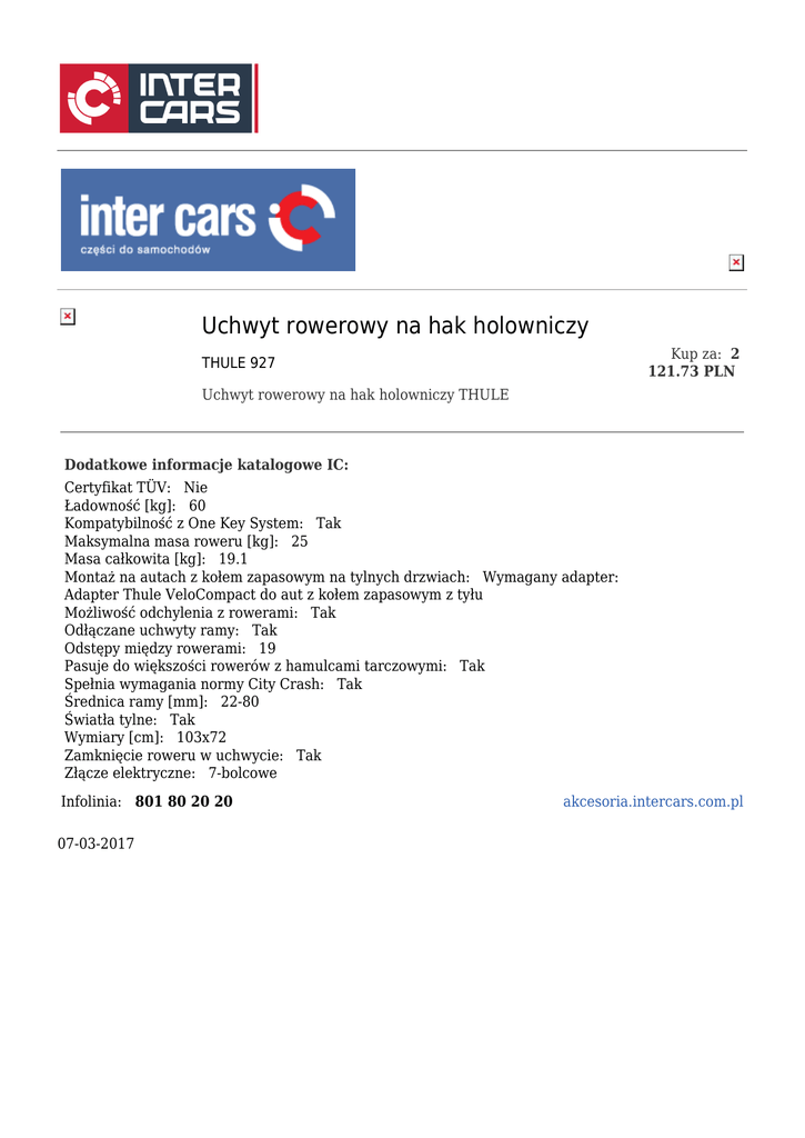 Uchwyt rowerowy na hak holowniczy Kup za: 2 121.73 PLN THULE 927 Uchwyt rowerowy na hak holowniczy THULE Dodatkowe informacje katalogowe IC: Certyfikat TÜV: Nie Ładowność [kg]: 60 Kompatybilność z One Key System: Tak Maksymalna masa roweru [kg]: 25 Masa całkowita [kg]: 19.1 Montaż na autach z kołem zapasowym na tylnych drzwiach: Wymagany adapter: Adapter Thule VeloCompact do aut z kołem zapasowym z tyłu Możliwość odchylenia z rowerami: Tak Odłączane uchwyty ramy: Tak Odstępy między rowerami: 19 Pasuje do większości rowerów z hamulcami tarczowymi: Tak Spełnia wymagania normy City Crash: Tak Średnica ramy [mm]: 22-80 Światła tylne: Tak Wymiary [cm]: 103x72 Zamknięcie roweru w uchwycie: Tak Złącze elektryczne: 7-bolcowe Infolinia: 801 80 20 20 07-03-2017 akcesoria.intercars.com.pl