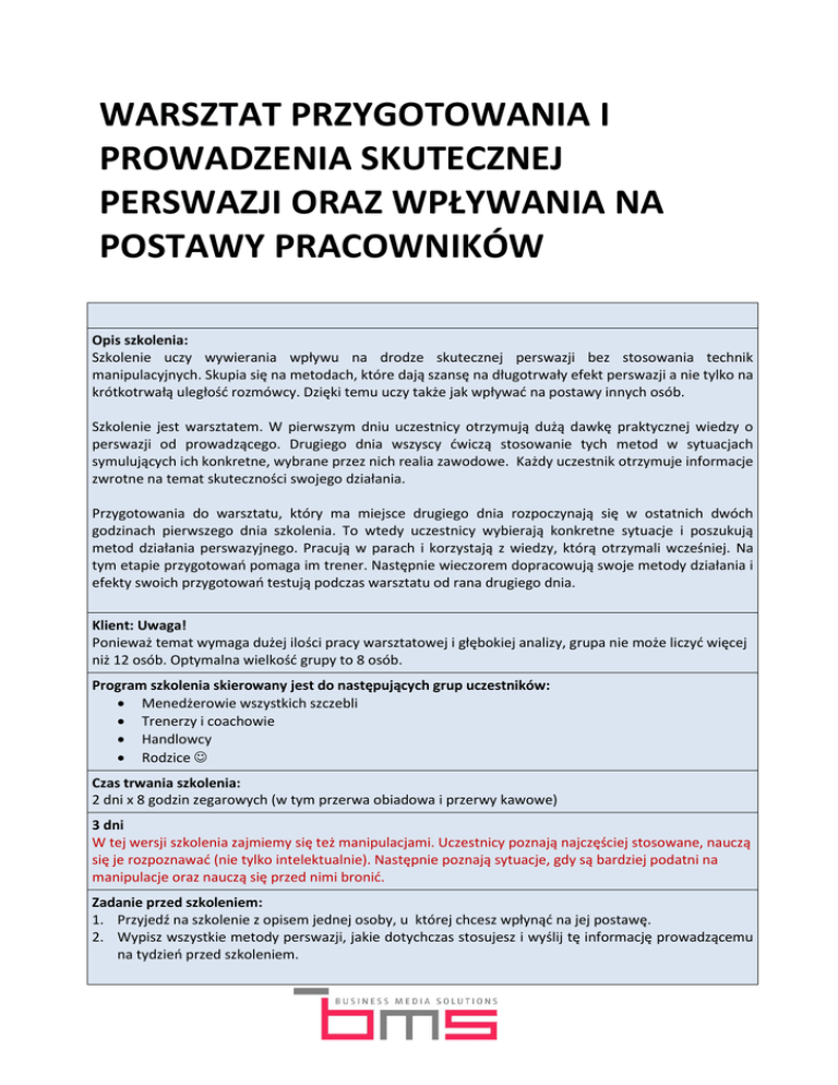 WARSZTAT PRZYGOTOWANIA I PROWADZENIA SKUTECZNEJ PERSWAZJI ORAZ WPŁYWANIA NA POSTAWY PRACOWNIKÓW Opis szkolenia: Szkolenie uczy wywierania wpływu na drodze skutecznej perswazji bez stosowania technik manipulacyjnych. Skupia się na metodach, które dają szansę na długotrwały efekt perswazji a nie tylko na krótkotrwałą uległość rozmówcy. Dzięki temu uczy także jak wpływać na postawy innych osób. Szkolenie jest warsztatem. W pierwszym dniu uczestnicy otrzymują dużą dawkę praktycznej wiedzy o perswazji od prowadzącego. Drugiego dnia wszyscy ćwiczą stosowanie tych metod w sytuacjach symulujących ich konkretne, wybrane przez nich realia zawodowe. Każdy uczestnik otrzymuje informacje zwrotne na temat skuteczności swojego działania. Przygotowania do warsztatu, który ma miejsce drugiego dnia rozpoczynają się w ostatnich dwóch godzinach pierwszego dnia szkolenia. To wtedy uczestnicy wybierają konkretne sytuacje i poszukują metod działania perswazyjnego. Pracują w parach i korzystają z wiedzy, którą otrzymali wcześniej. Na tym etapie przygotowań pomaga im trener. Następnie wieczorem dopracowują swoje metody działania i efekty swoich przygotowań testują podczas warsztatu od rana drugiego dnia. Klient: Uwaga! Ponieważ temat wymaga dużej ilości pracy warsztatowej i głębokiej analizy, grupa nie może liczyć więcej niż 12 osób. Optymalna wielkość grupy to 8 osób. Program szkolenia skierowany jest do następujących grup uczestników: Menedżerowie wszystkich szczebli Trenerzy i coachowie Handlowcy Rodzice Czas trwania szkolenia: 2 dni x 8 godzin zegarowych (w tym przerwa obiadowa i przerwy kawowe) 3 dni W tej wersji szkolenia zajmiemy się też manipulacjami. Uczestnicy poznają najczęściej stosowane, nauczą się je rozpoznawać (nie tylko intelektualnie). Następnie poznają sytuacje, gdy są bardziej podatni na manipulacje oraz nauczą się przed nimi bronić. Zadanie przed szkoleniem: 1. Przyjedź na szkolenie z opisem jednej osoby, u której chcesz wpłynąć na jej postawę. 2. Wypisz wszystkie metody perswazji, jakie dotychczas stosujesz i wyślij tę informację prowadzącemu na tydzień przed szkoleniem. Zadanie po szkoleniu: Zrealizuj w praktyce to, co ćwiczyłeś podczas warsztatu. Cel szkolenia: Podniesienie umiejętności przygotowania i poprowadzenia skutecznej perswazji. Nauczenie się inicjowania zmian postawy (lub jej przesunięcia) u pracowników. Cele szkolenia: Rozwój wiedzy Poznanie metod perswazji retorycznej centralnej oraz obwodowej. Poznanie metod perswazji narracyjnej. Poznanie zasad pracy na postawach według poziomów logicznych Diltsa. Przypomnienie metod dających efekt jednorazowy, niekiedy manipulacyjnych. Poznanie zasad komunikacji perswazyjnej. Doskonalenie praktycznych umiejętności Rozwój umiejętności stosowania metod opisanych powyżej. Przećwiczenie perswazji i pracy na postawach w konkretnych sytuacjach wybranych przez uczestników szkolenia. Rozwój świadomości i budowanie postaw Odróżnienie metod etycznych i bardziej skutecznych od metod krótko działających oraz od manipulacji. PROGRAM SZKOLENIA: Rozpoczęcie szkolenia. Przedstawienie się trenera i uczestników. Przedstawienie celów i agendy szkolenia. Przyjęcie zasad aktywnego uczestnictwa w szkoleniu. PIERWSZY DZIEŃ Dziękujemy za palenie Nasze przekonania o wywieraniu wpływu Dyskusja metodą Garden Party Fragment filmu pokazującego manipulacyjne wywieranie wpływu. 1. Co tym myślimy? 2. Czego się obawiamy? 3. Czego nie lubimy, gdy ktoś wywiera na nas wpływ lub, gdy my to robimy? Reklama Nieskuteczne metody działania w wywieraniu wpływu Praca w grupach i podsumowanie trenera Identyfikacja najczęściej stosowanych metod mało skutecznego wywierania wpływu. Wytłumaczenie, z jakiego powodu są mało skuteczne. Różnica między manipulacją a etycznym wywieraniem wpływu. Definicja Ustalenie reguł etycznego wywierania wpływu i perswazji. Sprawdzenie wpływu etycznej perswazji oraz manipulacji na długotrwała relację. Teoria planowanego zachowania Ajzenia Krótki wykład Droga do podjęcia decyzji o zmianie zachowania Perswazja retoryczna centralna Poznanie metodologii używania tej formy perswazji, poznanie Mini-wykład i wspólne poszukiwanie argumentów warunków jej skuteczności i przećwiczenie ich w krótkich odgrywaniach ról . Perswazja retoryczna peryferyjna Mini-wykład i wspólne poszukiwanie wskazówek kontekstowych Poznanie metodologii używania tej formy przećwiczenie ich w krótkich odgrywaniach ról. perswazji i Co wpływa na skuteczność informacji kontekstowych? Perswazja narracyjna – posłucha tej historii Opis metod Opis działania perswazji narracyjnej. Formy perswazji narracyjnej na przykładach trenera. Przykłady uczestników oraz informacje, jakie zmiany wywołała ta forma perswazji. Opór w perswazji Jak powstaje opór i dlaczego? Trzy rodzaje oporu i metody radzenia sobie z nim Poziomy logiczne Diltsa Mini wykład i opracowanie metod zastosowania przez uczestników w konkretnych przypadkach Metodologia pracy na postawie przez dostarczanie nowych umiejętności. Krótkotrwałe metody kojarzone z wywieraniem wpływu Przypomnienie sześciu reguł wpływu społecznego opisanych przez Roberta Cialdiniego. Uczestnicy po krótkim wykładzie trenera przygotowują plany działania dla rzeczywistych wybranych pracowników. Wytłumaczenie sposobu ich działania, ocena skuteczności i identyfikacja działań manipulacyjnych. Przygotowanie do wystąpień perswazyjnych Praca w parach pod opieką trenera Uczestnicy dobierają się w pary. Każda z osób identyfikuje rzeczywistą sytuację, w stosunku do konkretnej osoby u której chce wpłynąć na jej postawę lub zachować się perswazyjnie. Każda z osób rozpoczyna przygotowania do sesji warsztatowej korzystając z sugestii kolegi z pary oraz trenera. Przygotowania są dokańczane indywidualnie po zakończeniu pierwszego dnia szkolenia. DRUGI DZIEŃ 