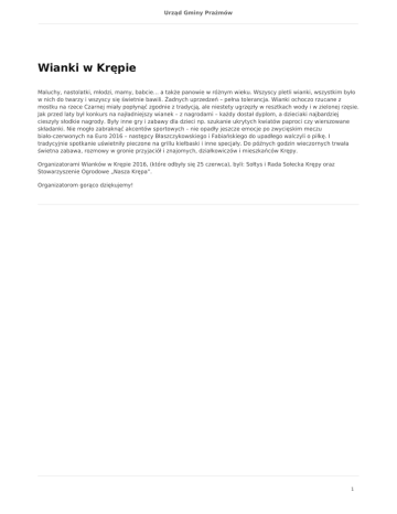 Urząd Gminy Prażmów Wianki w Krępie Maluchy, nastolatki, młodzi, mamy, babcie… a także panowie w różnym wieku. Wszyscy pletli wianki, wszystkim było w nich do twarzy i wszyscy się świetnie bawili. Żadnych uprzedzeń – pełna tolerancja. Wianki ochoczo rzucane z mostku na rzece Czarnej miały popłynąć zgodnie z tradycją, ale niestety ugrzęzły w resztkach wody i w zielonej rzęsie. Jak przed laty był konkurs na najładniejszy wianek – z nagrodami – każdy dostał dyplom, a dzieciaki najbardziej cieszyły słodkie nagrody. Były inne gry i zabawy dla dzieci np. szukanie ukrytych kwiatów paproci czy wierszowane składanki. Nie mogło zabraknąć akcentów sportowych – nie opadły jeszcze emocje po zwycięskim meczu biało-czerwonych na Euro 2016 – następcy Błaszczykowskiego i Fabiańskiego do upadłego walczyli o piłkę. I tradycyjnie spotkanie uświetniły pieczone na grillu kiełbaski i inne specjały. Do późnych godzin wieczornych trwała świetna zabawa, rozmowy w gronie przyjaciół i znajomych, działkowiczów i mieszkańców Krępy. Organizatorami Wianków w Krępie 2016, (które odbyły się 25 czerwca), byli: Sołtys i Rada Sołecka Krępy oraz Stowarzyszenie Ogrodowe „Nasza Krępa”. Organizatorom gorąco dziękujemy! 1