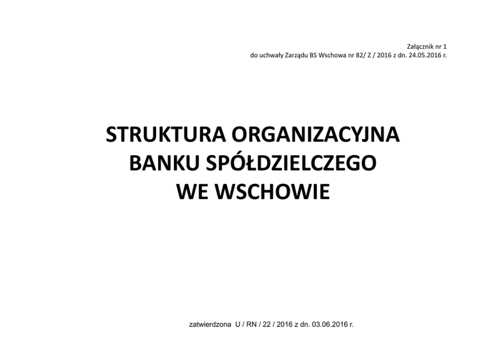 Załącznik nr 1 do uchwały Zarządu BS Wschowa nr 82/ Z / 2016 z dn. 24.05.2016 r. do uchwały Zarządu BS Wschowa nr 82/ Z / 2016 z dn. 24.05.2016 r. STRUKTURA ORGANIZACYJNA STRUKTURA ORGANIZACYJNA BANKU SPÓŁDZIELCZEGO WE WSCHOWIE zatwierdzona U / RN / 22 / 2016 z dn. 03.06.2016 r. STRUKTURA ORGANIZACYJNA BANKU SPÓŁDZIELCZEGO WE WSCHOWIE ZEBRANIE PRZEDSTAWICIELI BS RADA NADZORCZA BS ZARZĄD BS KOMITET KREDYTOWY KOMISJA DS. KOMISJA DS TWORZENIA REZERW CELOWYCH KOMITET ZARZĄDZANIA AKTYWAMI I PASYWAMI KOMITET DS. ROZWOJU IT I BEZPIECZŃSTWA Ń BANKU CENTRALA ODDZIAŁY WIODĄCE WIODĄCE ODDZIAŁY PODPORZĄDKOWANE zatwierdzona U / RN / 22 / 2016 z dn. 03.06.2016 r. PUNKTY KASOWE STRUKTURA FUNKCJONALNA BS WSCHOWA ZEBRANIE PRZEDSTAWICIELI BS KOMITET DS. ROZWOJU IT I BEZPIECZŃSTWA I BEZPIECZŃSTWA BANKU KOMISJA DS. TWORZENIA REZERW REZERW CELOWYCH RADA NADZORCZA BS BIURO ZARZĄDU ZARZĄD BS KOMITET ZARZĄDZANIA AKTYWAMI I AKTYWAMI I PASYWAMI KOMITET KREDYTOWY WICEPREZES ZARZĄDU BS PREZES ZARZĄDU BS PREZES ZARZĄDU BS WICEPREZES ZARZĄDU BS PION RYZYK PION ORGANIZACJI I ZARZĄDZANIA PION HANDLOWY WYDZIAŁ RYZYK BANKOWYCH GŁÓWNY KSIĘGOWY WYDZIAŁ ADMINISTRACJI WYDZIAŁ ANALIZ KREDYTOWYCH WYDZIAŁ EKONOMICZNY WYDZIAŁ INFORMATYKI WYDZIAŁ WERZYTELNOŚCI TRUDNYCH WYDZIAŁ OPERACJI MIĘDZYBANKOWYCH ADMINISTRATOR BEZPIECZEŃSTWA INFORMACJI zatwierdzona U / RN / 22 / 2016 z dn. 03.06.2016 r. WYDZIAŁ WYDZIAŁ KADR WYDZIAŁ KONTROLI WEWNĘTRZNEJ WEWNĘTRZNA SŁUŻBA OCHRONY DYREKTOR SIECI SPRZEDAŻY WYDZIAŁ MARKETINGU ODDZIAŁY BS WYDZIAŁ PRODUKTÓW I SYSTEMÓW BANKOWYCH STRUKTURA PODPORZĄDKOWANIA ODDZIAŁÓW BS WSCHOWA WICEPREZES ZARZĄDU Nadzorujący Pion Handlowy DYREKTOR SIECI SPRZEDAŻY DYREKTOR I ODDZIAŁU WSCHOWA DYREKTOR ODDZIAŁU GŁOGÓW DYREKTOR ODDZIAŁU RAWICZ I ODDZIAŁ WSCHOWA ODDZIAŁ SŁAWA ODDZIAŁ GŁOGÓW II ODDZIAŁ SC O WSCHOWA ODDZIAŁ SZLICHTYNGOWA ODDZIAŁ O KOTLA ODDZIAŁ LESZNO ODDZIAŁ NIECHLÓW ODDZIAŁ GRĘBOCICE ODDZIAŁ MIEJSKA GÓRKA PK MOCHY ODDZIAŁ NOWA SÓL ODDZIAŁ GÓRA PK KASZCZOR zatwierdzona U / RN / 22 / 2016 z dn. 03.06.2016 r. ODDZIAŁ RAWICZ DYREKTOR ODDZIAŁU PRZEMĘT ODDZIAŁ PRZEMĘT PK BUCZ DYREKTOR ODDZIAŁU POLKOWICE ODDZIAŁ WIJEWO ODDZIAŁ POLKOWICE ODDZIAŁ O S WOLSZTYN ODDZIAŁ CHOCIANÓW C OC Ó ODDZIAŁ RUDNA DYREKTOR ODDZIAŁU LUBIN ODDZIAŁ PROCHOWICE ODDZIAŁ LUBIN ODDZIAŁ O C MIŁKOWICE PK LEGNICA ODDZIAŁ ŚCINAWA PK LUBIN NR 1 PK RUJA ODDZIAŁ WIODĄCY – I ODDZIAŁ WSCHOWA DYREKTOR I ODDZIAŁU WSCHOWA I ODDZIAŁ WSCHOWA DZIAŁ OBSŁUGI KLIENTA DETALICZNEGO DZIAŁ OBSŁUGI KLIENTA BIZNESOWEGO KIEROWNIK DZIAŁU KIEROWNIK DZIAŁU STANOWISK A PRACY ODDZIAŁ SŁAWA II ODDZIAŁ WSCHOWA ODDZIAŁ NIECHLÓW ODDZIAŁ SZLICHTYNGOWA ODDZIAŁ LESZNO KIEROWNIK ODDZIAŁU KIEROWNIK ODDZIAŁU KIEROWNIK ODDZIAŁU KIEROWNIK ODDZIAŁU KIEROWNIK ODDZIAŁU STANOWISK A PRACY zatwierdzona U / RN / 22 / 2016 z dn. 03.06.2016 r. STANOWISK A PRACY STANOWISK A PRACY STANOWISK A PRACY STANOWISK A PRACY STANOWISK A PRACY ODDZIAŁ WIODĄCY – ODDZIAŁ RAWICZ DYREKTOR ODDZIAŁU RAWICZ ODDZIAŁ RAWICZ DZIAŁ OBSŁUGI KLIENTA DETALICZNEGO DZIAŁ OBSŁUGI KLIENTA BIZNESOWEGO KIEROWNIK DZIAŁU KIEROWNIK DZIAŁU STANOWISKA PRACY zatwierdzona U / RN / 22 / 2016 z dn. 03.06.2016 r. STANOWISKA PRACY ODDZIAŁ MIEJSKA GÓRKA ODDZIAŁ GÓRA KIEROWNIK ODDZIAŁU KIEROWNIK ODDZIAŁU STANOWISKA PRACY STANOWISKA PRACY ODDZIAŁ WIODĄCY – ODDZIAŁ PRZEMĘT DYREKTOR ODDZIAŁU PRZEMĘT ODDZIAŁ PRZEMĘT DZIAŁ OBSŁUGI KLIENTA DETALICZNEGO DZIAŁ OBSŁUGI KLIENTA BIZNESOWEGO KIEROWNIK DZIAŁU KIEROWNIK DZIAŁU PK MOCHY STANOWISKA PRACY PK BUCZ PK KASZCZOR zatwierdzona U / RN / 22 / 2016 z dn. 03.06.2016 r. STANOWISKA PRACY ODDZIAŁ WIJEWO ODDZIAŁ WOLSZTYN KIEROWNIK ODDZIAŁU KIEROWNIK ODDZIAŁU STANOWISKA PRACY STANOWISKA PRACY ODDZIAŁ WIODĄCY – ODDZIAŁ POLKOWICE DYREKTOR ODDZIAŁU POLKOWICE ODDZIAŁ POLKOWICE DZIAŁ OBSŁUGI KLIENTA DETALICZNEGO DZIAŁ OBSŁUGI KLIENTA BIZNESOWEGO KIEROWNIK DZIAŁU KIEROWNIK DZIAŁU STANOWISKA PRACY zatwierdzona U / RN / 22 / 2016 z dn. 03.06.2016 r. STANOWISKA PRACY ODDZIAŁ CHCIANÓW ODDZIAŁ RUDNA KIEROWNIK ODDZIAŁU KIEROWNIK ODDZIAŁU STANOWISKA PRACY STANOWISKA PRACY ODDZIAŁ WIODĄCY – ODDZIAŁ LUBIN DYREKTOR ODDZIAŁU LUBIN ODDZIAŁ LUBIN PK LEGNICA DZIAŁ OBSŁUGI KLIENTA DETALICZNEGO DZIAŁ OBSŁUGI KLIENTA BIZNESOWEGO KIEROWNIK DZIAŁU KIEROWNIK DZIAŁU STANOWISKA PRACY STANOWISKA PRACY PK LUBIN NR 1 PK RUJA zatwierdzona U / RN / 22 / 2016 z dn. 03.06.2016 r. ODDZIAŁ MIŁKOWICE ODDZIAŁ PROCHOWICE ODDZIAŁ ŚCINAWA KIEROWNIK ODDZIAŁU KIEROWNIK ODDZIAŁU KIEROWNIK ODDZIAŁU STANOWISKA PRACY STANOWISKA PRACY STANOWISKA PRACY ODDZIAŁ WIODĄCY – ODDZIAŁ GŁOGÓW DYREKTOR ODDZIAŁU GŁOGÓW ODDZIAŁ GŁOGÓW DZIAŁ OBSŁUGI KLIENTA DETALICZNEGO DZIAŁ OBSŁUGI KLIENTA BIZNESOWEGO KIEROWNIK DZIAŁU KIEROWNIK DZIAŁU STANOWISKA PRACY zatwierdzona U / RN / 22 / 2016 z dn. 03.06.2016 r. STANOWISKA PRACY ODDZIAŁ KOTLA ODDZIAŁ GRĘBOCICE ODDZIAŁ NOWA SÓL KIEROWNIK ODDZIAŁU KIEROWNIK ODDZIAŁU KIEROWNIK ODDZIAŁU STANOWISKA PRACY STANOWISKA PRACY STANOWISKA PRACY