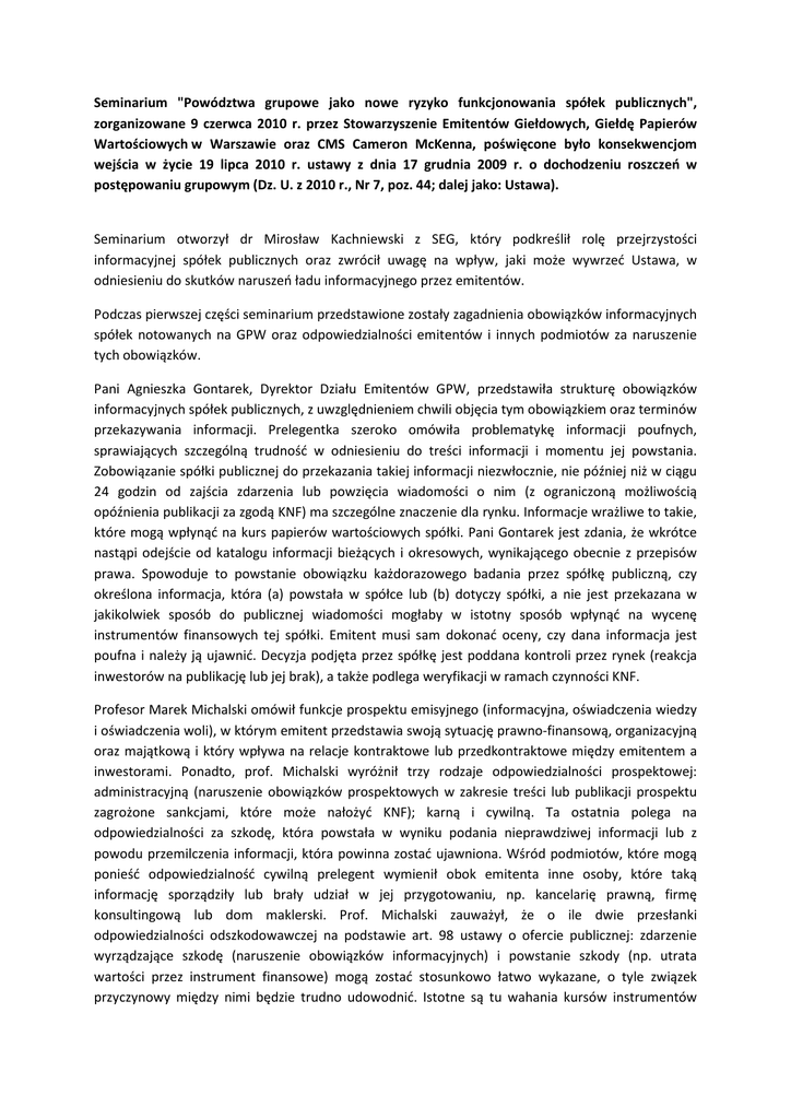 Seminarium "Powództwa grupowe jako nowe ryzyko funkcjonowania spółek publicznych", zorganizowane 9 czerwca 2010 r. przez Stowarzyszenie Emitentów Giełdowych, Giełdę Papierów Wartościowych w Warszawie oraz CMS Cameron McKenna, poświęcone było konsekwencjom wejścia w życie 19 lipca 2010 r. ustawy z dnia 17 grudnia 2009 r. o dochodzeniu roszczeń w postępowaniu grupowym (Dz. U. z 2010 r., Nr 7, poz. 44; dalej jako: Ustawa). Seminarium otworzył dr Mirosław Kachniewski z SEG, który podkreślił rolę przejrzystości informacyjnej spółek publicznych oraz zwrócił uwagę na wpływ, jaki może wywrzeć Ustawa, w odniesieniu do skutków naruszeń ładu informacyjnego przez emitentów. Podczas pierwszej części seminarium przedstawione zostały zagadnienia obowiązków informacyjnych spółek notowanych na GPW oraz odpowiedzialności emitentów i innych podmiotów za naruszenie tych obowiązków. Pani Agnieszka Gontarek, Dyrektor Działu Emitentów GPW, przedstawiła strukturę obowiązków informacyjnych spółek publicznych, z uwzględnieniem chwili objęcia tym obowiązkiem oraz terminów przekazywania informacji. Prelegentka szeroko omówiła problematykę informacji poufnych, sprawiających szczególną trudność w odniesieniu do treści informacji i momentu jej powstania. Zobowiązanie spółki publicznej do przekazania takiej informacji niezwłocznie, nie później niż w ciągu 24 godzin od zajścia zdarzenia lub powzięcia wiadomości o nim (z ograniczoną możliwością opóźnienia publikacji za zgodą KNF) ma szczególne znaczenie dla rynku. Informacje wrażliwe to takie, które mogą wpłynąć na kurs papierów wartościowych spółki. Pani Gontarek jest zdania, że wkrótce nastąpi odejście od katalogu informacji bieżących i okresowych, wynikającego obecnie z przepisów prawa. Spowoduje to powstanie obowiązku każdorazowego badania przez spółkę publiczną, czy określona informacja, która (a) powstała w spółce lub (b) dotyczy spółki, a nie jest przekazana w jakikolwiek sposób do publicznej wiadomości mogłaby w istotny sposób wpłynąć na wycenę instrumentów finansowych tej spółki. Emitent musi sam dokonać oceny, czy dana informacja jest poufna i należy ją ujawnić. Decyzja podjęta przez spółkę jest poddana kontroli przez rynek (reakcja inwestorów na publikację lub jej brak), a także podlega weryfikacji w ramach czynności KNF. Profesor Marek Michalski omówił funkcje prospektu emisyjnego (informacyjna, oświadczenia wiedzy i oświadczenia woli), w którym emitent przedstawia swoją sytuację prawno-finansową, organizacyjną oraz majątkową i który wpływa na relacje kontraktowe lub przedkontraktowe między emitentem a inwestorami. Ponadto, prof. Michalski wyróżnił trzy rodzaje odpowiedzialności prospektowej: administracyjną (naruszenie obowiązków prospektowych w zakresie treści lub publikacji prospektu zagrożone sankcjami, które może nałożyć KNF); karną i cywilną. Ta ostatnia polega na odpowiedzialności za szkodę, która powstała w wyniku podania nieprawdziwej informacji lub z powodu przemilczenia informacji, która powinna zostać ujawniona. Wśród podmiotów, które mogą ponieść odpowiedzialność cywilną prelegent wymienił obok emitenta inne osoby, które taką informację sporządziły lub brały udział w jej przygotowaniu, np. kancelarię prawną, firmę konsultingową lub dom maklerski. Prof. Michalski zauważył, że o ile dwie przesłanki odpowiedzialności odszkodowawczej na podstawie art. 98 ustawy o ofercie publicznej: zdarzenie wyrządzające szkodę (naruszenie obowiązków informacyjnych) i powstanie szkody (np. utrata wartości przez instrument finansowe) mogą zostać stosunkowo łatwo wykazane, o tyle związek przyczynowy między nimi będzie trudno udowodnić. Istotne są tu wahania kursów instrumentów finansowych, czyli wpływ jaki miało podanie nieprawdziwych informacji lub niepodanie informacji z punktu widzeniu racjonalnego (modelowego) inwestora. W ocenie prof. Michalskiego, wymaganie udowodnienia związku przyczynowego między naruszeniem obowiązków informacyjnych a decyzją konkretnego inwestora byłoby zbyt rygorystyczne. Wystąpienia w drugiej części seminarium były poświęcone bezpośrednio Ustawie. Zarówno dr Monika Rejdak, jak i adw. Paweł Pietkiewicz, brali udział w opracowaniu projektu Ustawy. Następnie w ramach case study omówiony został głośny przypadek naruszenia w 2006 r. obowiązków informacyjnych przez jedną ze spółek publicznych oraz przedstawione zostały potencjalne skutki, jakie mogłaby spowodować Ustawa w podobnym stanie faktycznym. Dr Rejdak przedstawiła strukturę Ustawy, będącej regulacją procesową, umożliwiającą grupowe dochodzenie jednorodzajowych roszczeń, między którymi występuje związek faktyczny. Istotne jest, czy i w jakim stopniu kwestie wspólne dla całej grupy przeważają nad zagadnieniami ściśle indywidualnymi. Podczas prezentacji dr Rejdak zwróciła uwagę, że Ustawa jest istotna nie tylko z punktu widzenia emitentów będących producentami lub wprowadzającymi produkty do obrotu (co może prowadzić do odpowiedzialności za produkt niebezpieczny), ale także każdego emitenta, który świadczy masowe usługi. Taki przedsiębiorca na podstawie wzorców umów (formularzy, regulaminów, ogólnych warunków umów) zawiera ze swoimi klientami tysiące identycznych kontraktów. Konsumenci będą mogli dzięki Ustawie dochodzić roszczeń pieniężnych wynikających z takich umów, a suma pojedynczych drobnych roszczeń może skutkować znaczną kwotą dochodzoną w postępowaniu grupowym. Dr Rejdak zwróciła uwagę na wątpliwość, która powstaje w odniesieniu do zakresu przedmiotowego Ustawy dotyczącej „roszczeń z tytułu czynów niedozwolonych, z wyjątkiem roszczeń o ochronę dóbr osobistych” (art. 1 ust. 2 Ustawy). Poprawka ta została wprowadzona w toku prac sejmowych. Może ona skutkowa