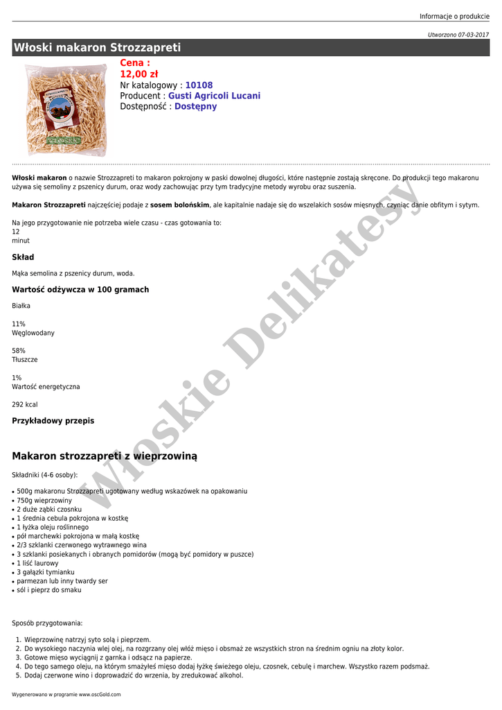 Informacje o produkcie Utworzono 07-03-2017 Włoski makaron Strozzapreti Cena : 12,00 zł Nr katalogowy : 10108 Producent : Gusti Agricoli Lucani Dostępność : Dostępny es y Włoski makaron o nazwie Strozzapreti to makaron pokrojony w paski dowolnej długości, które następnie zostają skręcone. Do produkcji tego makaronu używa się semoliny z pszenicy durum, oraz wody zachowując przy tym tradycyjne metody wyrobu oraz suszenia. Makaron Strozzapreti najczęściej podaje z sosem bolońskim, ale kapitalnie nadaje się do wszelakich sosów mięsnych, czyniąc danie obfitym i sytym. ik at Na jego przygotowanie nie potrzeba wiele czasu - czas gotowania to: 12 minut Skład Mąka semolina z pszenicy durum, woda. Wartość odżywcza w 100 gramach el Białka D 11% Węglowodany 1% Wartość energetyczna W ło sk 292 kcal ie 58% Tłuszcze Przykładowy przepis Makaron strozzapreti z wieprzowiną Składniki (4-6 osoby): ● ● ● ● ● ● ● ● ● ● ● ● 500g makaronu Strozzapreti ugotowany według wskazówek na opakowaniu 750g wieprzowiny 2 duże ząbki czosnku 1 średnia cebula pokrojona w kostkę 1 łyżka oleju roślinnego pół marchewki pokrojona w małą kostkę 2/3 szklanki czerwonego wytrawnego wina 3 szklanki posiekanych i obranych pomidorów (mogą być pomidory w puszce) 1 liść laurowy 3 gałązki tymianku parmezan lub inny twardy ser sól i pieprz do smaku Sposób przygotowania: 1. 2. 3. 4. 5. Wieprzowinę natrzyj syto solą i pieprzem. Do wysokiego naczynia wlej olej, na rozgrzany olej włóż mięso i obsmaż ze wszystkich stron na średnim ogniu na złoty kolor. Gotowe mięso wyciągnij z garnka i odsącz na papierze. Do tego samego oleju, na którym smażyłeś mięso dodaj łyżkę świeżego oleju, czosnek, cebulę i marchew. Wszystko razem podsmaż. Dodaj czerwone wino i doprowadzić do wrzenia, by zredukować alkohol. Wygenerowano w programie www.oscGold.com W ło sk ie D el ik at es y 6. Dodaj pomidory, liść laurowy i tymianek do garnka, oraz usmażoną wieprzowinę. Przykryj luźno pokrywką (pozostawiając uchylone wieko). Zmniejsz ogień do minimum i gotuj na wolnym ogniu przez około 3 godziny lub do czasu, gdy można łatwo wbić widelec w wieprzowinę. Pamiętaj, by przerzucić wieprzowina kilka razy, jeśli nie jest w pełni pokryta sosem. 7. Wyciągnij mięso , usuń nadmiar tłuszczu z wierzchu sosu i gotuj sos aż zgęstnieje. 8. Ugotuj makaron według wskazówek na opakowaniu. 9. Wsyp ugotowany makaron al dente do sosu, dobrze wymieszaj i razem wszystko podgrzej. 10. Wyłóż makaron na talerz, dodaj pokrojone w cienkie paski mięso i wszystko posyp startym parmezanem. Waga netto: 500g