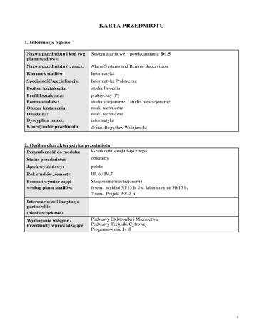KARTA PRZEDMIOTU 1. Informacje ogólne Nazwa przedmiotu i kod (wg planu studiów): System alarmowe i powiadamiania D1.5 Nazwa przedmiotu (j. ang.): Alarm Systems and Remote Supervision Kierunek studiów: Informatyka Specjalność/specjalizacja: Informatyka Praktyczna Poziom kształcenia: studia I stopnia Profil kształcenia: Forma studiów: Obszar kształcenia: Dziedzina: Dyscyplina nauki: Koordynator przedmiotu: praktyczny (P) studia stacjonarne / studia niestacjonarne nauki techniczne nauki techniczne informatyka dr inż. Bogusław Wiśniewski 2. Ogólna charakterystyka przedmiotu Przynależność do modułu: kształcenia specjalistycznego Status przedmiotu: obieralny Język wykładowy: polski Rok studiów, semestr: III, 6 / IV,7 Forma i wymiar zajęć według planu studiów: Stacjonarne/niestacjonarne 6 sem.: wykład 30/15 h, ćw. laboratoryjne 30/15 h, 7 sem. Projekt 30/15 h; Interesariusze i instytucje partnerskie (nieobowiązkowe) Wymagania wstępne / Przedmioty wprowadzające: Podstawy Elektroniki i Miernictwa Podstawy Techniki Cyfrowej Programowanie I / II 1 5 A. Liczba godzin wymagających bezpośredniego udziału nauczyciela (kontaktowych, w czasie rzeczywistym, w tym testy, egzaminy etc) z podziałem na typy zajęć oraz całkowita liczba punktów ECTS osiąganych na tych zajęciach wykład laboratorium projekt konsultacje stacjonarne Całkowita liczba punktów ECTS (wg planu studiów; 1 punkt =25-30 godzin pracy studenta, w tym praca na zajęciach i poza zajęciami): 30 30 30 10 15 15 15 20 100 3,5 5 15 5 15 2 3 65 2,5 15 5 5 20 5 15 laboratorium przygotowanie do kolokwium 45 1,5 30 5 65 2,5 15 20 w sumie: 35 35 ECTS 1,4 1,4 W sumie: ECTS B. Poszczególne typy zadań do samokształcenia studenta (niewymagających bezpośredniego udziału nauczyciela) wraz z planowaną średnią liczbą godzin na każde i sumaryczną liczbą ECTS (np. praca w bibliotece, w sieci, na platformie e-learningowej, w laboratorium, praca nad projektem końcowym, przygotowanie ogólne; suma poszczególnych godzin powinna zgadzać się z liczbą ogólną) Niestacjonarne 3.1 Bilans punktów ECTS semestr 6 przygotowanie do kolokwium przygotowanie do laboratorium przygotowanie sprawozdań praca w sieci uzupełnienie/studiowanie notatek studiowanie zalecanej literatury w sumie: ECTS C. Liczba godzin praktycznych/laboratoryjnych w ramach przedmiotu oraz związana z tym liczba punktów ECTS (ta liczba nie musi być powiązana z liczbą godzin kontaktowych, niektóre zajęcia praktyczne/laboratoryjne mogą odbywać się bez udziału nauczyciela): 4. Opis przedmiotu Cel przedmiotu: Celem przedmiotu jest zapoznanie studenta z praktycznymi aspektami instalacji i konfiguracji systemów alarmowych z uwzględnieniem nadzoru zdalnego Metody dydaktyczne: wykład informacyjny, ćwiczenia laboratoryjne, projekt Treści kształcenia Wykłady: Ogólna struktura systemu alarmowego – centrala, manipulator, czujki, układy komunikacji i pomocnicze. Centrale przewodowe i bezprzewodowe. Zasady działania i własności czujek PIR, dualnej, ciepła/dymu, gazów (CO, LPG), magnetycznej, bariery podczerwieni, ultradźwiękowej. Konfiguracja pracy czujek – sabotaż, łączenie szeregowe. Dopasowanie struktury systemu alarmowego do dozorowanego obiektu. Konfiguracja systemu alarmowego na przykładzie programu DLOAD firmy Satel – czujki, sygnalizatory, ekspandery, czytniki kart magnetycznych. Łączność z centralą poprzez telefon, sieć GSM oraz Internet. 2 Ćwiczenia laboratoryjne: 1. Badanie podstawowych czujek ruchu (typu PIR i dualnej) 2. Dostęp do centrali poprzez manipulator 3. Badanie czujek specjalistycznych 4. Komunikacja pomiędzy centralą a programem konfiguracyjnym w komputerze nadrzędnym 5. Regulator temperatury 6. Ekspandery wejść i wyjść, użycie sygnalizatora 7. Aktywacje i dezaktywacja dozoru poprzez karty magnetyczne 8. Komunikacja z centralą przy pomocy sms 9. Dostęp do centrali poprzez Internet Projekt: 1.Zapoznanie się ze Szkolnym Systemem Alarmowym (II piętro obiektu) – samodzielne modyfikacje konfiguracji 2. Samodzielny montaż i konfiguracja systemu alarmowego o parametrach podanych przez prowadzącego (z użyciem uniwersalnego stanowiska) 5. Efekty kształcenia i sposoby weryfikacji Efekty kształcenia Efekt przedmiotu Student, który zaliczył przedmiot (spełnił minimum wymagań) Efekt kierunkowy D1.5_K_W01 D1.5_K_W02 Wiedza: 1. Posiada wiedzę niezbędną do zrozumienia działania systemu alarmowego K_W02 2. Dysponuje wiedzą potrzebną do zaprojektowania prostego przewodowe- K_W03 go systemu alarmowego K_W17 D1.5_K_U01 Umiejętności 1. Potrafi zanalizować istniejący system alarmowy 2. Potrafi zainstalować i uruchomić prosty przewodowy system alarmowy D1.5_K_U02 D1.5_K_K01 K_U02 K_U07 K_U14 Kompetencje społeczne 1.Potrafi podjąć pracę w zespole instalującym i konfigurującym systemy K_K04 alarmowe Sposoby weryfikacji efektów kształcenia: Lp. Efekt przedmiotu Sposób weryfikacji Ocena formująca Ocena wa końco- 1 D1.5_K_W01 D1.5_K_U01 Ćwiczenia laboratoryjne sprawdzian wiedzy, sprawdzian umiejętności rozwiązanie zadania problemowego, analiza zadanego przykładu 2 D1.5_K_W02 D1.5_K_U02 D1.5_K_K01 Projekt Praktyczne uru- demonstracja chomienie i konfi- praktycznych guracja umiejętności 3 Kryteria oceny w zakresie wiedzy Efekt kształcenia D1.5_K_W01 D1.5_K_W02 Na ocenę 3,0 Zna pojęcia teoretyczne i przykłady praktycznych rozwiązań Na ocenę 5,0 Potrafi zastosować zdobyte wiadomości do realizacji praktycznych D1.5_K_W01 D1.5_K_W02 aplikacji w zakresie umiejętności Na ocenę 3,0 Potrafi przeprowadzić analizę działania systemu alarmowego D1.5_K_U01 D1,14_K_U02 Na ocenę 5,0 Potrafi zaprojektować i wykonać praktycznie prostą instalację alar- D1.5_K_U01 mowa D1.5_K_U02 w zakresie kompetencji społecznych Na ocenę 3,0 Na ocenę 5,0 Potrafi pracując w zespole zaprojektować i wykonać i skonfiguro- D1.5_K_K01 wać przewodowy system alarmowy Potrafi pełni