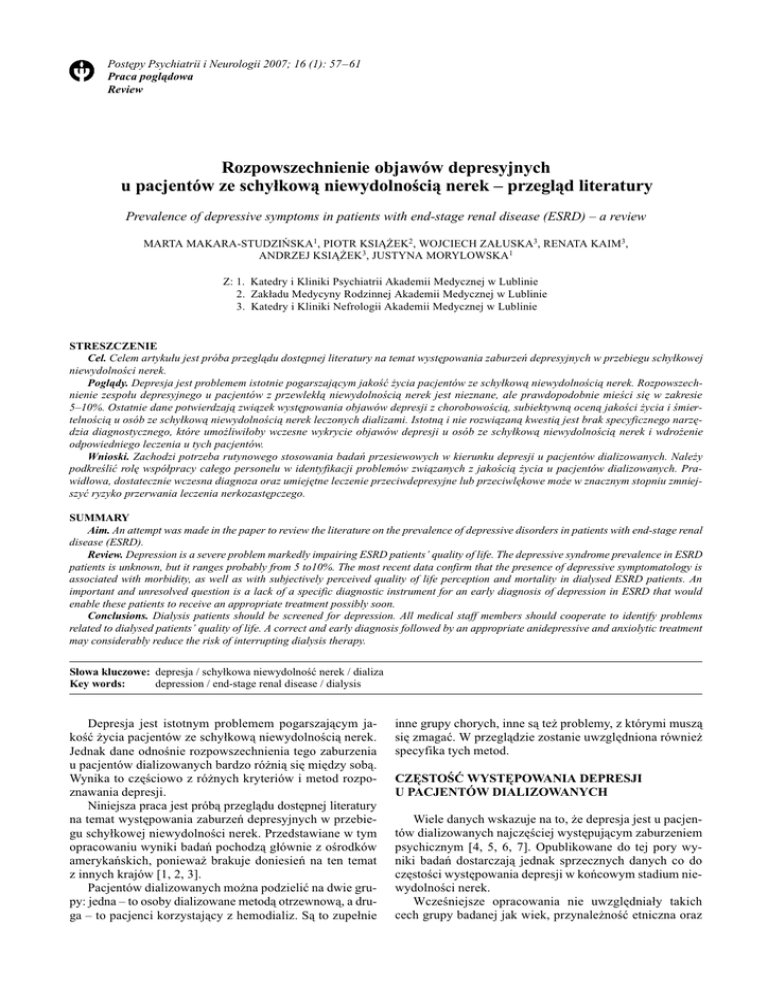 Postêpy Psychiatrii i Neurologii 2007; 16 (1): 5761 Praca pogl¹dowa Review Rozpowszechnienie objawów depresyjnych u pacjentów ze schy³kow¹ niewydolnoci¹ nerek przegl¹d literatury Prevalence of depressive symptoms in patients with end-stage renal disease (ESRD) a review MARTA MAKARA-STUDZIÑSKA1, PIOTR KSI¥¯EK2, WOJCIECH ZA£USKA3, RENATA KAIM3, ANDRZEJ KSI¥¯EK3, JUSTYNA MORYLOWSKA1 Z: 1. Katedry i Kliniki Psychiatrii Akademii Medycznej w Lublinie 2. Zak³adu Medycyny Rodzinnej Akademii Medycznej w Lublinie 3. Katedry i Kliniki Nefrologii Akademii Medycznej w Lublinie STRESZCZENIE Cel. Celem artyku³u jest próba przegl¹du dostêpnej literatury na temat wystêpowania zaburzeñ depresyjnych w przebiegu schy³kowej niewydolnoci nerek. Pogl¹dy. Depresja jest problemem istotnie pogarszaj¹cym jakoæ ¿ycia pacjentów ze schy³kow¹ niewydolnoci¹ nerek. Rozpowszechnienie zespo³u depresyjnego u pacjentów z przewlek³¹ niewydolnoci¹ nerek jest nieznane, ale prawdopodobnie mieci siê w zakresie 510%. Ostatnie dane potwierdzaj¹ zwi¹zek wystêpowania objawów depresji z chorobowoci¹, subiektywn¹ ocen¹ jakoci ¿ycia i miertelnoci¹ u osób ze schy³kow¹ niewydolnoci¹ nerek leczonych dializami. Istotn¹ i nie rozwi¹zan¹ kwesti¹ jest brak specyficznego narzêdzia diagnostycznego, które umo¿liwi³oby wczesne wykrycie objawów depresji u osób ze schy³kow¹ niewydolnoci¹ nerek i wdro¿enie odpowiedniego leczenia u tych pacjentów. Wnioski. Zachodzi potrzeba rutynowego stosowania badañ przesiewowych w kierunku depresji u pacjentów dializowanych. Nale¿y podkreliæ rolê wspó³pracy ca³ego personelu w identyfikacji problemów zwi¹zanych z jakoci¹ ¿ycia u pacjentów dializowanych. Prawid³owa, dostatecznie wczesna diagnoza oraz umiejêtne leczenie przeciwdepresyjne lub przeciwlêkowe mo¿e w znacznym stopniu zmniejszyæ ryzyko przerwania leczenia nerkozastêpczego. SUMMARY Aim. An attempt was made in the paper to review the literature on the prevalence of depressive disorders in patients with end-stage renal disease (ESRD). Review. Depression is a severe problem markedly impairing ESRD patients quality of life. The depressive syndrome prevalence in ESRD patients is unknown, but it ranges probably from 5 to10%. The most recent data confirm that the presence of depressive symptomatology is associated with morbidity, as well as with subjectively perceived quality of life perception and mortality in dialysed ESRD patients. An important and unresolved question is a lack of a specific diagnostic instrument for an early diagnosis of depression in ESRD that would enable these patients to receive an appropriate treatment possibly soon. Conclusions. Dialysis patients should be screened for depression. All medical staff members should cooperate to identify problems related to dialysed patients quality of life. A correct and early diagnosis followed by an appropriate anidepressive and anxiolytic treatment may considerably reduce the risk of interrupting dialysis therapy. S³owa kluczowe: depresja / schy³kowa niewydolnoæ nerek / dializa Key words: depression / end-stage renal disease / dialysis Depresja jest istotnym problemem pogarszaj¹cym jakoæ ¿ycia pacjentów ze schy³kow¹ niewydolnoci¹ nerek. Jednak dane odnonie rozpowszechnienia tego zaburzenia u pacjentów dializowanych bardzo ró¿ni¹ siê miêdzy sob¹. Wynika to czêciowo z ró¿nych kryteriów i metod rozpoznawania depresji. Niniejsza praca jest prób¹ przegl¹du dostêpnej literatury na temat wystêpowania zaburzeñ depresyjnych w przebiegu schy³kowej niewydolnoci nerek. Przedstawiane w tym opracowaniu wyniki badañ pochodz¹ g³ównie z orodków amerykañskich, poniewa¿ brakuje doniesieñ na ten temat z innych krajów [1, 2, 3]. Pacjentów dializowanych mo¿na podzieliæ na dwie grupy: jedna to osoby dializowane metod¹ otrzewnow¹, a druga to pacjenci korzystaj¹cy z hemodializ. S¹ to zupe³nie inne grupy chorych, inne s¹ te¿ problemy, z którymi musz¹ siê zmagaæ. W przegl¹dzie zostanie uwzglêdniona równie¿ specyfika tych metod. CZÊSTOÆ WYSTÊPOWANIA DEPRESJI U PACJENTÓW DIALIZOWANYCH Wiele danych wskazuje na to, ¿e depresja jest u pacjentów dializowanych najczêciej wystêpuj¹cym zaburzeniem psychicznym [4, 5, 6, 7]. Opublikowane do tej pory wyniki badañ dostarczaj¹ jednak sprzecznych danych co do czêstoci wystêpowania depresji w koñcowym stadium niewydolnoci nerek. Wczeniejsze opracowania nie uwzglêdnia³y takich cech grupy badanej jak wiek, przynale¿noæ etniczna oraz 58 Marta Makara-Studziñska, Piotr Ksi¹¿ek, Wojciech Za³uska, Renata Kaim, Andrzej Ksi¹¿ek, Justna Morylowska czas, jaki up³yn¹³ od ostatniej dializy, a tak¿e stopieñ nasilenia choroby nerek [8]. Pomimo, ¿e nie znamy prawdziwego rozpowszechnienia depresji w tej grupie chorych, ostatnie badania przesiewowe przeprowadzone na wiêkszych liczebnie miêdzynarodowych grupach dostarczy³y wiêcej istotnych danych [9]. Czêstoæ wystêpowania zaburzeñ depresyjnych u pacjentów dializowanych szacuje siê odpowiednio na poziomie 25% u pacjentów poddawanych hemodializom i 30% u pacjentów dializowanych otrzewnowo [10, 11, 12, 13]. Chen i wsp. [14] oszacowali czêstoæ depresji u pacjentów przewlekle dializowanych na 33%. Czêstsze wystêpowanie depresji wykazano u pacjentów ze wspó³istniej¹c¹ cukrzyc¹. Pacjenci z chorobami nerek s¹ nara¿eni na wiele stresorów, w³¹czaj¹c w to utratê fizjologicznych funkcji nerek, zaburzenia uk³adu trawiennego, zaburzenia neurologiczne, choroby koci, anemiê, niemo¿noæ normalnego funkcjonowania w rodzinie, utrzymania zatrudnienia, obni¿on¹ mobilnoæ, zaburzenia funkcji poznawczych [2, 4, 7] oraz utratê sprawnoci seksualnej [4, 7, 15, 16]. Przed rozpoczêciem leczenia nerkozastêpczego, znaczna grupa osób ze schy³kow¹ niewydolnoci¹ nerek cierpi z powodu zaburzeñ lêkowych i depresji [1, 17, 18]. Czêstoæ du¿ej depresji u pacjentów dializowanych otrzewnowo 
