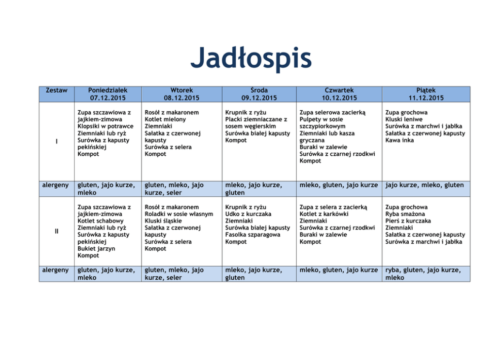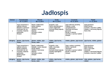 Jadłospis Zestaw I alergeny II alergeny Poniedziałek 07.12.2015 Wtorek 08.12.2015 Środa 09.12.2015 Czwartek 10.12.2015 Piątek 11.12.2015 Zupa szczawiowa z jajkiem-zimowa Klopsiki w potrawce Ziemniaki lub ryż Surówka z kapusty pekińskiej Kompot Rosół z makaronem Kotlet mielony Ziemniaki Sałatka z czerwonej kapusty Surówka z selera Kompot Krupnik z ryżu Placki ziemniaczane z sosem węgierskim Surówka białej kapusty Kompot Zupa selerowa zacierką Pulpety w sosie szczypiorkowym Ziemniaki lub kasza gryczana Buraki w zalewie Surówka z czarnej rzodkwi Kompot Zupa grochowa Kluski leniwe Surówka z marchwi i jabłka Sałatka z czerwonej kapusty Kawa inka gluten, jajo kurze, mleko gluten, mleko, jajo kurze, seler mleko, jajo kurze, gluten mleko, gluten, jajo kurze jajo kurze, mleko, gluten Zupa szczawiowa z jajkiem-zimowa Kotlet schabowy Ziemniaki lub ryż Surówka z kapusty pekińskiej Bukiet jarzyn Kompot Rosół z makaronem Roladki w sosie własnym Kluski śląskie Sałatka z czerwonej kapusty Surówka z selera Kompot Krupnik z ryżu Udko z kurczaka Ziemniaki Surówka białej kapusty Fasolka szparagowa Kompot Zupa z selera z zacierką Kotlet z karkówki Ziemniaki Surówka z czarnej rzodkwi Buraki w zalewie Kompot Zupa grochowa Ryba smażona Pierś z kurczaka Ziemniaki Sałatka z czerwonej kapusty Surówka z marchwi i jabłka gluten, jajo kurze, mleko gluten, mleko, jajo kurze, seler mleko, jajo kurze, gluten mleko, gluten, jajo kurze ryba, gluten, jajo kurze, mleko