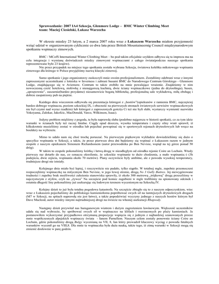 Sprawozdanie: 2007 IA4 Szkocja, Glenmore Lodge – BMC Winter Climbing Meet team: Maciej Ciesielski, Łukasz Warzecha W okresie miedzy 23 lutym, a 2 marca 2007 roku wraz z Łukaszem Warzecha miałem przyjemność wziąć udział w organizowanym cyklicznie co dwa lata przez British Mountaineernig Council międzynarodowym spotkaniu wspinaczy zimowych. BMC / MCofS International Winter Climbing Meet – bo pod takim oficjalnie szyldem odbywa się ta impreza ma na celu integracje i wymianę doświadczeń miedzy zimowymi wspinaczami z całego świata(podczas naszego spotkania reprezentowane było 23 krajów). Nie przez przypadek na miejsce tego spotkania została wybrana Szkocja, światowa kolebka mikstowego wspinania zimowego dla którego w Polsce przyjęliśmy nazwę klasyki zimowej. Samo spotkanie i jego organizatorzy zaskoczyli mnie swoim profesjonalizmem. Zostaliśmy odebrani wraz z innymi zaproszonymi uczestnikami z lotniska w Inverness i zabrani busami BMC do Narodowego Centrum Górskiego - Glenmore Lodge, znajdującego się w Aviemore. Centrum to także zrobiło na mnie powalające wrażenie. Znajdziemy w nim nowoczesną cześć hotelową, stołówkę z nienajgorszą kuchnią, dwie ściany wspinaczkowe (jedna do drytoolingu), basen, „sprzętownie”, suszarnie(bardzo przydatne) niesamowicie bogatą bibliotekę, profesjonalną sale wykładową, miłą obsługę i dobrze zaopatrzony pub na piętrze. Każdego dnia wieczorem odbywała się prezentacja któregoś z „hostów”(opiekunów z ramienia BMC, najczęściej bardzo dobrego wspinacza, poziom szkockiej IX, i obecność na pierwszych stronach światowych serwisów wspinaczkowych nie był czymś nad wyraz rzadkim) lub któregoś z zaproszonych gości(a Ci też nie byli słabi, wystarczy wymienić nazwiska Yokoyama, Zalokar, Jakofcic, MacDonald, Varco, Wilkinson, Isaac). Jedyny problem mięliśmy z pogoda, ta była naprawdę słaba (podobno najgorsza w historii spotkań), co za tym idzie warunki w ścianach były też raczej fatalne. Ciągły opad deszczu, wysoka temperatura i częsty silny wiatr sprawił, iż kilkukrotnie musieliśmy zostać w ośrodku lub pojechać powspinać się w sportowych rejonach drytoolowych lub wręcz na bouldery na wybrzeże. Mimo to udało nam się choć trochę poruszać. Na pierwszym piątkowym wykładzie dowiedzieliśmy się dużo o specyfice wspinania w Szkocji, a także, że przez pierwsze dwa dni będziemy się wspinać z Łukaszem razem w jednym zespole z naszym opiekunem Simonem Richardsonem (autor przewodnika po Ben Nevisie, wspiął na tej górze ponad 50 dróg). W takim to zespole pokonaliśmy krótką i łatwą drogę w nieodległym od ośrodka rejonie Coire an Lochain. Wtedy pierwszy raz dotarło do nas, co oznacza określenie, że szkockie wspinanie to dużo chodzenia, a mało wspinania;-) (3h podejścia, dwie zejścia, wspinania około 70 metrów). Plany oczywiście były ambitne, ale z powodu wysokiej temperatury, trudniejsze drogi nie istniały. Kolejnego dnia miało być lepiej, i rzeczywiście nie padało, tylko siąpiło. W totalnej mgle, zupełnie przemoczeni rozpoczęliśmy wspinaczkę na mitycznym Ben Nevisie, w jego lewej stronie, drogą No 3 Gully Buttres. Jej niewygórowane trudności i zupełny brak możliwości założenia stanowiska sprawiły, iż około 300 metrową „trójkową” drogę przeszliśmy w najczystszym z stylów, czyli na „żywca” Na szczęście pod koniec zagubieni w mgle trafiliśmy na spionowany odcinek i ostatnia długość liny pokonaliśmy już asekurując się lodowym terenem wycenionym na Szkocką IV. Kolejny dzień to już była totalna pogodowa katastrofa. Na szczęście zbiegło się to z naszym odpoczynkiem, wiec wraz z Łukaszem pojechaliśmy do pobliskiego kamieniołomu popróbować swych sił na tamtejszych drytoolowych drogach (M7 w Szkocji, na spitach naprawdę nie jest łatwe), a także popodziwiać wyczyny jednego z naszych hostów którym był Dave Macleod, autor miedzy innymi najtrudniejszej drogi na świecie na własnej asekuracji Rhapsody. Następny dzień przywitał nas huraganowym wiatrem i dużym zagrożeniem lawinowym. Większość uczestników udała się nad wybrzeże, by spróbować swych sił w wspinaczce na klifach i rozrzuconych po plaży kamieniach. Ja postanowiłem wykorzystać przypadkowo otrzymaną propozycje wspięcia się z jednym z najbardziej szanowanych przeze mnie współczesnych alpejskich wspinaczy świata - Ianem Parnellem. Naszym celem zostały ponownie ściany Coire an Lochain, gdzie pokonaliśmy drogą Bulgy wycenianą na VII, 8, Ian który prowadził kluczowy wyciąg z powodu fatalnych warunków wycenił go na VIII,8. Dla mnie ta wspinaczka była duża nauką, także tego, iż zimą warunki w Szkocji mogą się zmienić dosłownie w parę godzin. Ponieważ na środe zapowiadana pogoda miała być w końcu idealna, praktycznie wszyscy uczestnicy spotkania udali się na Ben Nevisa. Wspinaliśmy się wtedy z Łukaszem już w oddzielnych zespołach i jemu udało się poprowadzić w towarzystwie Davida Gerrarda jego pierwszą lodową piątkę jaką była Indicator Wall V,5. Moim parterem natomiast został Stan Halstead, a naszym celem droga Psychedelic Wall VI, 5. Jak się okazało nie my jedni wspinaliśmy się tej przepięknej linii(której notabene trudności w zastanych warunkach były odczuwalne jako lodowe WI4, za to asekuracja pozostawiała naprawdę dużo do życzenia). Zatem delikatnie mówiąc trochę zmarzliśmy i nie wykonaliśmy naszego zamierzonego planu jakim były dwie drogi tego samego dnia. Simon Richardson na wyciagu VI 6 Ostatni dzień także większość z nas spędziła na „Benku”. Niestety, warunki były już znacznie gorsze. Wspinając się w tym samym zespole co poprzednio, Łukasz zrobił, aż dwie drogi jednego dnia. Na tą łańcuchówkę złożyły się Two Step Corner V,5 oraz Thompson’s Route IV,4. Nam razem z Stanem udało się za to pokonać wariant Hobgoblin VI,7. Początk