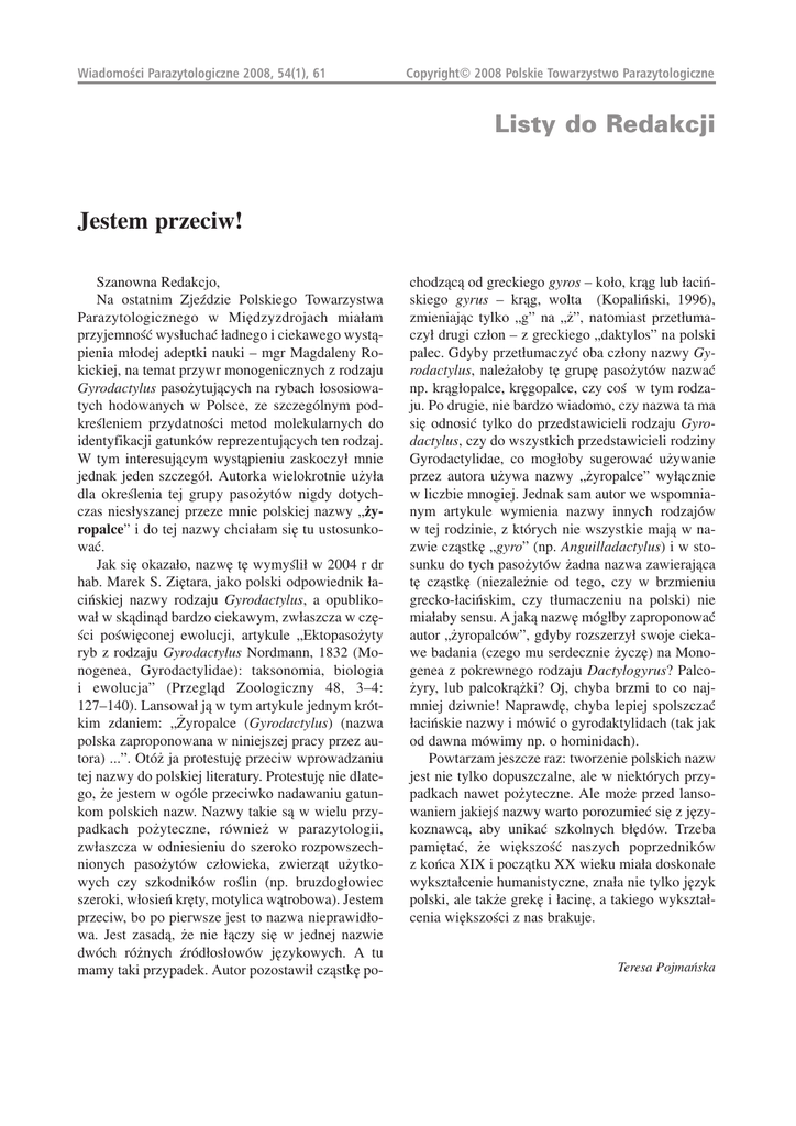 Wiadomoœci Parazytologiczne 2008, 54(1), 61 Copyright© 2008 Polskie Towarzystwo Parazytologiczne Listy do Redakcji Jestem przeciw! Szanowna Redakcjo, Na ostatnim Zjeździe Polskiego Towarzystwa Parazytologicznego w Międzyzdrojach miałam przyjemność wysłuchać ładnego i ciekawego wystą− pienia młodej adeptki nauki – mgr Magdaleny Ro− kickiej, na temat przywr monogenicznych z rodzaju Gyrodactylus pasożytujących na rybach łososiowa− tych hodowanych w Polsce, ze szczególnym pod− kreśleniem przydatności metod molekularnych do identyfikacji gatunków reprezentujących ten rodzaj. W tym interesującym wystąpieniu zaskoczył mnie jednak jeden szczegół. Autorka wielokrotnie użyła dla określenia tej grupy pasożytów nigdy dotych− czas niesłyszanej przeze mnie polskiej nazwy „ży− ropalce” i do tej nazwy chciałam się tu ustosunko− wać. Jak się okazało, nazwę tę wymyślił w 2004 r dr hab. Marek S. Ziętara, jako polski odpowiednik ła− cińskiej nazwy rodzaju Gyrodactylus, a opubliko− wał w skądinąd bardzo ciekawym, zwłaszcza w czę− ści poświęconej ewolucji, artykule „Ektopasożyty ryb z rodzaju Gyrodactylus Nordmann, 1832 (Mo− nogenea, Gyrodactylidae): taksonomia, biologia i ewolucja” (Przegląd Zoologiczny 48, 3–4: 127–140). Lansował ją w tym artykule jednym krót− kim zdaniem: „Żyropalce (Gyrodactylus) (nazwa polska zaproponowana w niniejszej pracy przez au− tora) ...”. Otóż ja protestuję przeciw wprowadzaniu tej nazwy do polskiej literatury. Protestuję nie dlate− go, że jestem w ogóle przeciwko nadawaniu gatun− kom polskich nazw. Nazwy takie są w wielu przy− padkach pożyteczne, również w parazytologii, zwłaszcza w odniesieniu do szeroko rozpowszech− nionych pasożytów człowieka, zwierząt użytko− wych czy szkodników roślin (np. bruzdogłowiec szeroki, włosień kręty, motylica wątrobowa). Jestem przeciw, bo po pierwsze jest to nazwa nieprawidło− wa. Jest zasadą, że nie łączy się w jednej nazwie dwóch różnych źródłosłowów językowych. A tu mamy taki przypadek. Autor pozostawił cząstkę po− chodzącą od greckiego gyros – koło, krąg lub łaciń− skiego gyrus – krąg, wolta (Kopaliński, 1996), zmieniając tylko „g” na „ż”, natomiast przetłuma− czył drugi człon – z greckiego „daktylos” na polski palec. Gdyby przetłumaczyć oba człony nazwy Gy− rodactylus, należałoby tę grupę pasożytów nazwać np. krągłopalce, kręgopalce, czy coś w tym rodza− ju. Po drugie, nie bardzo wiadomo, czy nazwa ta ma się odnosić tylko do przedstawicieli rodzaju Gyro− dactylus, czy do wszystkich przedstawicieli rodziny Gyrodactylidae, co mogłoby sugerować używanie przez autora używa nazwy „żyropalce” wyłącznie w liczbie mnogiej. Jednak sam autor we wspomnia− nym artykule wymienia nazwy innych rodzajów w tej rodzinie, z których nie wszystkie mają w na− zwie cząstkę „gyro” (np. Anguilladactylus) i w sto− sunku do tych pasożytów żadna nazwa zawierająca tę cząstkę (niezależnie od tego, czy w brzmieniu grecko−łacińskim, czy tłumaczeniu na polski) nie miałaby sensu. A jaką nazwę mógłby zaproponować autor „żyropalców”, gdyby rozszerzył swoje cieka− we badania (czego mu serdecznie życzę) na Mono− genea z pokrewnego rodzaju Dactylogyrus? Palco− żyry, lub palcokrążki? Oj, chyba brzmi to co naj− mniej dziwnie! Naprawdę, chyba lepiej spolszczać łacińskie nazwy i mówić o gyrodaktylidach (tak jak od dawna mówimy np. o hominidach). Powtarzam jeszcze raz: tworzenie polskich nazw jest nie tylko dopuszczalne, ale w niektórych przy− padkach nawet pożyteczne. Ale może przed lanso− waniem jakiejś nazwy warto porozumieć się z języ− koznawcą, aby unikać szkolnych błędów. Trzeba pamiętać, że większość naszych poprzedników z końca XIX i początku XX wieku miała doskonałe wykształcenie humanistyczne, znała nie tylko język polski, ale także grekę i łacinę, a takiego wykształ− cenia większości z nas brakuje. Teresa Pojmańska