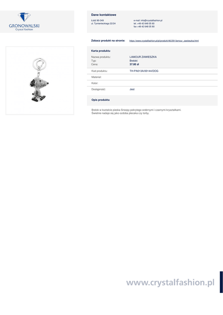 Powered by TCPDF (www.tcpdf.org) Dane kontaktowe Łódź 90-349 ul. Tymienieckiego 22/24 Zobacz produkt na stronie: e-mail: [email protected] tel. +48 42 648 05 60 fax +48 42 648 05 80 https://www.crystalfashion.pl/pl/produkt/46/291/lamour_zawieszka.html Karta produktu Nazwa produktu: Typ: Cena: LAMOUR ZAWIESZKA Breloki 37.00 zł Kod produktu: TH-PA013A/00144/DOG Materiał: Kolor: Dostępność: Jest Opis produktu Brelok w kształcie pieska Snoopy pokrytego srebrnymi i czarnymi kryształkami. Świetnie nadaje się jako ozdoba plecaka czy torby.