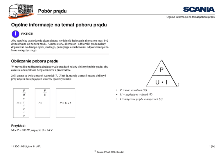 Pobór prądu Ogólne informacje na temat poboru prądu Ogólne informacje na temat poboru prądu VIKTIGT! Aby zapobiec uszkodzeniu akumulatora, wydajność ładowania alternatora musi być dostosowana do poboru prądu. Akumulatory, alternator i odbiorniki prądu należy dopasować do danego cyklu jezdnego, pamiętając o zachowaniu odpowiedniego bilansu energetycznego. Obliczanie poboru prądu W przypadku podłączania dodatkowych urządzeń należy obliczyć pobór prądu, aby określić obciążalność bezpieczników i przewodów. Jeśli znane są dwie z trzech wartości (P, U lub I), trzecią wartość można obliczyć przy użyciu następujących wzorów (patrz rysunek): P W e U= j ś c i e P U I= U • P = moc w watach (W) • U = napięcie w woltach (V) • I = natężenie prądu w amperach (A) I 315 936 P P=UxI Przykład: Moc P = 200 W, napięcie U = 24 V 11:30-01/02 Utgåva 8 pl-PL 1 (14) © Scania CV AB 2016, Sweden Pobór prądu Ogólne informacje na temat poboru prądu I= 200 W => I = 8,3 A 24 V 11:30-01/02 Utgåva 8 pl-PL 2 (14) © Scania CV AB 2016, Sweden Pobór prądu Alternator Alternator Zapotrzebowanie na ładowanie z alternatora różni się w zależności od cyklu jazdy. • Częste uruchamianie silnika i długie okresy pracy na biegu jałowym powodują zmniejszenie skuteczności ładowania, w porównaniu z dłuższymi odcinkami jazdy. • Prąd pobrany z akumulatorów musi zostać uzupełniony w ciągu około 24 godzin. • Gdy pojazd jest eksploatowany w niskich temperaturach otoczenia, zdolność ładowania akumulatorów jest znacznie niższa niż przy wyższych temperaturach. Alternator wytwarza mniej prądu przy niskich prędkościach obrotowych silnika. Prąd ładowania znacznie wzrasta po zwiększeniu prędkości obrotowej silnika z 500 obr./min (prędkość obrotowa biegu jałowego) do 600 obr./min. Patrz przykład w tabeli poniżej. Podane wartości dotyczą temperatury pokojowej. Gdy alternator jest gorący, ok. 80ºC, prąd ładowania jest mniejszy o ok. 10%. Poniższa tabela przedstawia 4 przykłady alternatorów. Prędkość obrotowa silnika 500 obr./min 600 obr./min 700 obr./min 800 obr./min 1000 obr./min 1200 obr./min 1600 obr./min Bosch Prestolite 80 A 100 A 150 A 150 A 100 A 36 A 48 A 56 A 62 A 70 A 75 A 80 A 77 A 87 A 100 A 107 A 118 A 124 A 132 A 52 A 66 A 74 A 80 A 90 A 97 A 100 A 40 A 62 A 74 A 80 A 88 A 94 A 100 A 87 A 124 A 137 A 145 A 155 A 162 A 167 A Melco 11:30-01/02 Utgåva 8 pl-PL 3 (14) © Scania CV AB 2016, Sweden Pobór prądu Alternator Zmienna prędkość obrotowa biegu jałowego Funkcja zmiennej prędkości obrotowej biegu jałowego ma na celu zapewnienie wystarczającego prądu ładowania akumulatorów przez cały czas. Można to osiągnąć poprzez zwiększenie prędkości obrotowej biegu jałowego do maksymalnie 640 obr./ min. Funkcję można wyłączyć za pośrednictwem SDP3 (Scania Diagnos & Programmer 3), jeśli wyposażenie zabudowy pojazdu wymaga stałej prędkości obrotowej silnika w zakresie obsługiwanym przez tę funkcję (do 640 obr./min). Funkcja jest dostępna w pojazdach z ręczną skrzynią biegów o następujących numerach seryjnych podwozia: Funkcja jest dostępna w pojazdach z automatyczną skrzynią biegów Allison o następujących numerach seryjnych podwozia: Data produkcji pojazdu Miejsce produkcji Data produkcji pojazdu Miejsce produkcji Södertälje Zwolle Angers Numer seryjny podwozia 24.08.2006 2 019 338 5 153 303 9 112 570 - Södertälje Zwolle Angers Numer seryjny podwozia 24.01.2007 2 023 609 5 166 343 9 117 160 - Obs! • Funkcja będzie włączać się częściej, jeśli moc alternatora jest zbyt mała dla pojazdu. W związku z tym, dobierając wielkość alternatora należy zawsze brać pod uwagę pobór prądu i typ cyklu jezdnego. • Jeśli wyposażenie nadwozia pojazdu zużywa dużo prądu, zakres roboczy powinien wynosić powyżej 640 obr./min, aby kompensować mniejszy prąd ładowania z alternatora przy niskiej prędkości obrotowej silnika. 11:30-01/02 Utgåva 8 pl-PL 4 (14) © Scania CV AB 2016, Sweden Pobór prądu Alternator Adaptacyjne ładowanie akumulatora Funkcję adaptacyjnego ładowania akumulatora może monitorować tylko kierowca i jest ona dostępna wyłącznie w pojazdach o następujących numerach seryjnych podwozia: Data produkcji pojazdu Miejsce produkcji Södertälje Zwolle Angers Numer seryjny podwozia 23.10.2007 2 031 571 5 188 732 9 125 979 - Działanie tej funkcji można włączyć lub wyłączyć za pomocą SDP3. Dzięki funkcji adaptacyjnego ładowania akumulatora napięcie ładowania będzie się zmieniać zależnie od temperatury akumulatora. Wartość ta może zmieniać się w zakresie od 26 V do 30 V. Napięcie ładowania wynosi zazwyczaj 28,3 V. Przy niskich temperaturach akumulatora, do optymalnego ładowania akumulatorów potrzebne jest wyższe napięcie ładowania. Przy wysokich temperaturach akumulatora, do optymalnego ładowania potrzebne jest niższe napięcie ładowania. Ponadto przy niższym napięciu ładowania elektrolit paruje w mniejszym zakresie. Funkcja ta jest najbardziej przydatna, gdy panuje bardzo niska lub bardzo wysoka temperatura względnie w warunkach eksploatacji powodujących naprzemienne silne rozładowywanie i ładowanie akumulatorów. Ponadto funkcja ta szybciej doładowuje akumulatory, gdy układ elektryczny był używany przy wyłączonym silniku. 11:30-01/02 Utgåva 8 pl-PL 5 (14) © Scania CV AB 2016, Sweden Pobór prądu Alternator Wydajność ładowania alternatora Alternator musi zapewnić prąd ładowania wystarczający zarówno do zasilenia odbiorników prądu, jak i ładowania akumulatorów. W sytuacji optymalnej, prąd ładowania powinien być wystarczający, by nie było potrzeby poboru prądu z akumulatorów, gdy silnik pracuje. Pojemność alternatora powinna być odpowiednia do zapotrzebowania odbiorników prądu, a także posiadać pewną rezerwę dla ładowania akumulatora. Od alternatora wymaga się zapewnienia nast