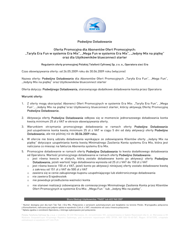 Podwójne Doładowanie Oferta Promocyjna dla Abonentów Ofert Promocyjnych: „Taryfa Era Fun w systemie Era Mix”, „Mega Fun w systemie Era Mix”, „Jedyny Mix na piątkę” oraz dla Użytkowników blueconnect starter Regulamin oferty promocyjnej Polskiej Telefonii Cyfrowej Sp. z o. o., Operatora sieci Era Czas obowiązywania oferty: od 26.05.2009 roku do 30.06.2009 roku (włącznie) Nazwa oferty: Podwójne Doładowanie dla Abonentów Ofert Promocyjnych „Taryfa Era Fun”, „Mega Fun”, „Jedyny Mix na piątkę” oraz Użytkowników blueconnect starter Oferta dotyczy: Podwójnego Doładowania, stanowiącego dodatkowe doładowanie konta przez Operatora Warunki oferty: 1. Z oferty mogą skorzystać Abonenci Ofert Promocyjnych w systemie Era Mix: „Taryfa Era Fun”, „Mega Fun”, „Jedyny Mix na piątkę”oraz Użytkownicy blueconnect starter, którzy aktywują Ofertę Promocyjną Podwójne Doładowanie. 2. Aktywacja oferty Podwójne Doładowanie odbywa się w momencie jednorazowego doładowania konta kwotą minimum 25 zł z VAT w okresie obowiązywania oferty. 3. Warunkiem otrzymania promocyjnego doładowania w ramach oferty Podwójne Doładowanie jest uzupełnienie konta kwotą minimum 25 zł z VAT w ciągu 5 dni od daty aktywacji oferty Podwójne Doładowanie, ale nie później niż do 30.06.2009 roku. 4. W ofercie nie biorą udziału doładowania wynikające ze zobowiązania Klientów oferty „Jedyny Mix na piątkę” dotyczące uzupełniania konta kwotą Minimalnego Zasilenia Konta systemu Era Mix, która jest naliczana co miesiąc na fakturze Abonenta systemu Era Mix. 5. Promocyjne doładowanie w ramach oferty Podwójne Doładowanie to kwota dodatkowego doładowania od Operatora. Wartość promocyjnego doładowania w ramach oferty Podwójne Doładowanie: o jest równa kwocie w złotych, którą zostało doładowane konto po aktywacji oferty Podwójne Doładowanie, jeżeli wartość tego doładowania wyniosła od 25 zł z VAT do 150 zł z VAT o jest równa kwocie 150 zł z VAT, jeżeli konto po aktywacji niniejszej oferty zostało doładowane kwotą z zakresu od 151 zł z VAT do 500 zł z VAT o zawiera się w cenie zakupionego kuponu uzupełniającego lub elektronicznego doładowania o nie zawiera Erajednostek o nie powoduje przedłużenia ważności konta o nie stanowi realizacji zobowiązania do comiesięcznego Minimalnego Zasilenia Konta przez Klientów Ofert Promocyjnych w systemie Era Mix: „Mega Fun ” lub „Jedyny Mix na piatkę”. Biuro Obsługi Użytkownika: *96021 lub 602 960 2002 1 Numer dostępny jest dla kart Tak Tak i Era Mix. Połączenie z serwisem automatycznym jest bezpłatne na terenie Polski. W przypadku połączenia z Konsultantem, naliczana jest jedynie opłata w wysokości 2,44 zł. z VAT, niezależnie od czasu trwania połączenia. 2 Opłata zgodna z cennikiem Operatora, z którego wykonywane jest połączenie. Polska Telefonia Cyfrowa Sp. z o.o. z siedzibą: 02-222 Warszawa, Al. Jerozolimskie 181, zarejestrowana w Sądzie Rejonowym dla m. st. Warszawy w XII Wydziale Gospodarczym Krajowego Rejestru Sądowego, pod numerem rejestrowym KRS 29159, NIP 526-10-40-567, Regon: 011417295, o kapitale zakładowym w wysokości 471 mln PLN 6. Promocyjne doładowanie w ramach oferty Podwójne Doładowanie zostanie dodane do konta Klienta w ciągu maksymalnie 5 kolejnych dni kalendarzowych, następujących po dniu w którym klient spełnił warunki jego otrzymania.. W przypadku Klientów korzystających w momencie uzupełnienia konta z Roamingu - opóźnienie w dodaniu nagrody do konta może trwać do 14 dni. 7. W okresie trwania oferty Podwójne Doładowanie Klient może tylko jeden raz otrzymać promocyjne doładowanie. 8. W przypadku, gdy Klient nie doładuje konta w terminie 5 dni od daty aktywacji oferty Podwójne Doładowanie to otrzymanie promocyjnego doładowania Podwójne Doładowanie jest możliwe, jeśli: o nastąpi ponowna aktywacja niniejszej oferty (zgodnie z pkt. 2 regulaminu) oraz o zostanie spełniony warunek otrzymania promocyjnego doładowania w ramach oferty Podwójne Doładowanie (zgodnie z pkt. 3 niniejszego regulaminu). 9. Dodanie do konta Klienta promocyjnego doładowania w ramach oferty Podwójne Doładowanie zostanie potwierdzone SMS’em. 10. Abonent lub Użytkownik potwierdza, że jest mu wiadome, iż nie ma prawa: a. za pomocą Karty SIM wydanej przez Operatora (dalej „Karta SIM”) kierować ruchu z sieci innych Operatorów do sieci Era lub innych sieci telekomunikacyjnych; b. wykorzystywać Karty SIM w urządzeniu realizującym funkcje zakończenia sieci stałej lub działającym na podobnej zasadzie (Fixed Cellular Terminal – FCT), chyba, że jest to dokonywane na podstawie odrębnej umowy zawartej z Operatorem, przewidującej wyraźnie taką możliwość. 11. Abonent lub Użytkownik potwierdza, że jest mu wiadome, że naruszenie któregokolwiek z zakazów, o których mowa powyżej, stanowi dla Operatora podstawę do rozwiązania Umowy o Świadczenie Usług Telekomunikacyjnych ze skutkiem natychmiastowym. 12. W kwestiach nieuregulowanych niniejszym Regulaminem, zastosowanie mają „Załącznik cenowy oferty taryfa Era Fun w systemie Era Mix”, „Załącznik cenowy taryf Nowa Era Mix w systemie Era Mix”, „Załącznik cenowy Usługi dla taryf Nowa Era Mix w systemie Era Mix”, „Cennik blueconnect starter”, „Regulamin doładowań systemu blueconnect starter” oraz postanowienia Regulaminu Świadczenia Usług Telekomunikacyjnych przez Polską Telefonię Cyfrową Sp. z o.o. 13. Operator zastrzega sobie prawo do bez konieczności podawania przyczyn. zakończenia niniejszej oferty w dowolnym terminie, Biuro Obsługi Użytkownika: *96021 lub 602 960 2002 1 Numer dostępny jest dla kart Tak Tak i Era Mix. Połączenie z serwisem automatycznym jest bezpłatne na terenie Polski. W przypadku połączenia z Konsultantem, naliczana jest jedynie opłata w wysokości 2,44 zł. z VAT, niezależnie od czasu trwania po