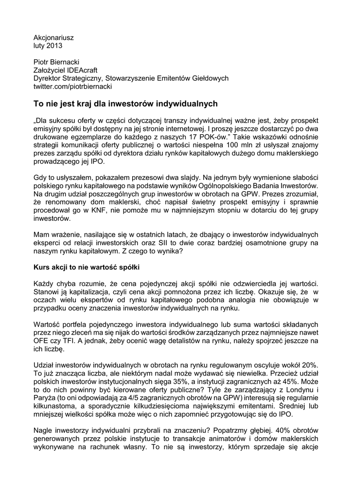 Akcjonariusz luty 2013 Piotr Biernacki Założyciel IDEAcraft Dyrektor Strategiczny, Stowarzyszenie Emitentów Giełdowych twitter.com/piotrbiernacki To nie jest kraj dla inwestorów indywidualnych „Dla sukcesu oferty w części dotyczącej transzy indywidualnej ważne jest, żeby prospekt emisyjny spółki był dostępny na jej stronie internetowej. I proszę jeszcze dostarczyć po dwa drukowane egzemplarze do każdego z naszych 17 POK-ów.” Takie wskazówki odnośnie strategii komunikacji oferty publicznej o wartości niespełna 100 mln zł usłyszał znajomy prezes zarządu spółki od dyrektora działu rynków kapitałowych dużego domu maklerskiego prowadzącego jej IPO. Gdy to usłyszałem, pokazałem prezesowi dwa slajdy. Na jednym były wymienione słabości polskiego rynku kapitałowego na podstawie wyników Ogólnopolskiego Badania Inwestorów. Na drugim udział poszczególnych grup inwestorów w obrotach na GPW. Prezes zrozumiał, że renomowany dom maklerski, choć napisał świetny prospekt emisyjny i sprawnie procedował go w KNF, nie pomoże mu w najmniejszym stopniu w dotarciu do tej grupy inwestorów. Mam wrażenie, nasilające się w ostatnich latach, że dbający o inwestorów indywidualnych eksperci od relacji inwestorskich oraz SII to dwie coraz bardziej osamotnione grupy na naszym rynku kapitałowym. Z czego to wynika? Kurs akcji to nie wartość spółki Każdy chyba rozumie, że cena pojedynczej akcji spółki nie odzwierciedla jej wartości. Stanowi ją kapitalizacja, czyli cena akcji pomnożona przez ich liczbę. Okazuje się, że w oczach wielu ekspertów od rynku kapitałowego podobna analogia nie obowiązuje w przypadku oceny znaczenia inwestorów indywidualnych na rynku. Wartość portfela pojedynczego inwestora indywidualnego lub suma wartości składanych przez niego zleceń ma się nijak do wartości środków zarządzanych przez najmniejsze nawet OFE czy TFI. A jednak, żeby ocenić wagę detalistów na rynku, należy spojrzeć jeszcze na ich liczbę. Udział inwestorów indywidualnych w obrotach na rynku regulowanym oscyluje wokół 20%. To już znacząca liczba, ale niektórym nadal może wydawać się niewielka. Przecież udział polskich inwestorów instytucjonalnych sięga 35%, a instytucji zagranicznych aż 45%. Może to do nich powinny być kierowane oferty publiczne? Tyle że zarządzający z Londynu i Paryża (to oni odpowiadają za 4/5 zagranicznych obrotów na GPW) interesują się regularnie kilkunastoma, a sporadycznie kilkudziesięcioma największymi emitentami. Średniej lub mniejszej wielkości spółka może więc o nich zapomnieć przygotowując się do IPO. Nagle inwestorzy indywidualni przybrali na znaczeniu? Popatrzmy głębiej. 40% obrotów generowanych przez polskie instytucje to transakcje animatorów i domów maklerskich wykonywane na rachunek własny. To nie są inwestorzy, którym sprzedaje się akcje długoterminowo, na przykład w ofercie publicznej. OFE i TFI odpowiadają tymczasem za ok. 45% obrotów polskich instytucji. Zestawiając ze sobą te dane możemy dojść do uproszczonego wniosku, że aktywność polskich inwestorów indywidualnych jest taka sama jak aktywność polskich inwestorów instytucjonalnych. Tymczasem w trakcie oferty publicznej do tych pierwszych kierowane jest zwykle zaledwie kilkanaście procent dostępnych akcji, a ci drudzy są obsługiwani przez cały zarząd spółki w trakcie intensywnego, trwającego często ponad tydzień roadshow. Zazwyczaj brakuje wtedy czasu na chociaż jedną transmisję on-line, nie mówiąc już o spotkaniach grupowych z inwestorami indywidualnymi w kilku regionach Polski i o innych narzędziach, powszechnie stosowanych w Europie Zachodniej i Stanach Zjednoczonych. Kult disclaimerów Rola doradcy prawnego w każdej operacji przeprowadzanej w biznesie jest jasna: ma on zredukować różne rodzaje ryzyka. Jednym z najważniejszych elementów przygotowania do emisji jest dogłębne due dilligence, w wyniku którego powstaje między innymi solidny opis potencjalnych ryzyk umieszczony w prospekcie emisyjnym - to od tej części grubej księgi zaczyna lekturę każdy rozsądny inwestor. Problem pojawia się jednak wtedy, gdy praca nadgorliwego prawnika zaczyna zagrażać powodzeniu całej transakcji. Tak się niestety coraz częściej dzieje, gdy obostrzenia w komunikacji narzucane przez kancelarię powodują, że spółka nie może prowadzić żadnej skutecznej polityki informacyjnej wobec inwestorów. Paraliż komunikacji i działań marketingowych w trakcie oferty prowadzi do zmniejszenia liczby zapisów składanych przez inwestorów indywidualnych, a w konsekwencji do wzmocnienia pozycji instytucji ostro negocjujących na etapie bookbuildingu i do realizacji emisji z wyższym dyskontem. Jest to wprost sprzeczne z interesami spółki emitującej nowe akcje lub akcjonariusza strategicznego sprzedającego udziały. Rozumiem konieczność ograniczenia dostępu do prospektu emisyjnego w internecie bramką ze stosownym oświadczeniem i opatrywanie wszystkich materiałów stosownymi disclaimerami. Nigdy nie zrozumiem jednak zakazu udzielenia przez prezesa wywiadu dla internetowego portalu inwestorskiego (bo „treść wywiadu może być dostępna dla osoby przebywającej na terytorium Stanów Zjednoczonych”) lub nakazu wklejenia do prezentacji spółki dwu- trzyakapitowych dosłownych cytatów z prospektu emisyjnego (bo „prezentacja byłaby niezgodna z prospektem, a wtedy KNF na pewno nakazałaby wstrzymanie oferty publicznej”). Przykazania dla prezesów W sytuacji, gdy domy maklerskie nie dbają o istotną część rynku kapitałowego, a niektóre kancelaria prawne bez żadnego wyczucia biznesowego paraliżują prowadzenie oferty publicznej, jedyna faktyczna władza pozostaje w rękach zarządu spółki. To prezesi zarządów powinni wykazać się rozsądkiem i długoterminowym spojrzeniem, twardo wymagając prowadzenia szerokich i aktywnych działań komunikacyjnych w
