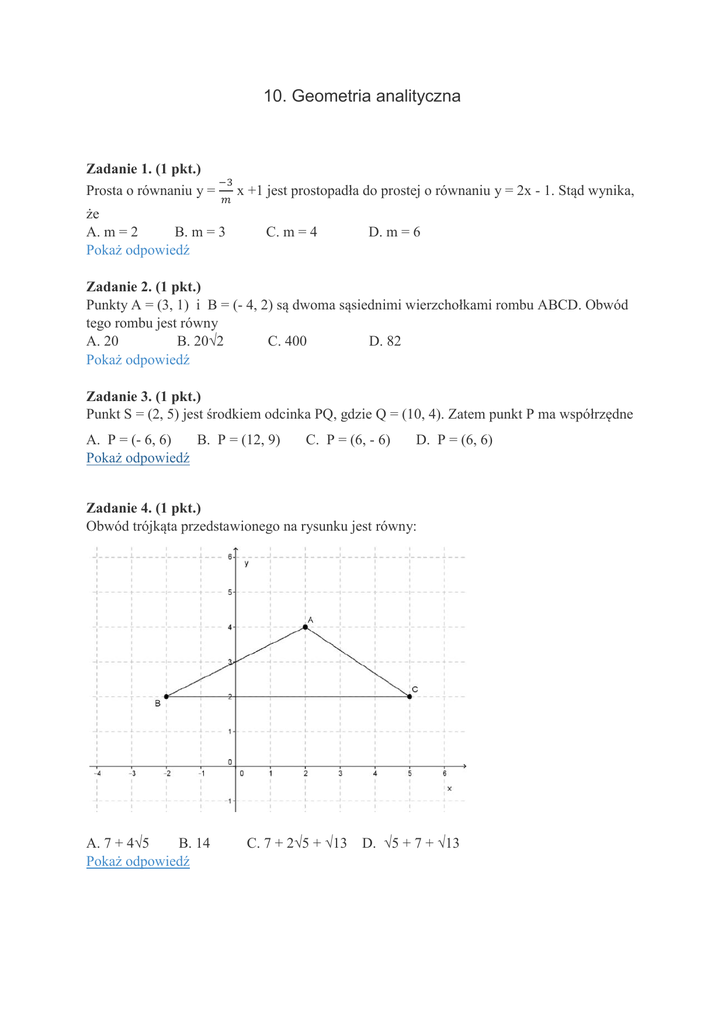10. Geometria analityczna Zadanie 1. (1 pkt.) Prosta o równaniu y = że A. m = 2 B. m = 3 Pokaż odpowiedź x +1 jest prostopadła do prostej o równaniu y = 2x - 1. Stąd wynika, C. m = 4 D. m = 6 Zadanie 2. (1 pkt.) Punkty A = (3, 1) i B = (- 4, 2) są dwoma sąsiednimi wierzchołkami rombu ABCD. Obwód tego rombu jest równy A. 20 B. 20√2 C. 400 D. 82 Pokaż odpowiedź Zadanie 3. (1 pkt.) Punkt S = (2, 5) jest środkiem odcinka PQ, gdzie Q = (10, 4). Zatem punkt P ma współrzędne A. P = (- 6, 6) B. P = (12, 9) Pokaż odpowiedź C. P = (6, - 6) D. P = (6, 6) Zadanie 4. (1 pkt.) Obwód trójkąta przedstawionego na rysunku jest równy: A. 7 + 4√5 B. 14 Pokaż odpowiedź C. 7 + 2√5 + √13 D. √5 + 7 + √13 Zadanie 5. (1 pkt.) Punkty A = (- 3, 1), B = (2, 5 , C = (4, - 1) to kolejne wierzchołki równoległoboku ABCD. Wierzchołek D tego równoległoboku ma współrzędne A. D = (- 1, - 5) B. D = (- 2, - 5) C. D = (- 1, - 6) D. D = (- 2, - 4) Pokaż odpowiedź Zadanie 6. (1 pkt.) Dwoma wierzchołkami trójkąta równobocznego ABC są punkty A = (0, 6) i B = (- 1, 4). Wysokość tego trójkąta jest równa Pokaż odpowiedź Zadanie 7. (1 pkt.) Dane są wierzchołki kwadratu ABCD, gdzie A = (1, 3), B = (4, - 2). Przekątna kwadratu ma długość A. 8 B. 2√17 C. 9 D. 3√17 Pokaż odpowiedź Zadanie 8. (1 pkt.) Początek układu współrzędnych jest jednym z wierzchołków rombu ABCD. Jeżeli przekątna BD rombu zawiera się w prostej o równaniu y = 3x - 2, wówczas przekątna AC rombu zawiera się w prostej o równaniu A. y = 2x B. y = - 3x + 4 C. y = - 2x D. y= x Pokaż odpowiedź Zadanie 9. (1 pkt.) Punktem przecięcia prostych y = 4x + 2 i y = - 2x - 1 jest A. (0,5; 1) B. (2,0) Pokaż odpowiedź C. (- 0,5; 1) D. (- 0,5; 0) Zadanie 10. (1 pkt.) Proste o równaniach (a+2)x – y + 6 = 0 i 3x – y – a = 0 przecinają się w punkcie A = (-8, -26) gdy A. a = 2 B. a = - 2 C. a = 1 D. a = - 1 Pokaż odpowiedź Zadanie 11. (1 pkt.) Prosta przechodząca przez punkty A = (1, 3) i B = (-4, 6) ma równanie Pokaż odpowiedź Zadanie 12. (1 pkt.) Odległość punktu P = (-1, 6) od prostej y = 2x + 3 wynosi A. √7 Pokaż odpowiedź B. √6 C. √5 D. 2 Zadanie 13. (1 pkt.) Odległość stycznej do okręgu od środka S= (2,4) tego okręgu, gdzie punkt P=(5,6) to punkt styczności, jest równa A. √13 B. √11 C. 2√13 D. 2√3 Pokaż odpowiedź Zadanie 14. (1 pkt.) Styczna do okręgu o środku S = (- 2, 3) ma wzór y = 4x - 2. Promień okręgu jest równy Pokaż odpowiedź Zadanie 15. (1 pkt.) Punkt C = (1, 4) jest wierzchołkiem trapezu ABCD. Podstawa AB trapezu zawarta jest w prostej o równaniu y = x + 1. Zatem podstawa CD trapezu zawiera się w prostej o równaniu A. y = x + 4 Pokaż odpowiedź B. y = x + 3 C. y = - x + 3 D. y = 2x + 4 Zadanie 16. (1 pkt.) Kolejnymi wierzchołkami równoległoboku ABCD są punkty A = (-1, 4), B = (2, 2) i C = (3 ,5). Środkiem symetrii równoległoboku jest punkt S o współrzędnych Pokaż odpowiedź Zadanie 17. (1 pkt.) Dwoma przeciwległymi wierzchołkami kwadratu ABCD są punkty A = (4, 5) i C = (-2, 6). Pole tego kwadratu jest równe A. 12,5 B. 8,4 C.16 D.18,5 Pokaż odpowiedź Zadanie 18. (1 pkt.) Odległość punktu A = (a, 3a) od prostej k: y = 2x - 6 jest równa 4 dla a równego A. a = - 4√5 - 6 B. a = 4√5 - 6 C. a = - 4√5 + 6 v a = 4√5 - 6 D. a = 4√5 – 6 v a = - 4√5 - 6 Pokaż odpowiedź Zadanie 19. (1 pkt.) Punkty A = (-1, 4) , B = (1, 3) i C = (2, 5) są kolejnymi wierzchołkami rombu. Wierzchołek D rombu ma współrzędne Pokaż odpowiedź Zadanie 20. (1 pkt.) Prosta m przechodząca przez punkt P = (4, - 8) jest styczna do okręgu o środku S = (1, -4) i promieniu 4. Odległość środka okręgu od prostej jest równa A. 1 B. 2 Pokaż odpowiedź C. 3 D.4 Zadanie 21. (1 pkt.) Prosta y = - √3x + 2 tworzy z osią OX kąt α o mierze A. 600 B.1200 Pokaż odpowiedź C. 300 D.1500 ZADANIA OTWARTE Zadanie 1. (2 pkt.) Punkt A = (1, m) leży na prostej równoległej do prostej o równaniu y = 2x + 5 i przechodzącej przez punkt B = (3, 6). Znajdź wartość parametru m. Pokaż odpowiedź Zadanie 2. (2 pkt.) Prosta k ma współczynnik kierunkowy równy 3 i przechodzi przez punkt o współrzędnych (0, 4). Oblicz w jakim punkcie prosta k przecina oś OX. Podaj interpretację geometryczną zadania. Pokaż odpowiedź Pokaż rysunek Zadanie 3. (2 pkt.) Wyznacz graficznie punkt przecięcia prostych o równaniach y = - 2x + 9 i y = x - 3 i podaj jego współrzędne. Pokaż odpowiedź Pokaż rysunek Zadanie 4. (2 pkt.) Wierzchołki równoległoboku ABCD mają współrzędne A = (1, 2) , B = (3, 6), D = (-4, 3). Znajdź równanie prostej CD. Pokaż odpowiedź Zadanie 5. (3 pkt.) Punkt A = (-1, 3) jest wierzchołkiem trapezu ABCD, którego podstawa CD jest zawarta w prostej o równaniu y = 4x - 2. Wyznacz równanie prostej zawierającej podstawę AB. Pokaż odpowiedź Zadanie 6. (3 pkt.) Wyznacz współrzędne punktu B, który jest symetryczny do punktu A = (5,-1) względem prostej o równaniu 2x+5y-3=0. Pokaż odpowiedź Zadanie 7. (4 pkt.) Oblicz pole i obwód trójkąta o wierzchołkach A = (2, -3), B = (3, 0), C = (-2, 5). Pokaż odpowiedź Zadanie 8. (4 pkt.) Dany jest okrąg o środku S = (1, 2) i promieniu r = 2. Napisz równanie stycznej do tego okręgu przechodzącej przez punkt P = (4, -1). Pokaż odpowiedź Zadanie 9. (4 pkt.) Punkty A = (-1, 2) i B = (3, - 2) są wierzchołkami trójkąta ABC, a punkt M = (1, 3) jest środkiem boku AC. Oblicz współrzędne punktu przecięcia prostej AB z wysokością tego trójkąta, poprowadzoną z wierzchołka C. Pokaż odpowiedź Zadanie 10. (5 pkt.) Dane są wierzchołki czworokąta ABCD A = (1, 1), B = (5, 3), C = (6, 6), D = (0, 7). Oblicz długość przekątnej BD oraz pole trójkąta BCD. Pokaż odpowiedź Zadanie 11. (5 pkt.) Mając dane współrzędne wierzchołków równoległoboku ABCD A = (2, 6), B = (-4, 3) i C = (- 1, 1) znajdź współrzędne punktu D oraz oblicz pole ró