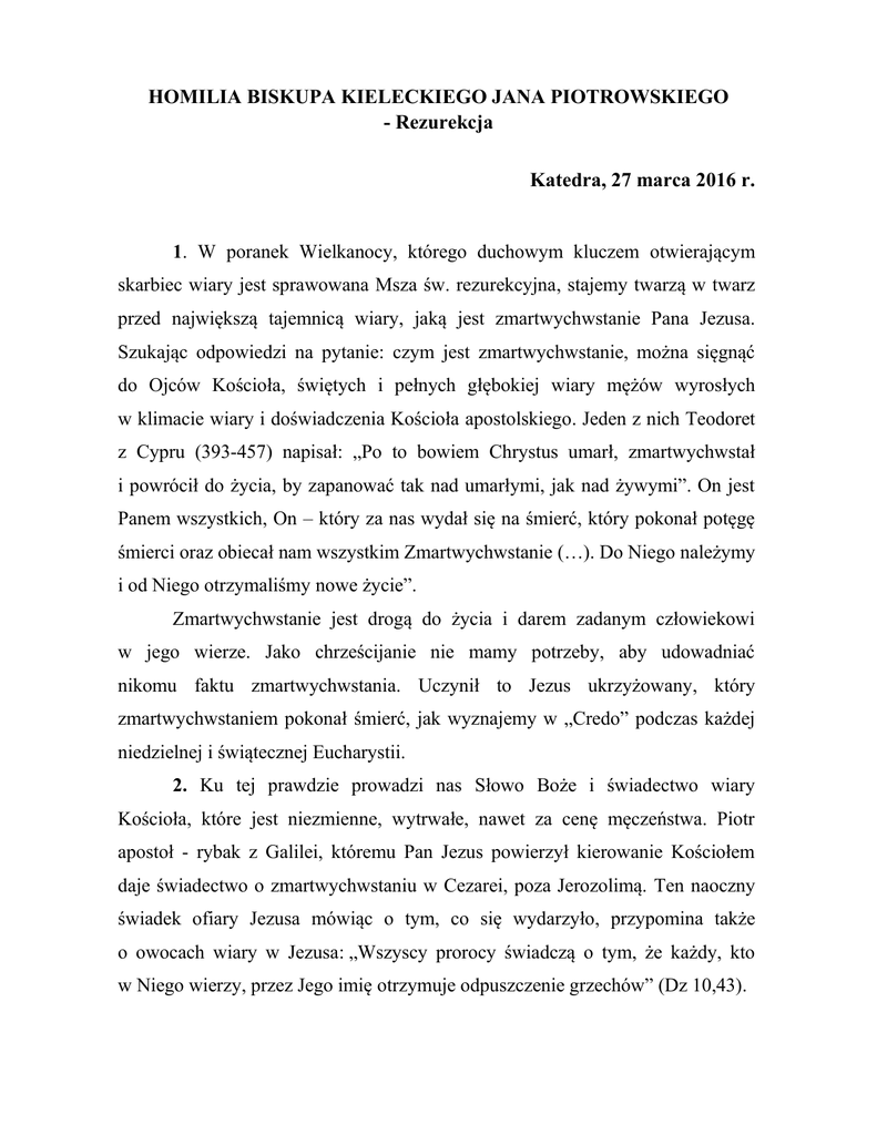 HOMILIA BISKUPA KIELECKIEGO JANA PIOTROWSKIEGO - Rezurekcja Katedra, 27 marca 2016 r. 1. W poranek Wielkanocy, którego duchowym kluczem otwierającym skarbiec wiary jest sprawowana Msza św. rezurekcyjna, stajemy twarzą w twarz przed największą tajemnicą wiary, jaką jest zmartwychwstanie Pana Jezusa. Szukając odpowiedzi na pytanie: czym jest zmartwychwstanie, można sięgnąć do Ojców Kościoła, świętych i pełnych głębokiej wiary mężów wyrosłych w klimacie wiary i doświadczenia Kościoła apostolskiego. Jeden z nich Teodoret z Cypru (393-457) napisał: „Po to bowiem Chrystus umarł, zmartwychwstał i powrócił do życia, by zapanować tak nad umarłymi, jak nad żywymi”. On jest Panem wszystkich, On – który za nas wydał się na śmierć, który pokonał potęgę śmierci oraz obiecał nam wszystkim Zmartwychwstanie (…). Do Niego należymy i od Niego otrzymaliśmy nowe życie”. Zmartwychwstanie jest drogą do życia i darem zadanym człowiekowi w jego wierze. Jako chrześcijanie nie mamy potrzeby, aby udowadniać nikomu faktu zmartwychwstania. Uczynił to Jezus ukrzyżowany, który zmartwychwstaniem pokonał śmierć, jak wyznajemy w „Credo” podczas każdej niedzielnej i świątecznej Eucharystii. 2. Ku tej prawdzie prowadzi nas Słowo Boże i świadectwo wiary Kościoła, które jest niezmienne, wytrwałe, nawet za cenę męczeństwa. Piotr apostoł - rybak z Galilei, któremu Pan Jezus powierzył kierowanie Kościołem daje świadectwo o zmartwychwstaniu w Cezarei, poza Jerozolimą. Ten naoczny świadek ofiary Jezusa mówiąc o tym, co się wydarzyło, przypomina także o owocach wiary w Jezusa: „Wszyscy prorocy świadczą o tym, że każdy, kto w Niego wierzy, przez Jego imię otrzymuje odpuszczenie grzechów” (Dz 10,43). Jezus wydobywa nas więc z duchowej śmierci. Doświadczył tego św. Paweł apostoł i zrozumiał czego potrzebuje każdy człowiek, by przyjąć prawdę o Jezusie. Apostoł w Liście do Kolosan naucza, że w Chrystusie Jezusie jest także nasze powstanie z martwych. W Nim zmierzamy do innej rzeczywistości, jaką jest nowe życie w Bogu, który chce mieć człowieka przy sobie nie skąpiąc mu nawet swojej chwały (por. Kol 3,1-4). Odkrywanie piękna i daru zmartwychwstania jest naszym chrześcijańskim zadaniem na całe życie. Może się zdarzyć, że będziemy, jak Maria Magdalena zagubiona i bliska rozpaczy, biegać bezradni po ogrodzie naszego życia i wraz z nią wołać: „Zabrano Pana z grobu i nie wiemy, gdzie Go położono” (J 20,2). Innym razem możemy być jak Piotr biegnący do pustego grobu albo jak szybki, młodziutki Jan, dla których doświadczenie pustego grobu było wystarczającym dowodem, ponieważ ani jeden ani drugi do tej chwili nie rozumieli Pisma, które nauczało, że On ma powstać z martwych! ( J 20, 1-9). 3. Warto dziś zapytać, z którą z tych osób możemy się utożsamić? Odpowiem: z każdą z nich, jeśli mamy łaskę wiary. Móżmy być Marią Magdaleną, Piotrem i Janem, a nawet uczniami na drodze do Emaus (por. Łk 24, 13-35). Natomiast, jako ochrzczeni na pewno nie możemy być cynicznymi żołnierzami, którym Żydzi dali pieniądze, aby rozpowiadali fałszywe informacje, że w nocy apostołowie wykradli ciało Jezusa (por. Mt 28,11-15). Pan Jezus zmartwychwstały nie jest przeszłością sprzed dwóch tysięcy lat, ale jest obecny z całym swoim życiem pośród nas. Istotnie, jak napisał teolog, Zmartwychwstanie to żywa teraźniejszość, która przy tym nie jest poddana przymusom naszej przestrzeni i naszego czasu (por. G. Lohfink, Przeciw banalizacji Jezusa, s. 269). Niech zatem coraz głębsza wiara, karmiona modlitwą i łaską sakramentów świętych, pokona nasz życiowy sceptycyzm, jak ten apostoła Tomasza, oraz otworzy nas na nadzieję nowego życia, które Bóg daje nam w Jezusie Chrystusie Zmartwychwstałym. Amen.
