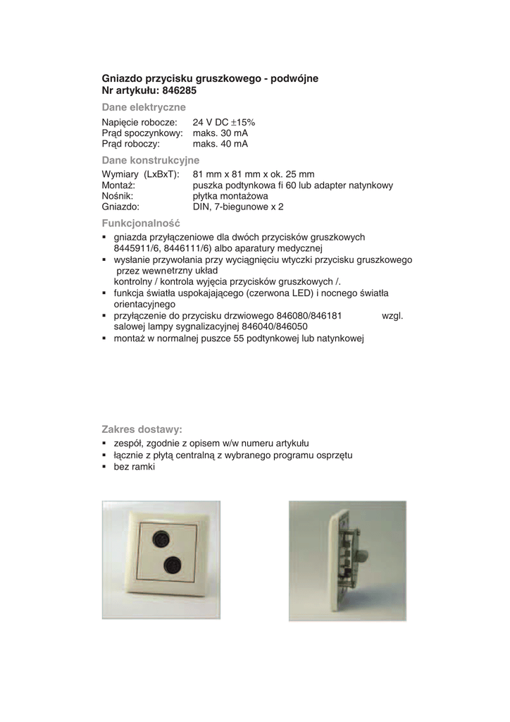 Gniazdo przycisku gruszkowego - podwójne Nr artykułu: 846285 Dane elektryczne Napi cie robocze: Pr d spoczynkowy: Pr d roboczy: 24 V DC ±15% maks. 30 mA maks. 40 mA Dane konstrukcyjne Wymiary (LxBxT): Monta : No nik: Gniazdo: 81 mm x 81 mm x ok. 25 mm puszka podtynkowa fi 60 lub adapter natynkowy płytka monta owa DIN, 7-biegunowe x 2 Funkcjonalno gniazda przył czeniowe dla dwóch przycisków gruszkowych 8445911/6, 8446111/6) albo aparatury medycznej wysłanie przywołania przy wyci gni ciu wtyczki przycisku gruszkowego przez wewn etrzny układ kontrolny / kontrola wyj cia przycisków gruszkowych /. funkcja wiatła uspokajaj cego (czerwona LED) i nocnego wiatła orientacyjnego przył czenie do przycisku drzwiowego 846080/846181 wzgl. salowej lampy sygnalizacyjnej 846040/846050 monta w normalnej puszce 55 podtynkowej lub natynkowej Zakres dostawy: zespół, zgodnie z opisem w/w numeru artykułu ł cznie z płyt centraln z wybranego programu osprz tu bez ramki – pomyłki zmiany i bł dy drukarskie zastrze one
